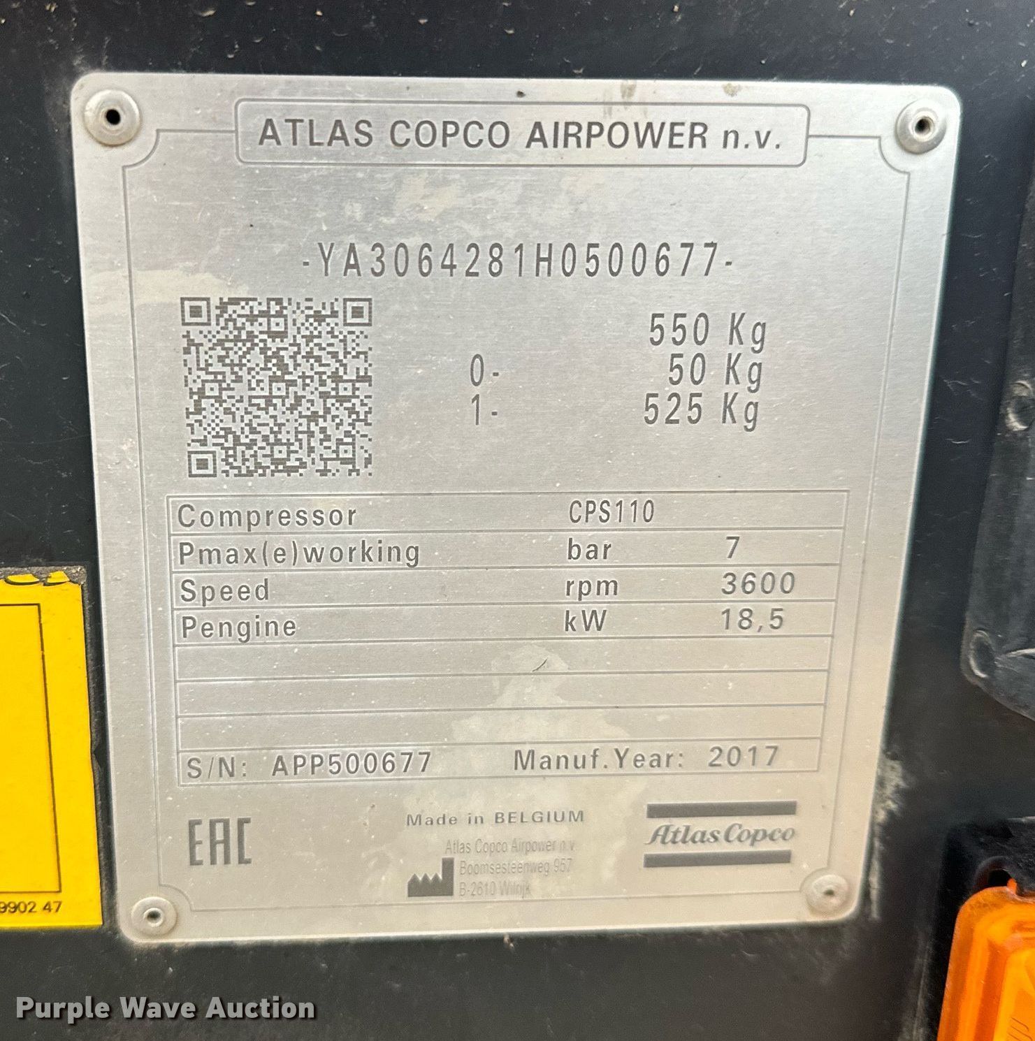 Purple Wave is selling a used Air Compressor in Kansas. This item is a 2017 Atlas Copco CPS110 air compressor with the following: Hours: 515 on meter, Serial: YA3064281H0500677