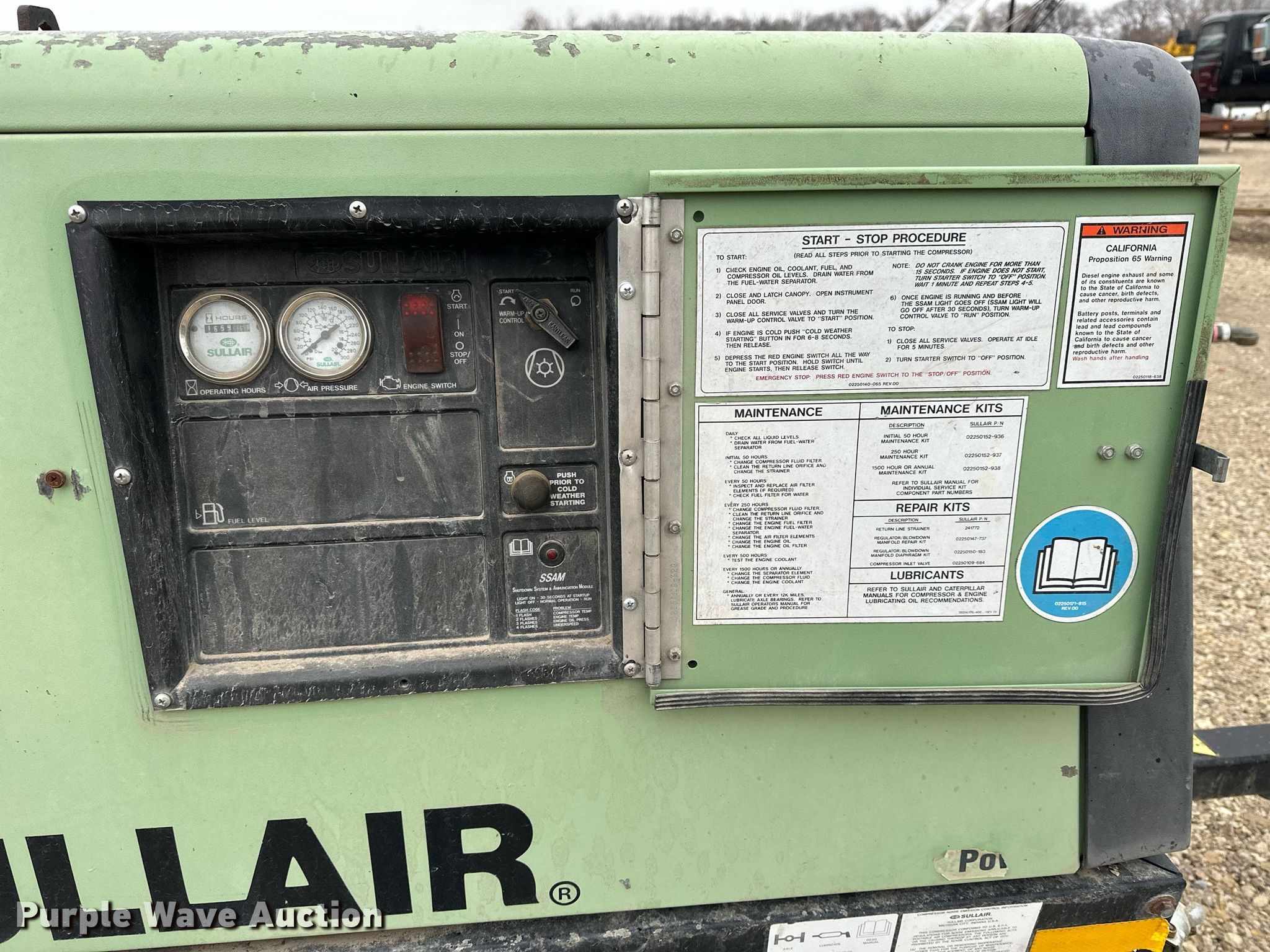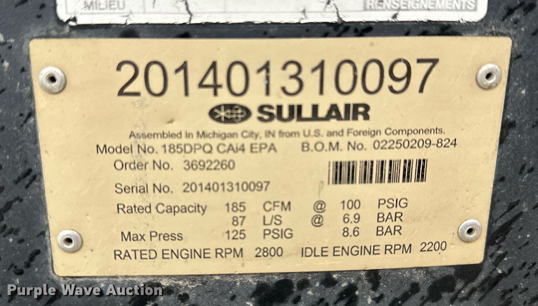 Purple Wave is selling a used Air Compressor in Kansas. This item is a Sullair 185DPQ air compressor with the following: Hours: 1,660 on meter, Serial: 201401310097