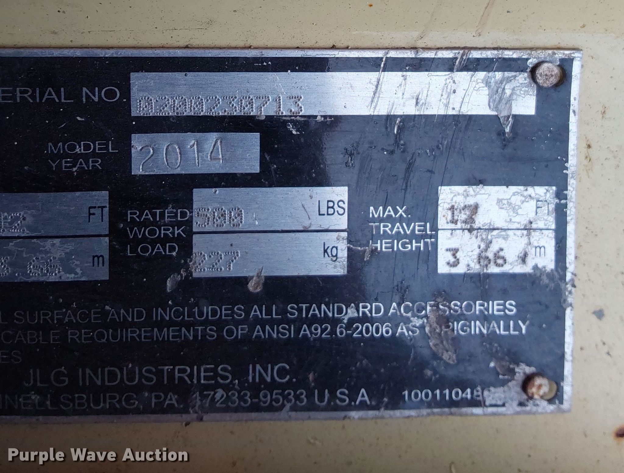 Purple Wave is selling a used Scissor or Vertical Lift in Nebraska. This item is a 2014 JLG 1230ES vertical lift with the following: Hours: 380 on meter, Serial: 0200230713