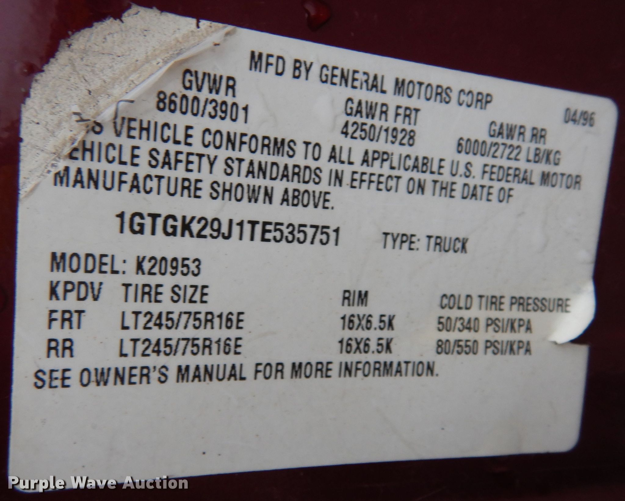 1996 GMC Sierra 2500 Club Cab pickup truck. Miles: 142,495 on odometer, VIN: 1GTGK29J1TE535751. Engine Displacement: 7.4L V8 OHV, Cylinders: 8, Fuel type: Gas. Transmission Automatic, Four wheel drive. Interior AC, Heat, Power windows, Power locks, Cruise control. Tires Size: 245/75R16. Notes Possible engine issues, idles rough, Possible injector issues. Kansas title. Central Heights Unified School District #288Bid. Richmond, KS 66080