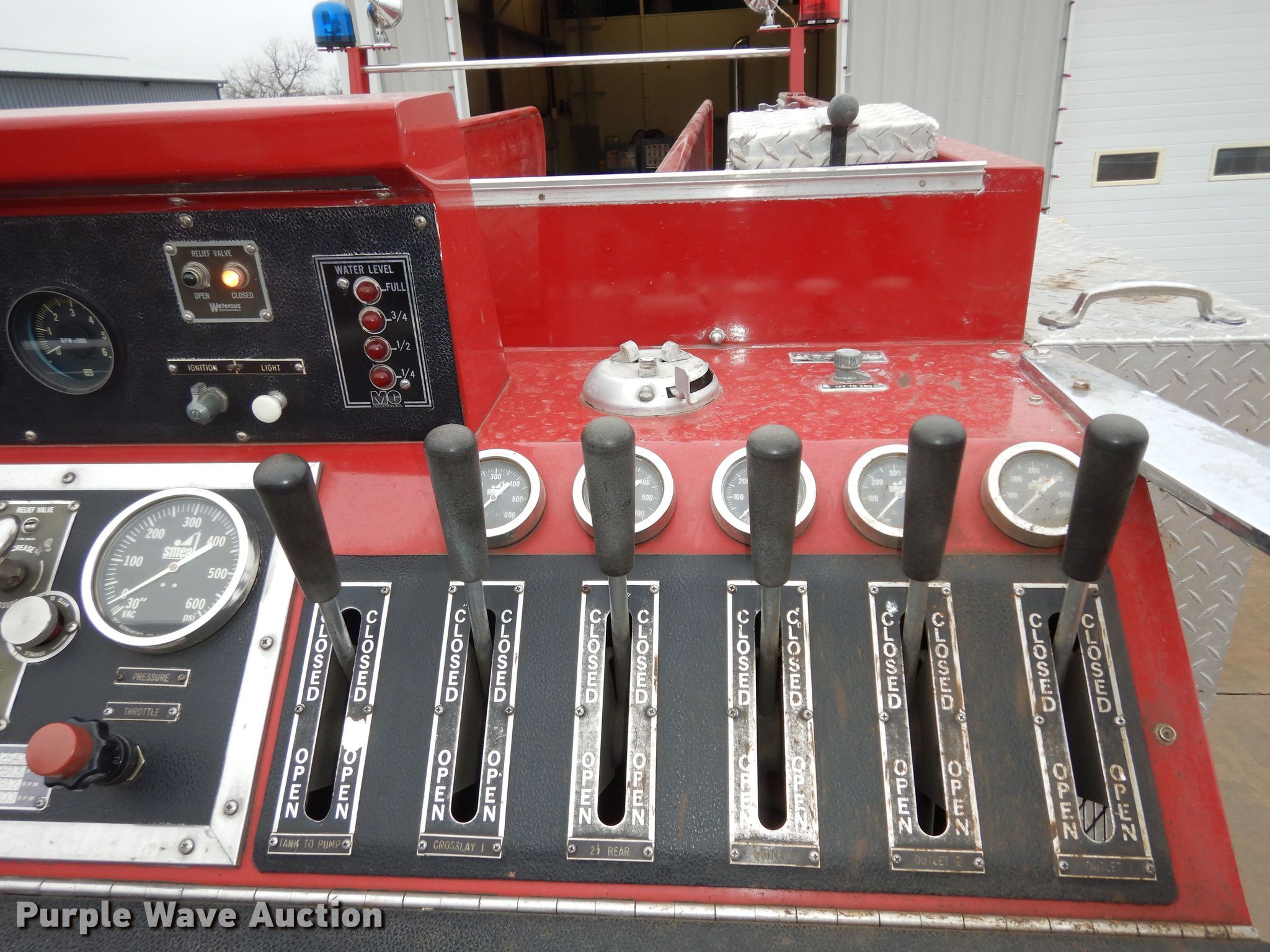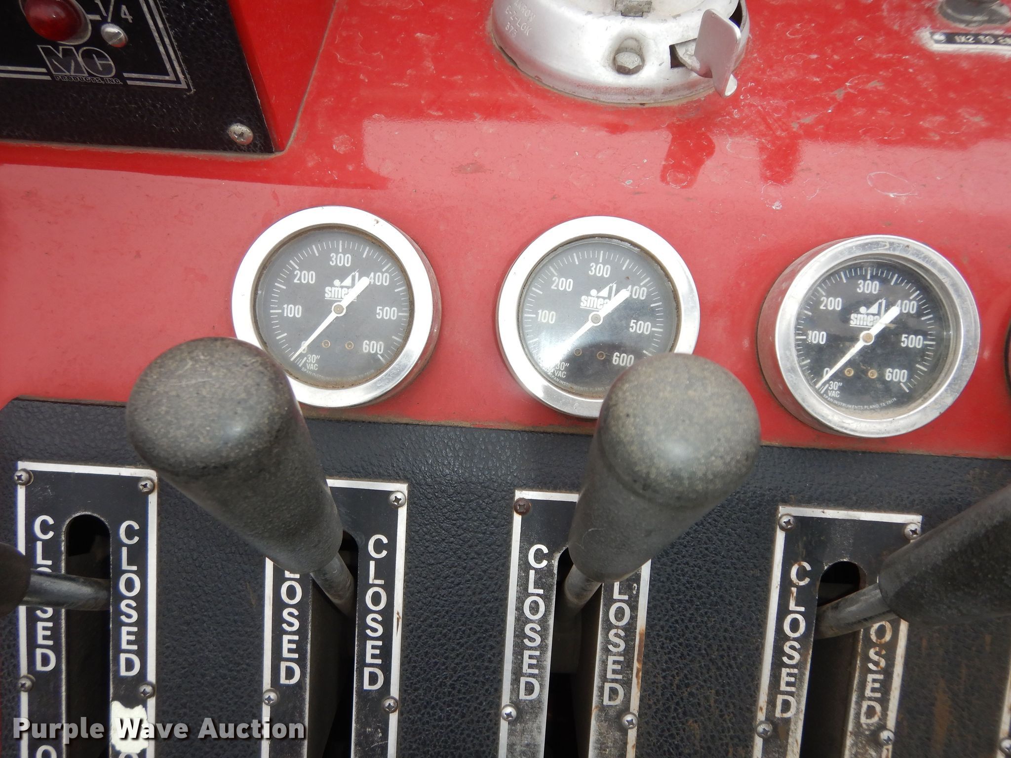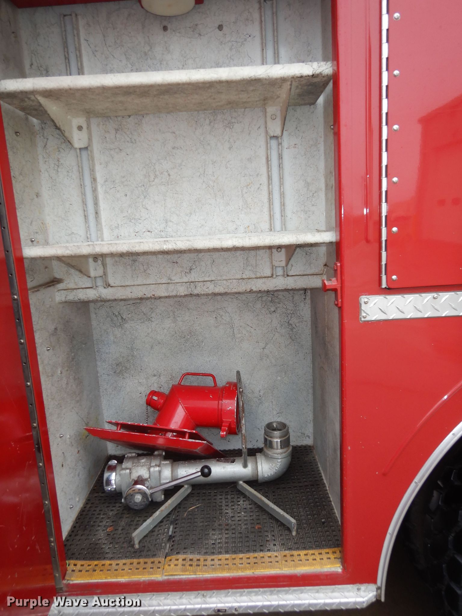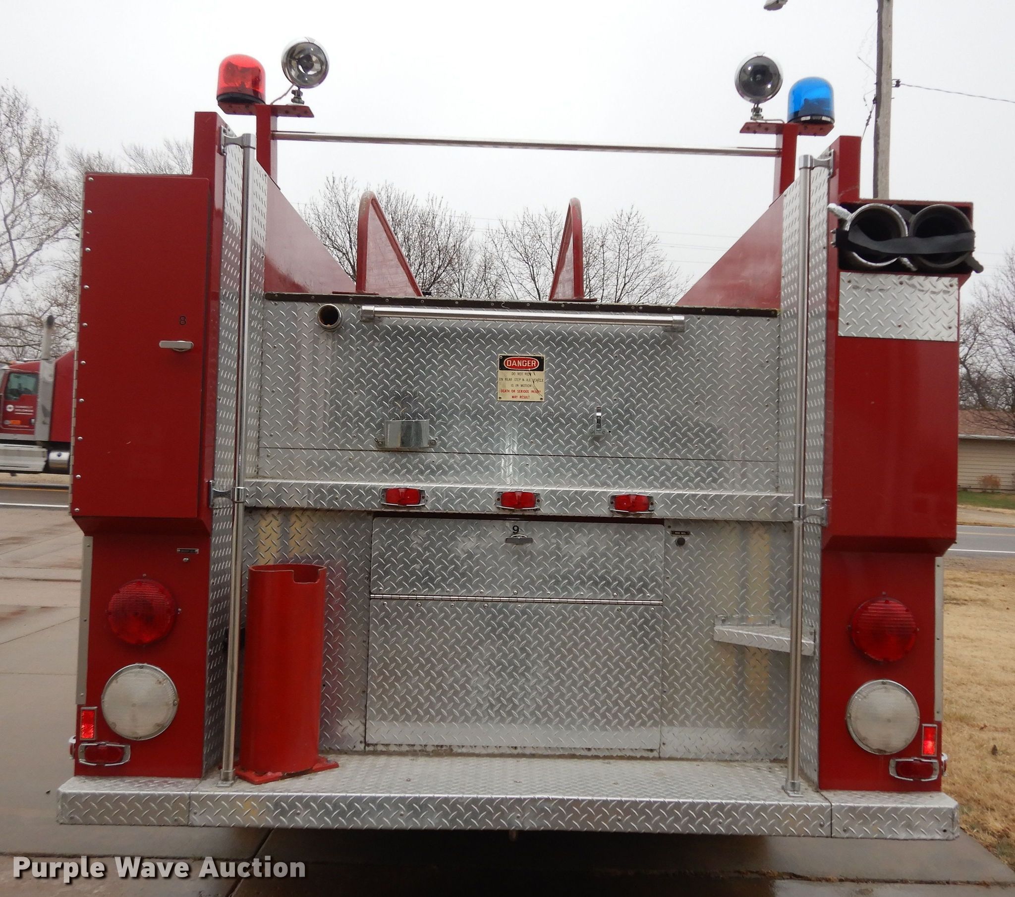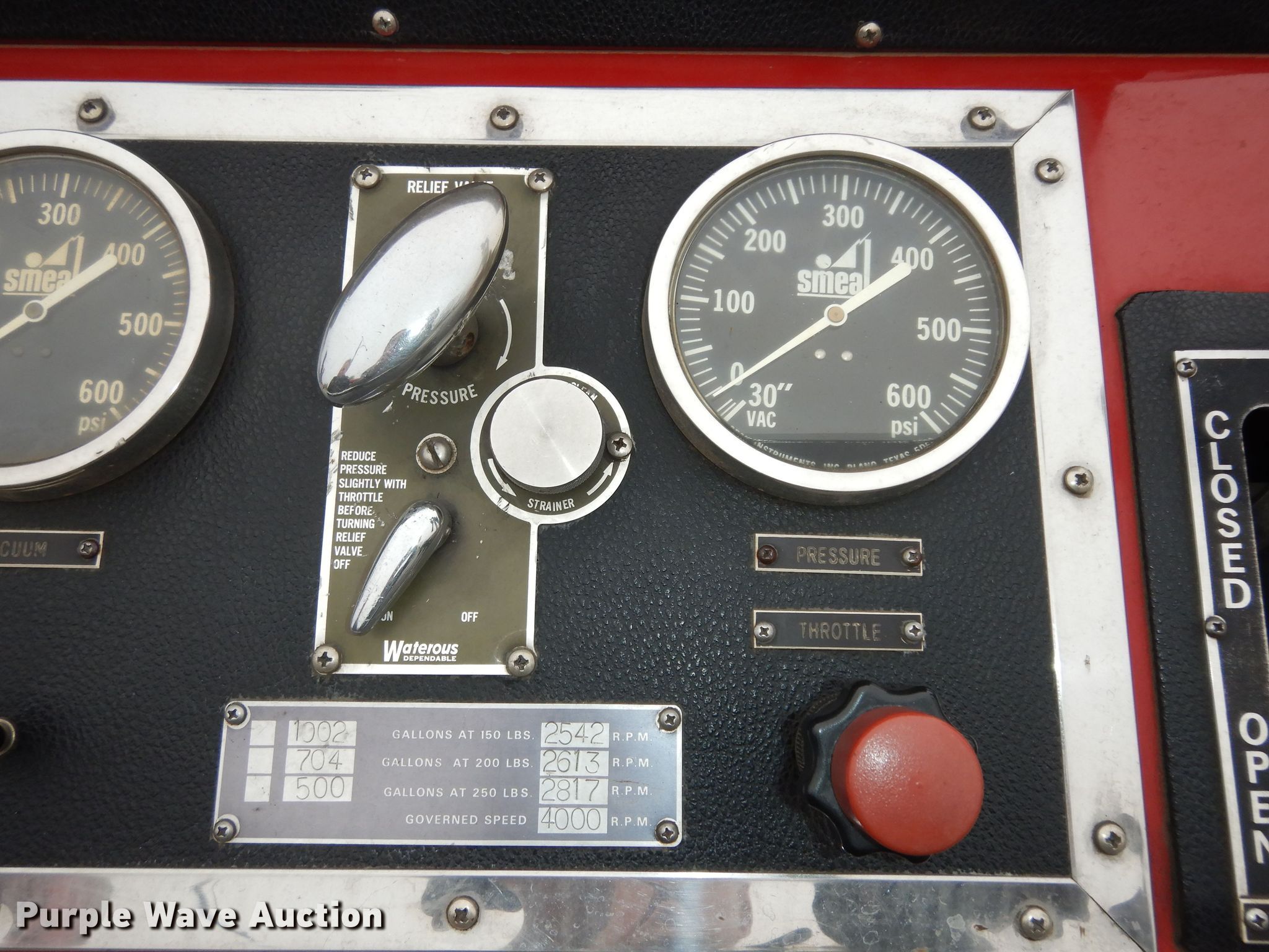 1987 Ford F700 pumper fire truck. Miles: 25,187 on odometer, VIN: 1FDPF70K2HVA21515, Unit #: 612. Engine Displacement: 7.0L, Cylinders: 8, Fuel type: Gas. Transmission Manual, Speed: 5, plus 2. Chassis Axles: Single, Suspension: Spring, Brakes: Hydraulic, GVWR: 30,000 lbs, Wheelbase: 204". Interior AC, Heat. Features Fire truck body Smeal V801, Hours: 939 on meter, Elevated deck gun 1,000 gpm, Pump 1,000 gpm, (2) 10'L suction hoses. Tires Rear: 10.00R20, Brand: Firestone. Notes Exhaust manifold leak, Possible pump issues, 750 gpm capacity at last inspection. Kansas title. Title distribution may be delayed up to 14 days from verification of funds. City of Solomon. Solomon, KS 67480