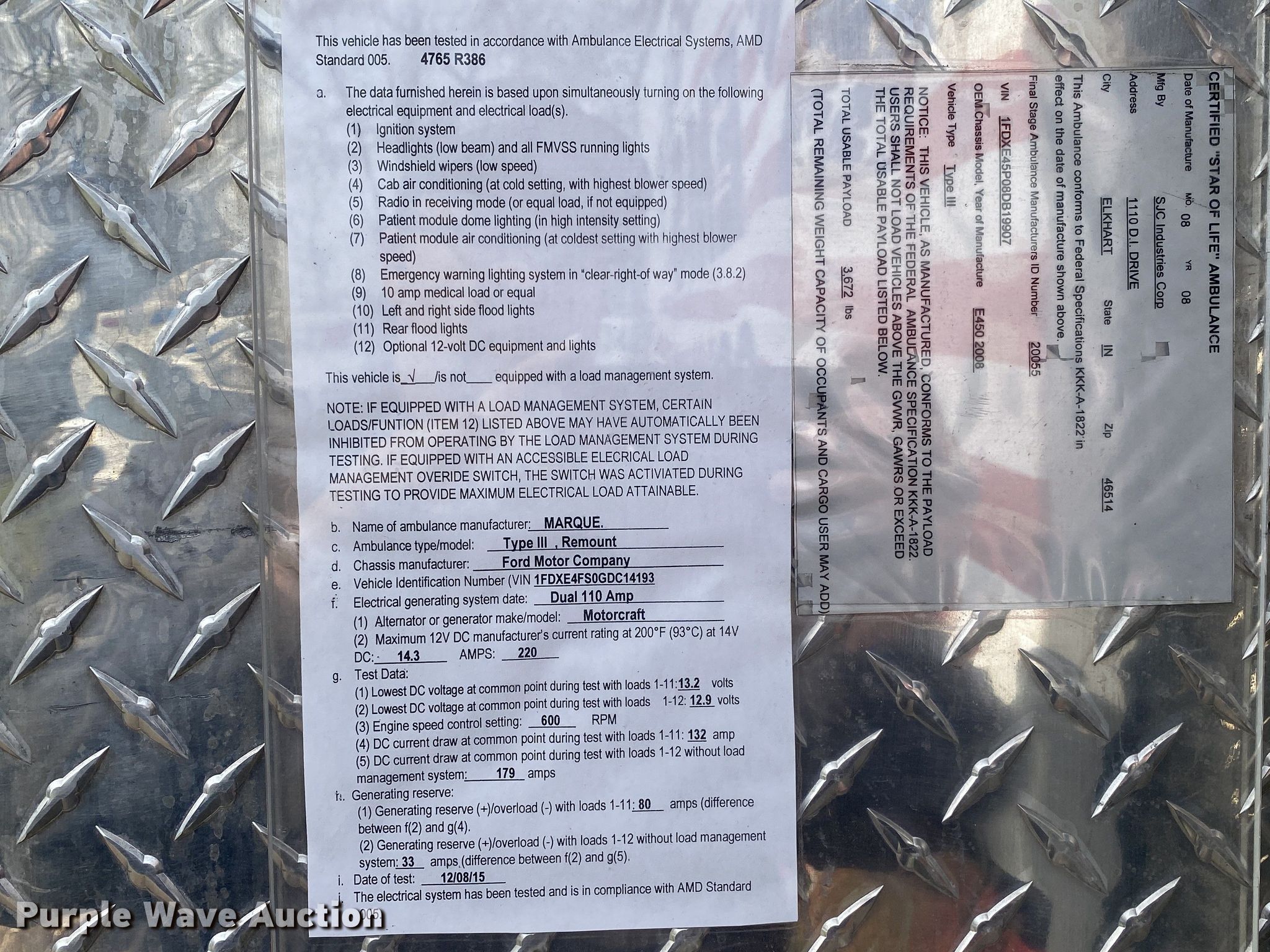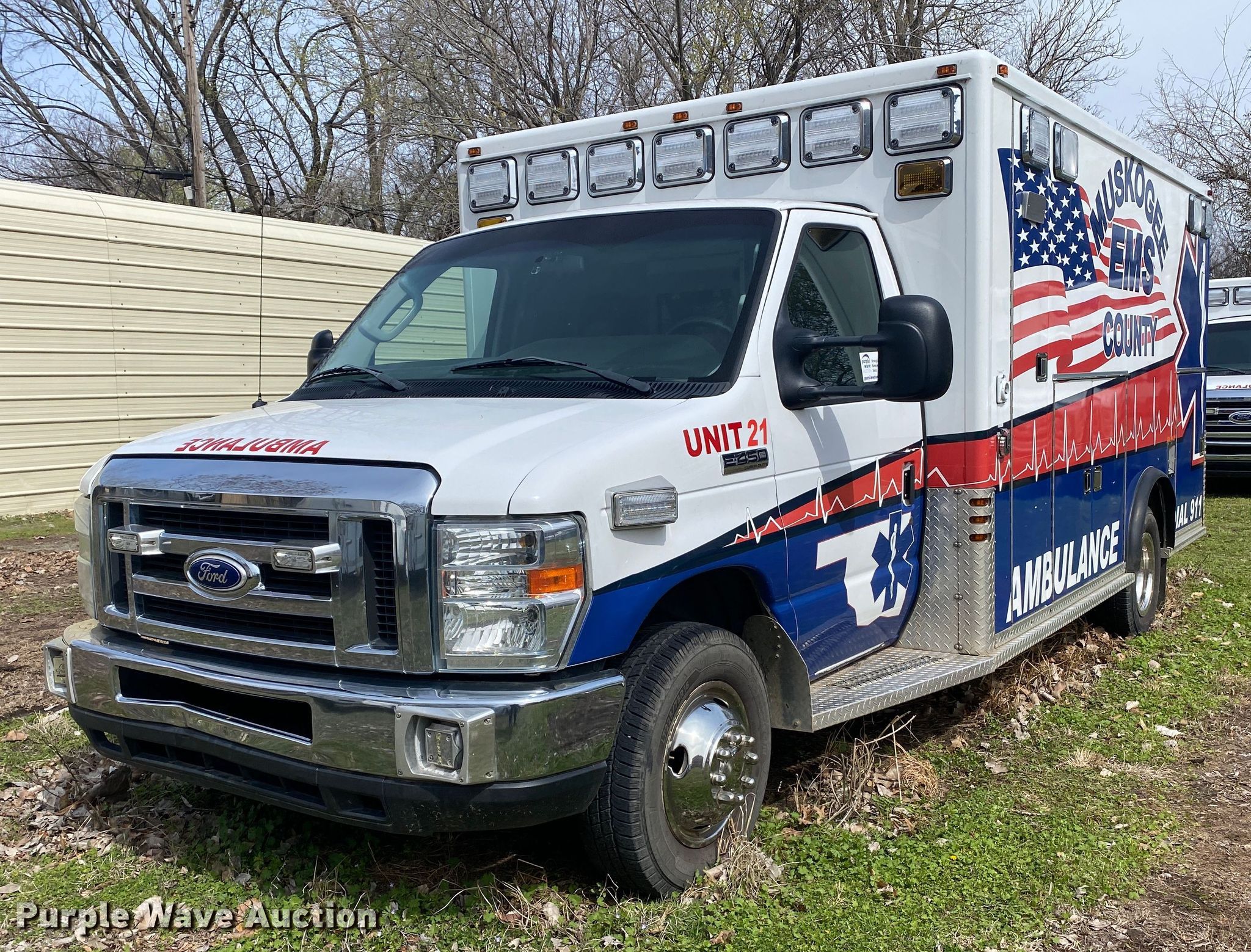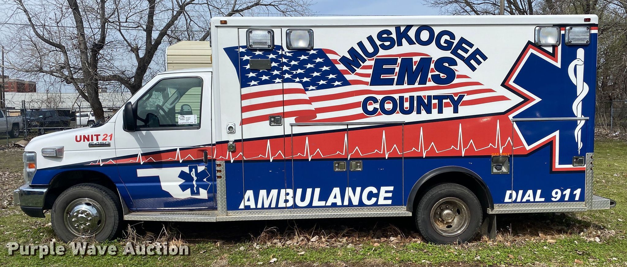 2016 Ford E450 Super Duty ambulance. Miles: 308,437 on odometer, VIN: 1FDXE4FS0GDC14193, Unit #: 21. Engine Displacement: 6.8L, Cylinders: 10, Fuel type: Gas. Transmission Automatic. Chassis Axles: Single, Suspension: Spring, Brakes: Hydraulic, GVWR: 14,500 lbs, Wheelbase: 158". Interior AC, Heat, Power windows, Power locks, Cruise control, Backup camera. Features Ambulance body SJC Industries Star of Life, PA/ siren controls, Oxygen hookups. Tires Size: LT225/75R16. Notes Possible intake manifold issues, County decals will be removed prior to auction. Oklahoma title. Title distribution may be delayed up to 14 days from verification of funds. Muskogee County Emergency Management. 422 North Cherokee Street. Muskogee, OK 74403