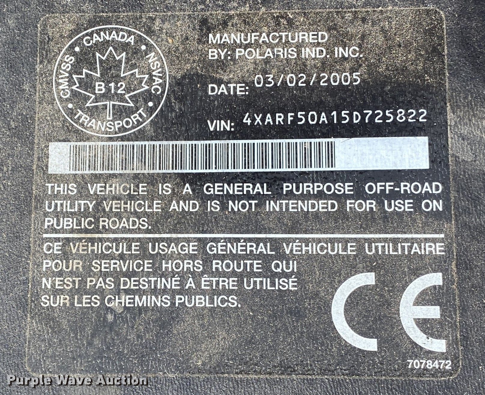 Purple Wave is selling a used Utility Vehicle in Oklahoma. This item is a 2005 Polaris Ranger utility vehicle with the following: Hours: 95 on meter, VIN: 4XARF50A15D725822, Unit #: Mobile 2