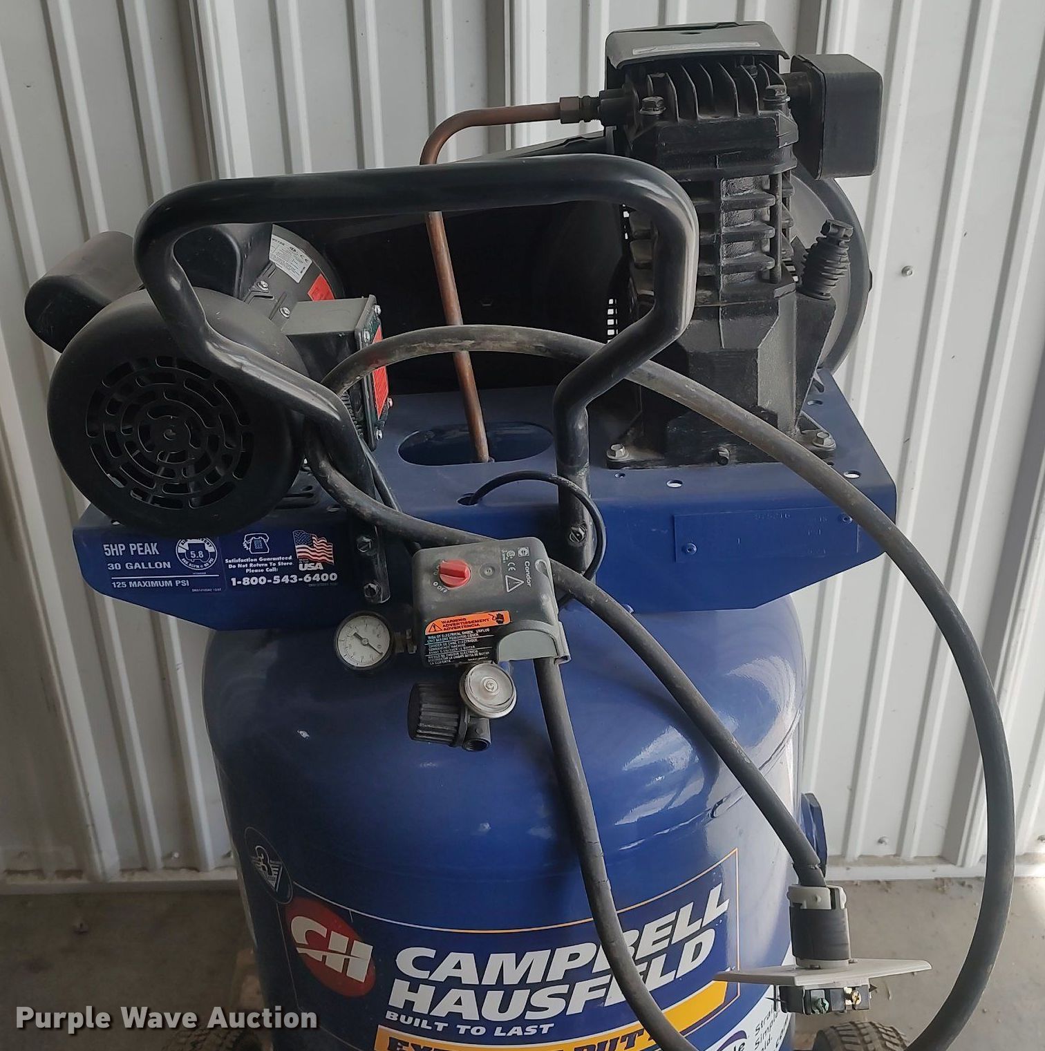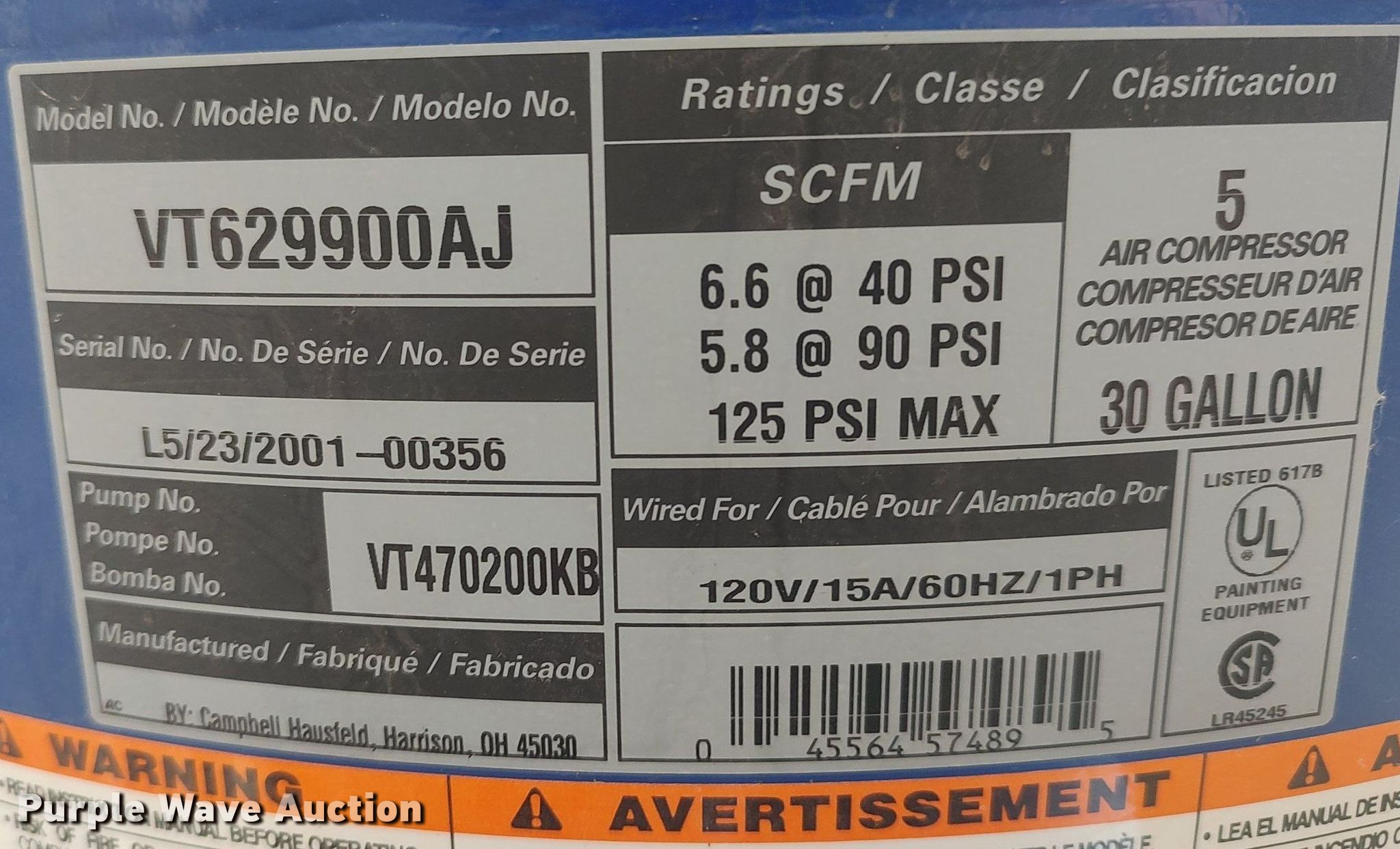 Purple Wave is selling a used Air Compressor in Kansas. This item is a Campbell Haufeld VT629900AJ air compressor with the following: Serial: 00356