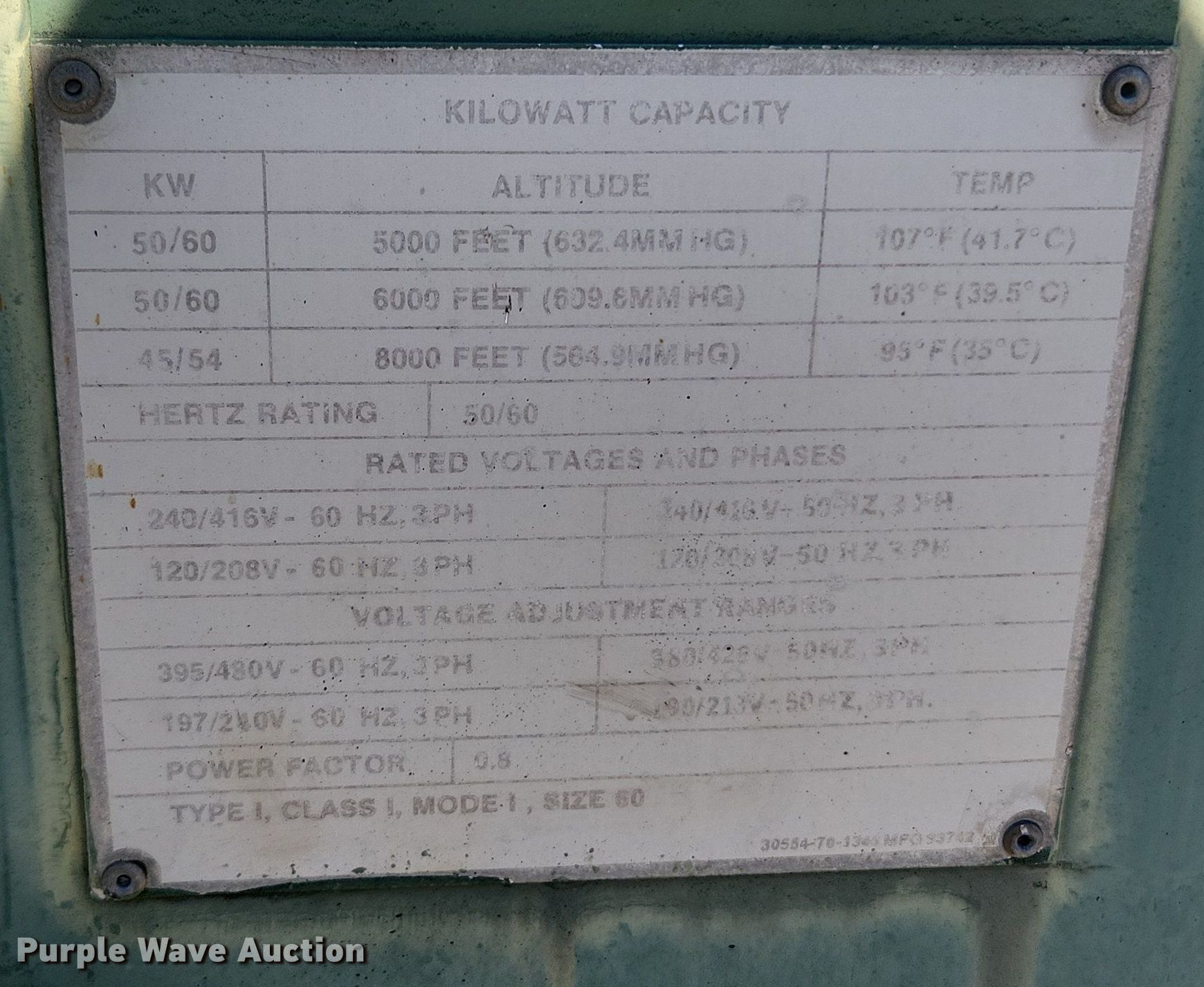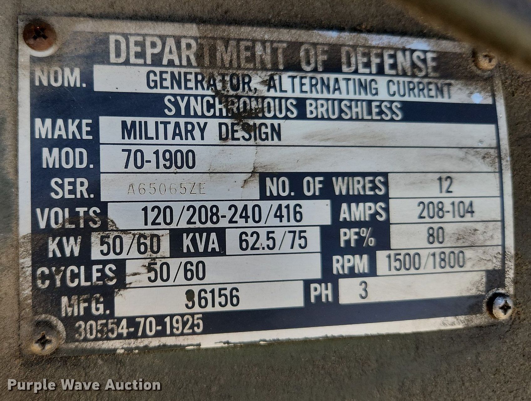 Dynamics Corporation of America MEP008A generator. Hours: 2,664 on meter, Serial: FZ-03630. Engine Allis-Chalmers 3500, Serial: 3D-58502, Cylinders: 6, Fuel type: Diesel. Features Generator Model: 70-1900, kVA: 62.5, kW: 50, Phase: Three, Electric start, Fuel tank, Skid mounted. Notes Heat damage. City of Pacific, MO. Pacific, MO 63069