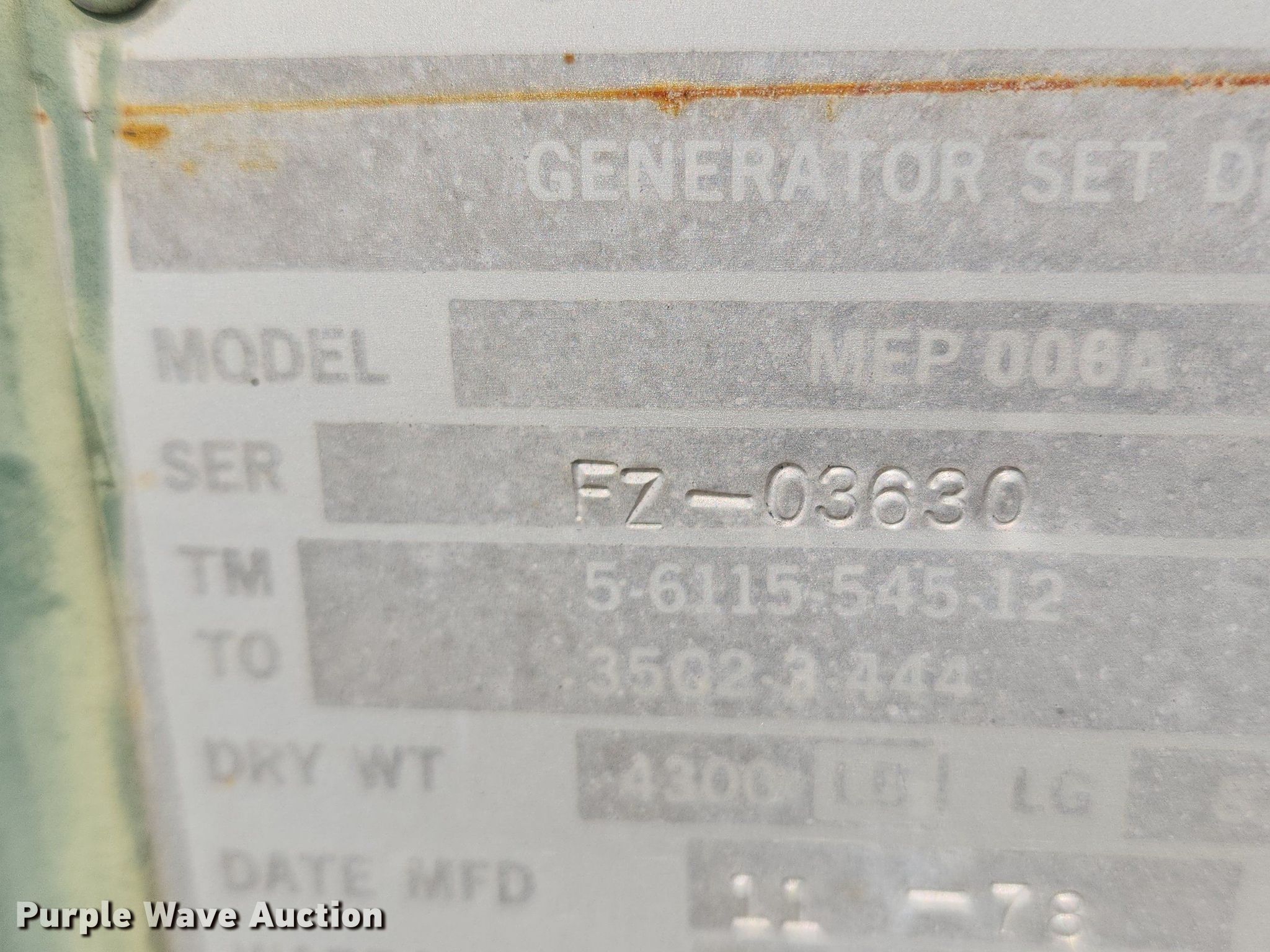 Purple Wave is selling a used Generator Set in Missouri. This item is a Dynamics Corporation of America MEP008A generator with the following: Hours: 2,664 on meter, Serial: FZ-03630