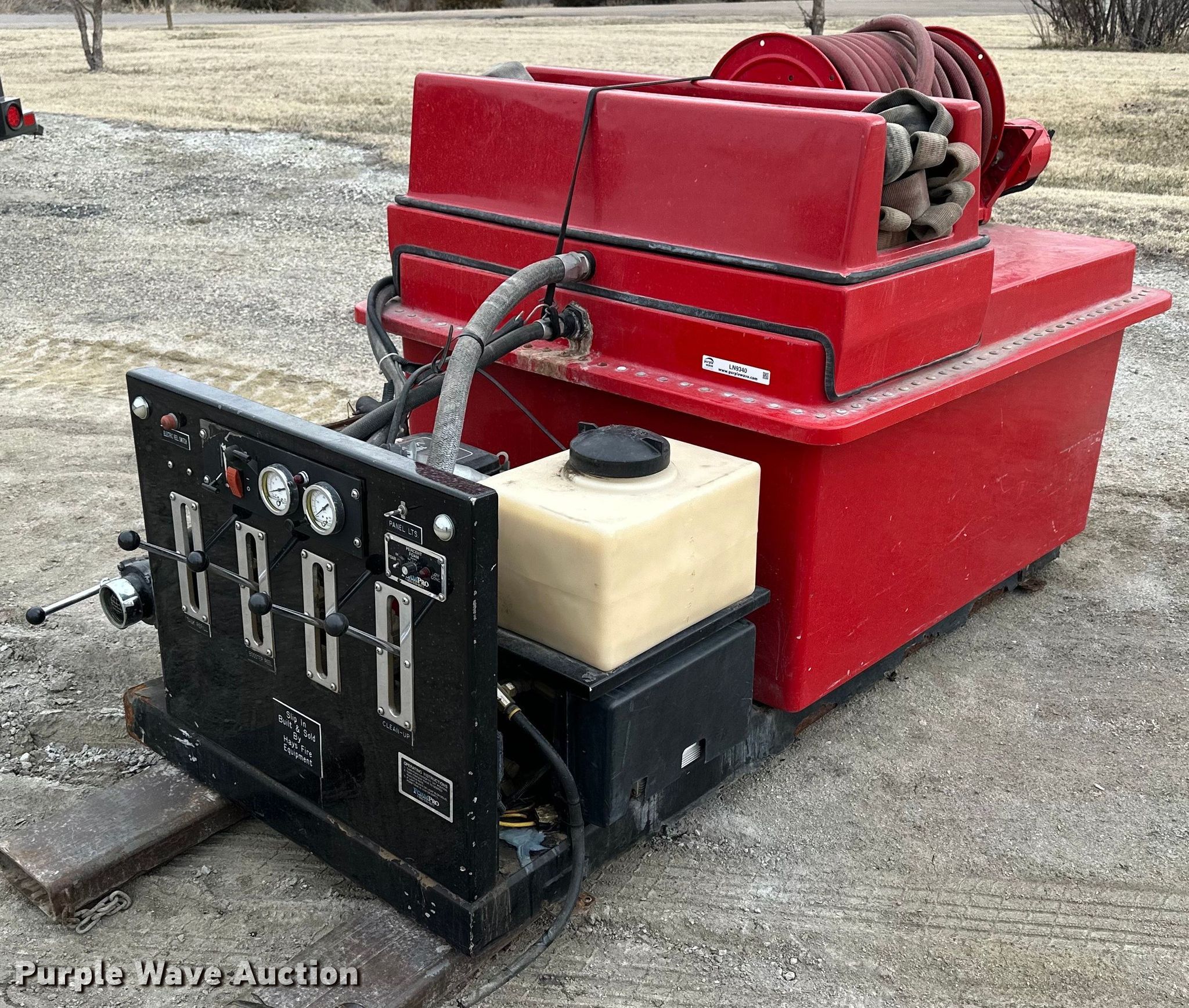 Purple Wave is selling a used Automotive Parts or Acces. in Kansas. This item is a Brush fire skid unit with the following: 7'3" L x 53" W x 51" H, Briggs & Stratton two cylinder 18HP gas engine, Fiberglass tank, Approx. capacity: 250 gallons, Top fill, Foam tank, Capacity: 8 gallons, Top fill, FoamPro pump, Hannay EF4034-17-18 hose reel, 1.5" diameter hose, 3" discharge, Skid forks not included