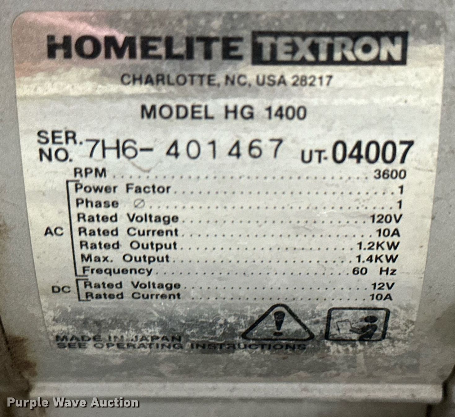 Purple Wave is selling a used Generator Set in Kansas. This item is a Homelite HG 1400 generator with the following: Serial: 7H6-401467
