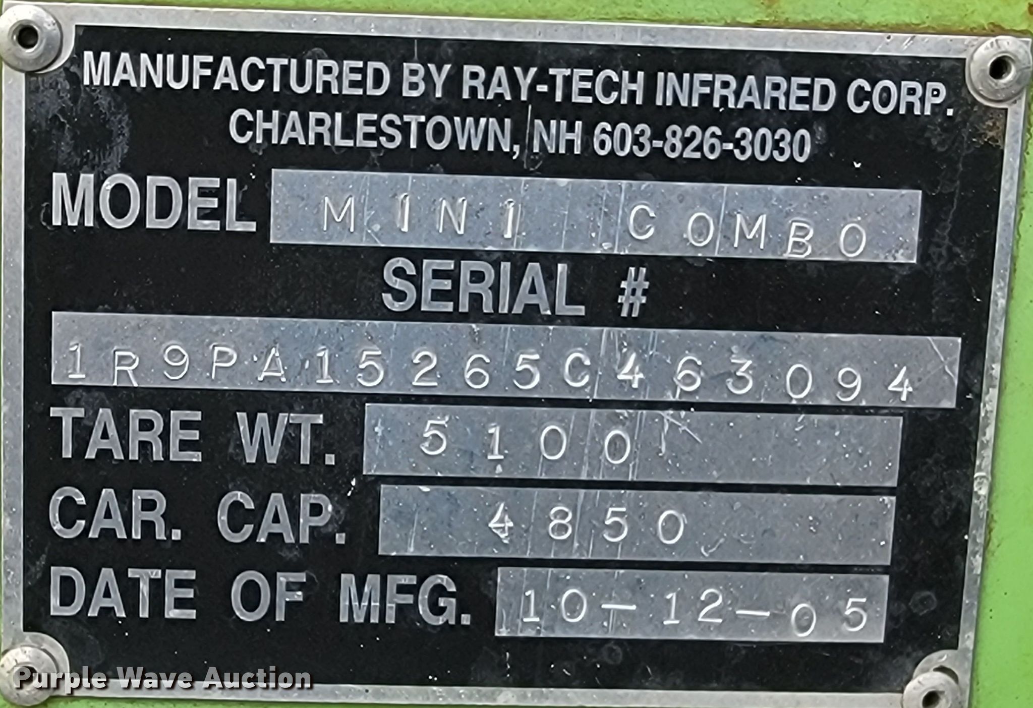 2005 Raytech Mini Combo infrared asphalt heater trailer. VIN: 1R9PA15265C463094. Dimensions Overall: 17' x 87" W. Features Infrared heating chamber, Burner: LPG (5) tanks, 21" W discharge chutes, Winch. Chassis Hitch: Pintle, Landing gear: Single, Suspension: Spring, Axles: Tandem. Notes Dead batteries. South Dakota title. Title distribution may be delayed up to 14 days from verification of funds. City of Harrisburg. 801 Perry Lane. Harrisburg, SD 57032