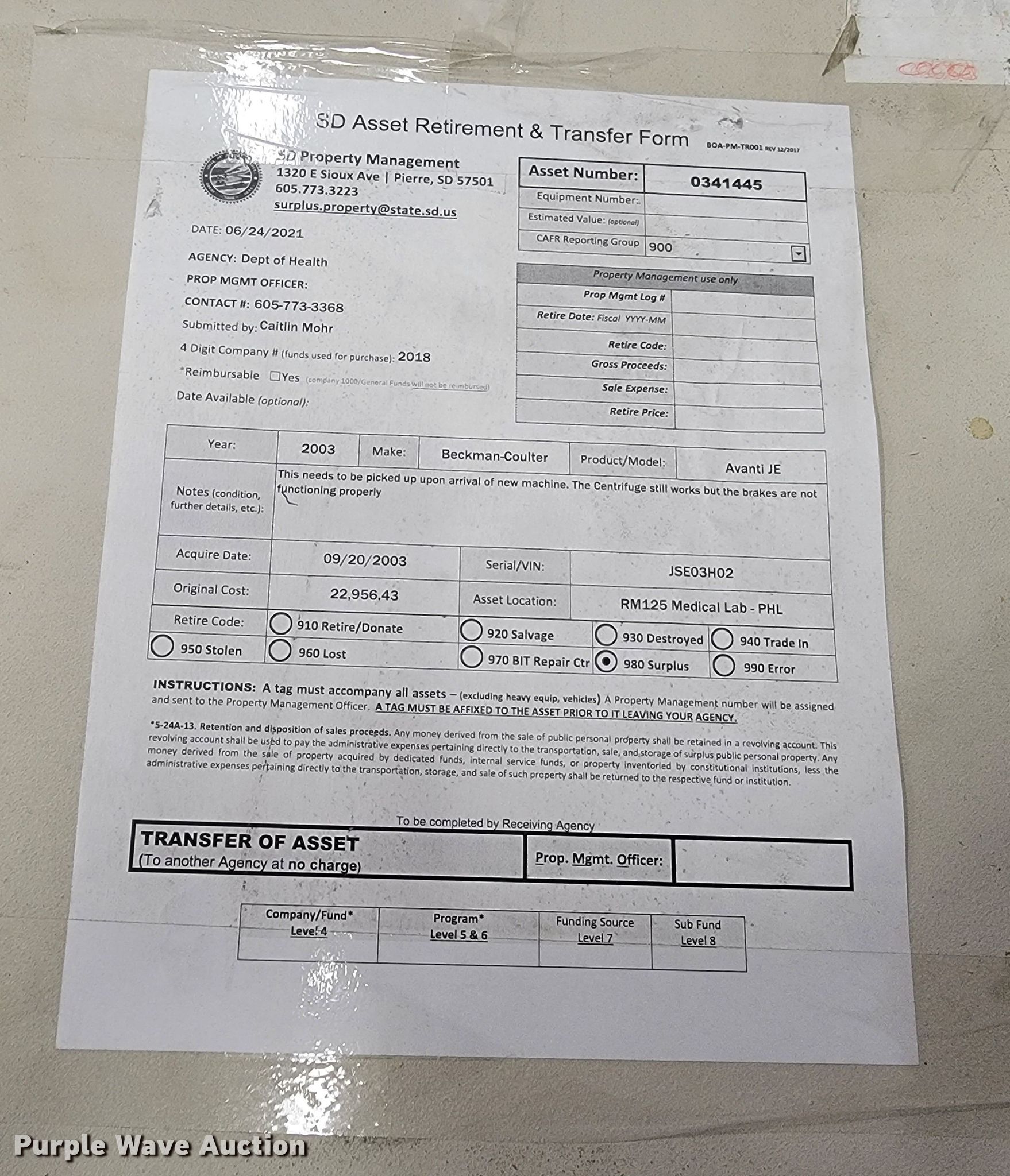 Beckman Coulter Avanti J-E centrifuge. Serial: JSE03H02, Unit #: 341445. Notes Non-operational brakes. 1320 East Sioux Avenue. Pierre, SD 57501