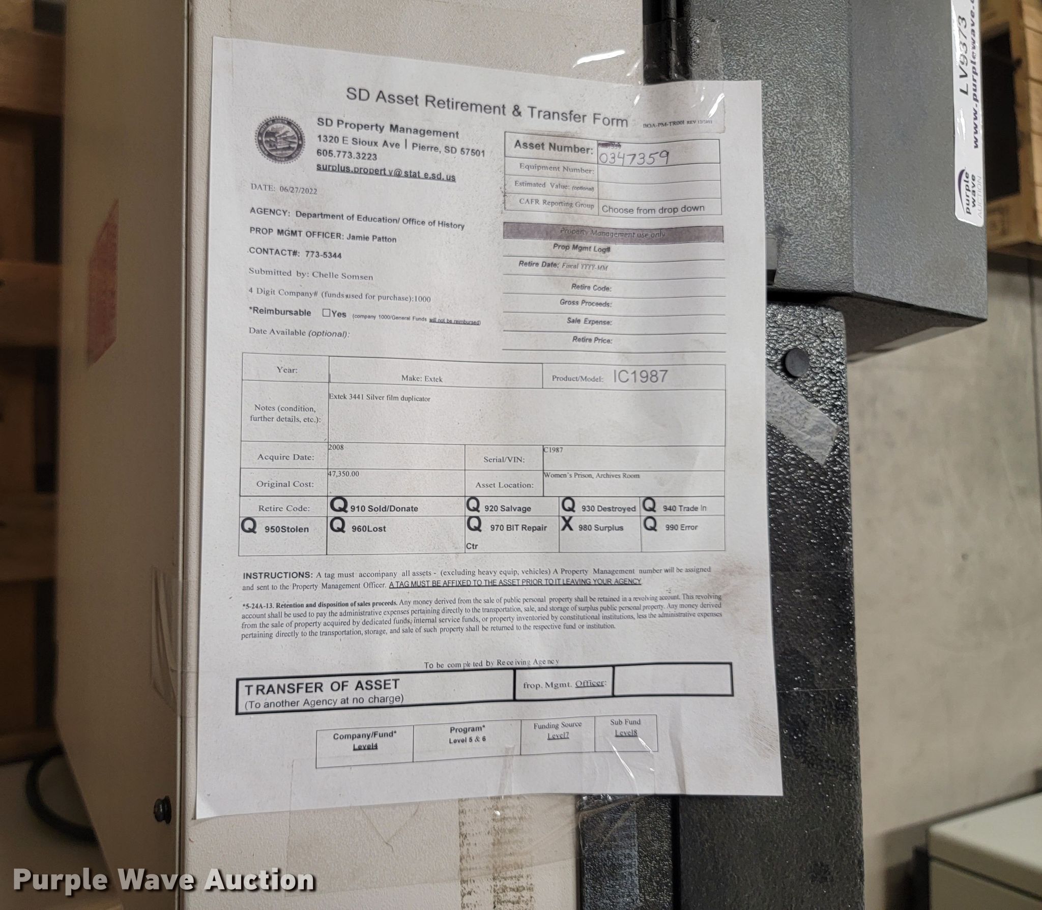 Purple Wave is selling a used Tools in South Dakota. This item is a Extek 3441 silver film duplicator with the following: 115V, Single phase, Serial: C1987, Unit #: 347359