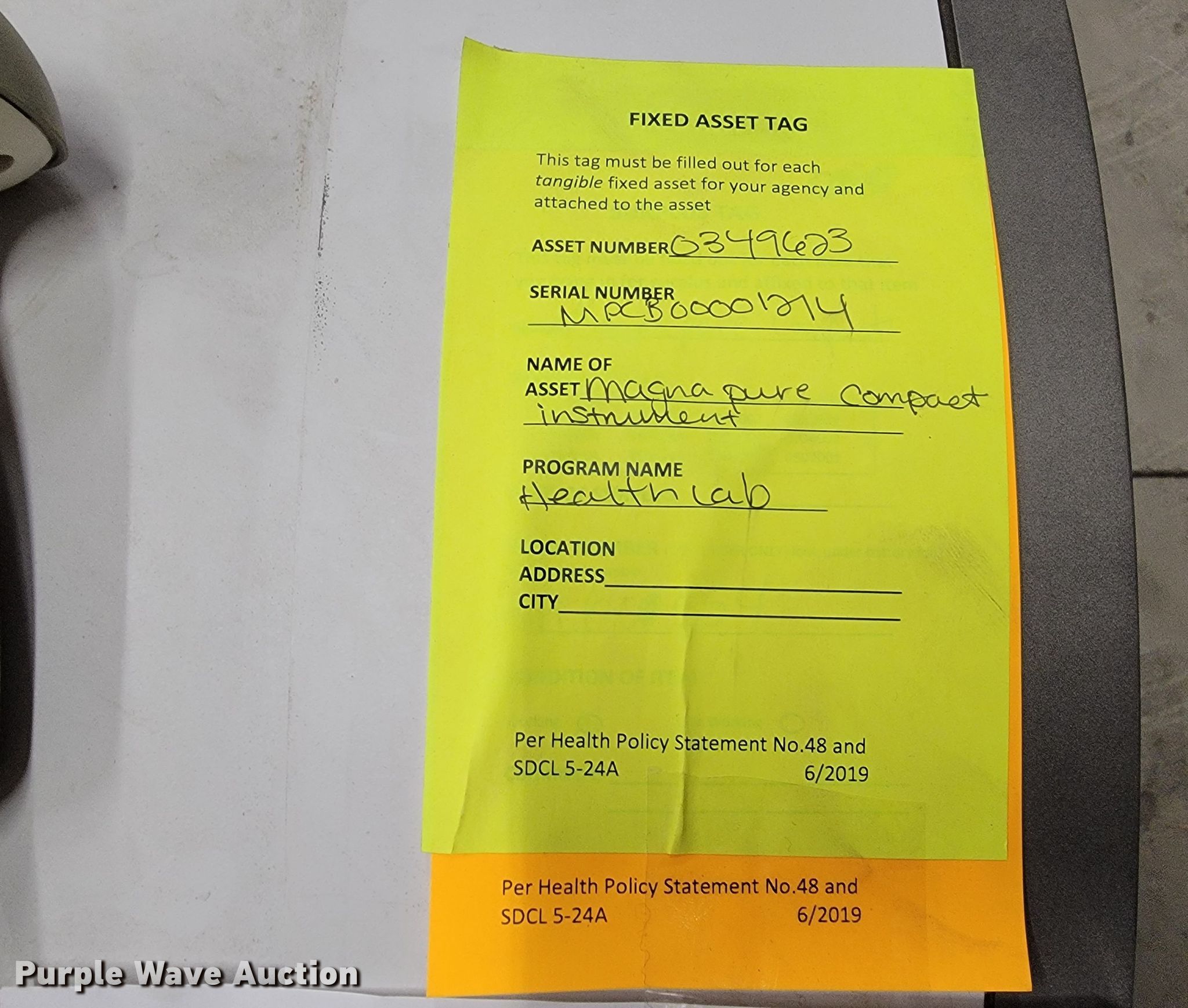 Roche Magna Pure Compact nucleic acid purifier. Serial: MPCB0554, Unit #: 349623. 1320 East Sioux Avenue. Pierre, SD 57501