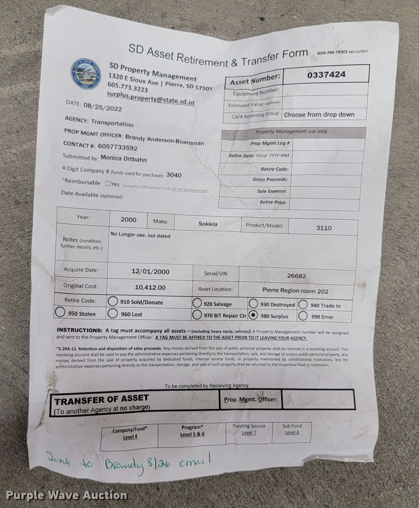 Purple Wave is selling a used Electronics in South Dakota. This item is a Sokia SDR33 data collector with the following: Unit #: 337424