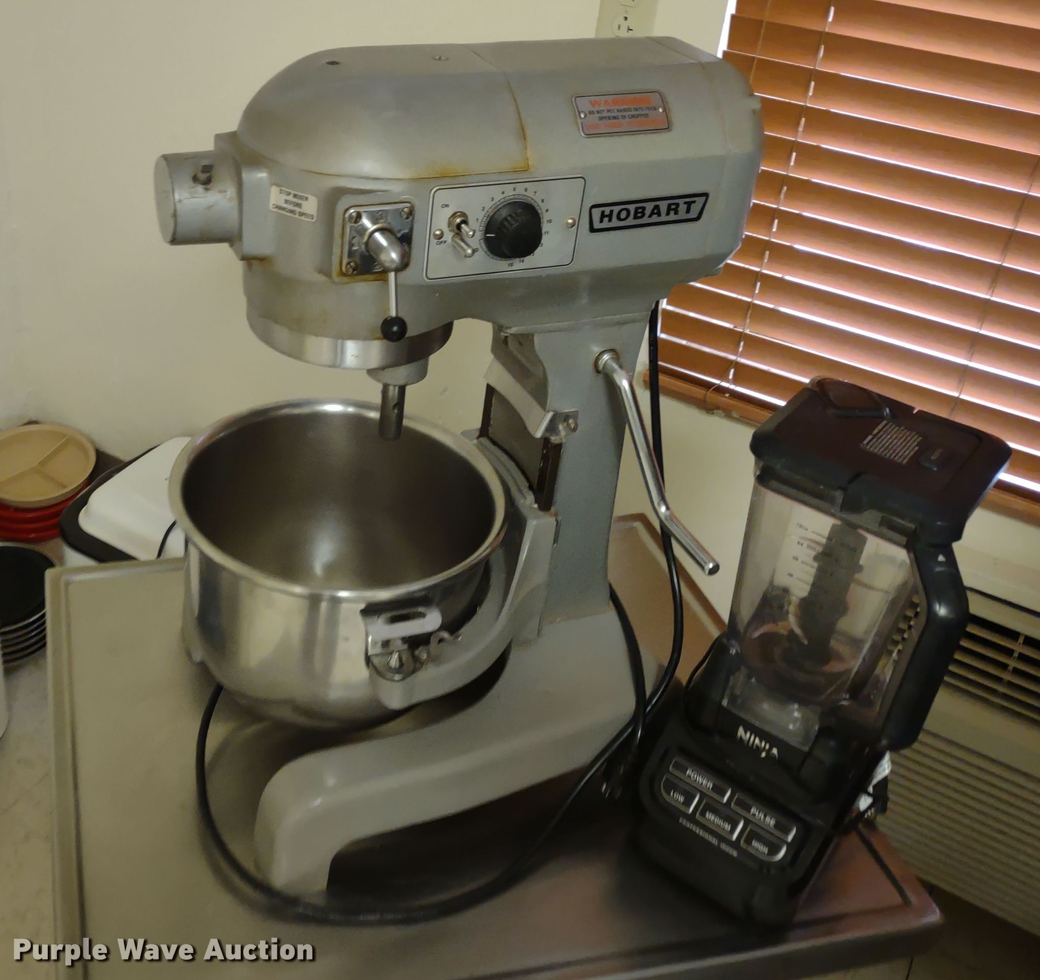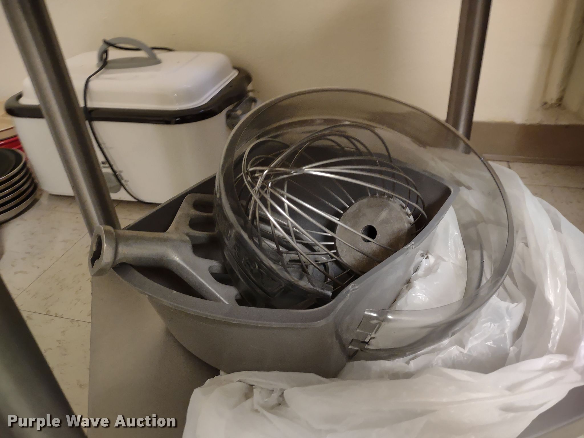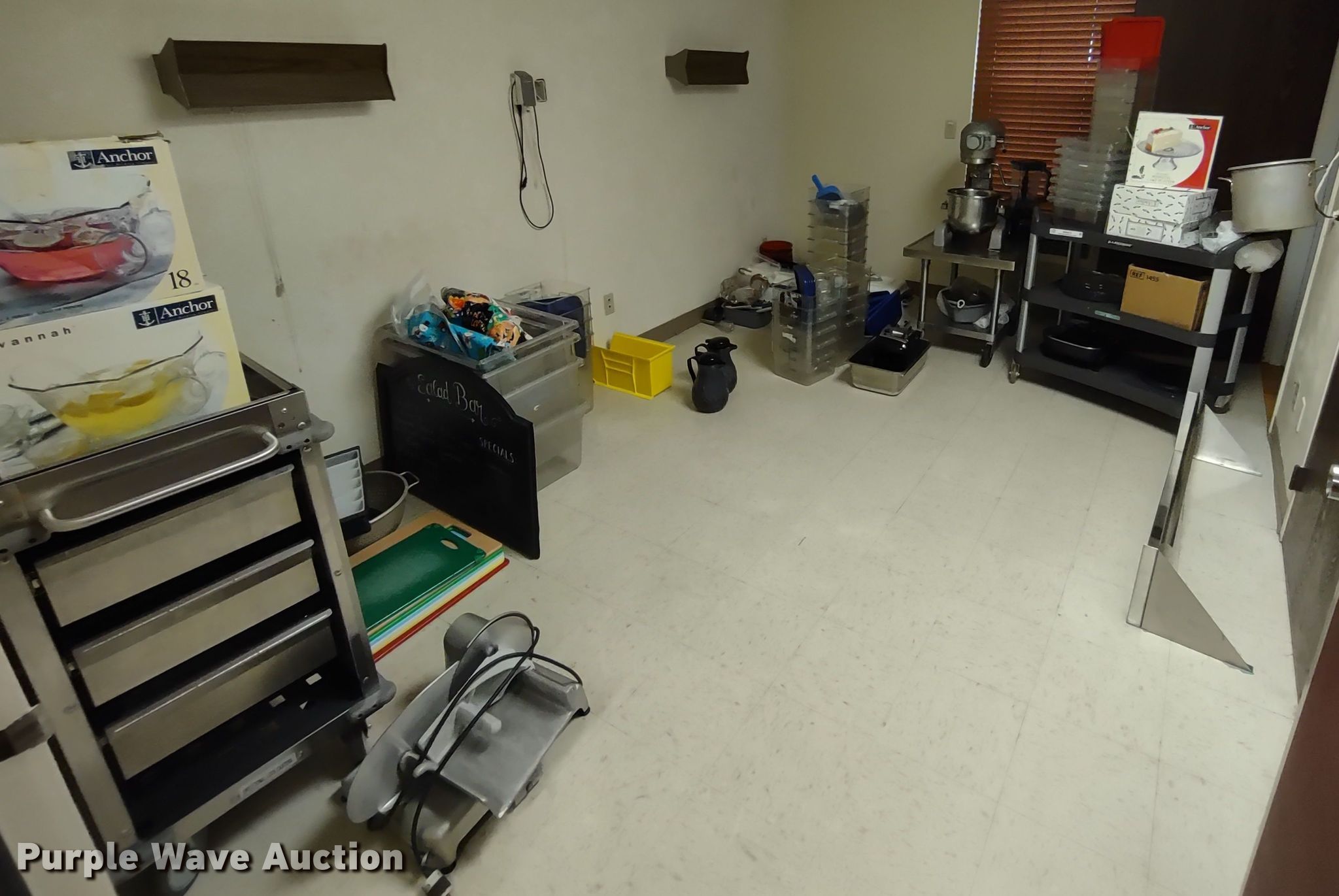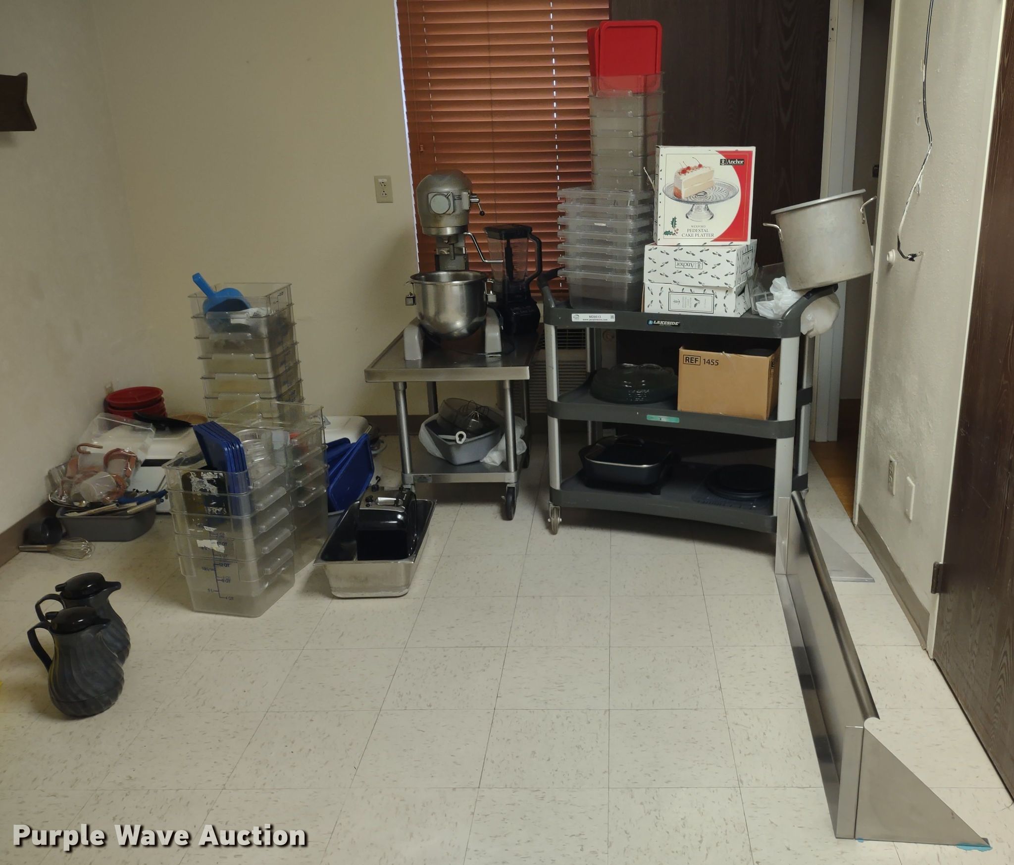 Purple Wave is selling a used All Other Household Items in Kansas. This item is a Kitchen appliances with the following: Hobart mixer, Ninja blender, Roaster pans, (3) Anchor cake platters, (2) Anchor punch sets, (3) carts, Meat slicer and more