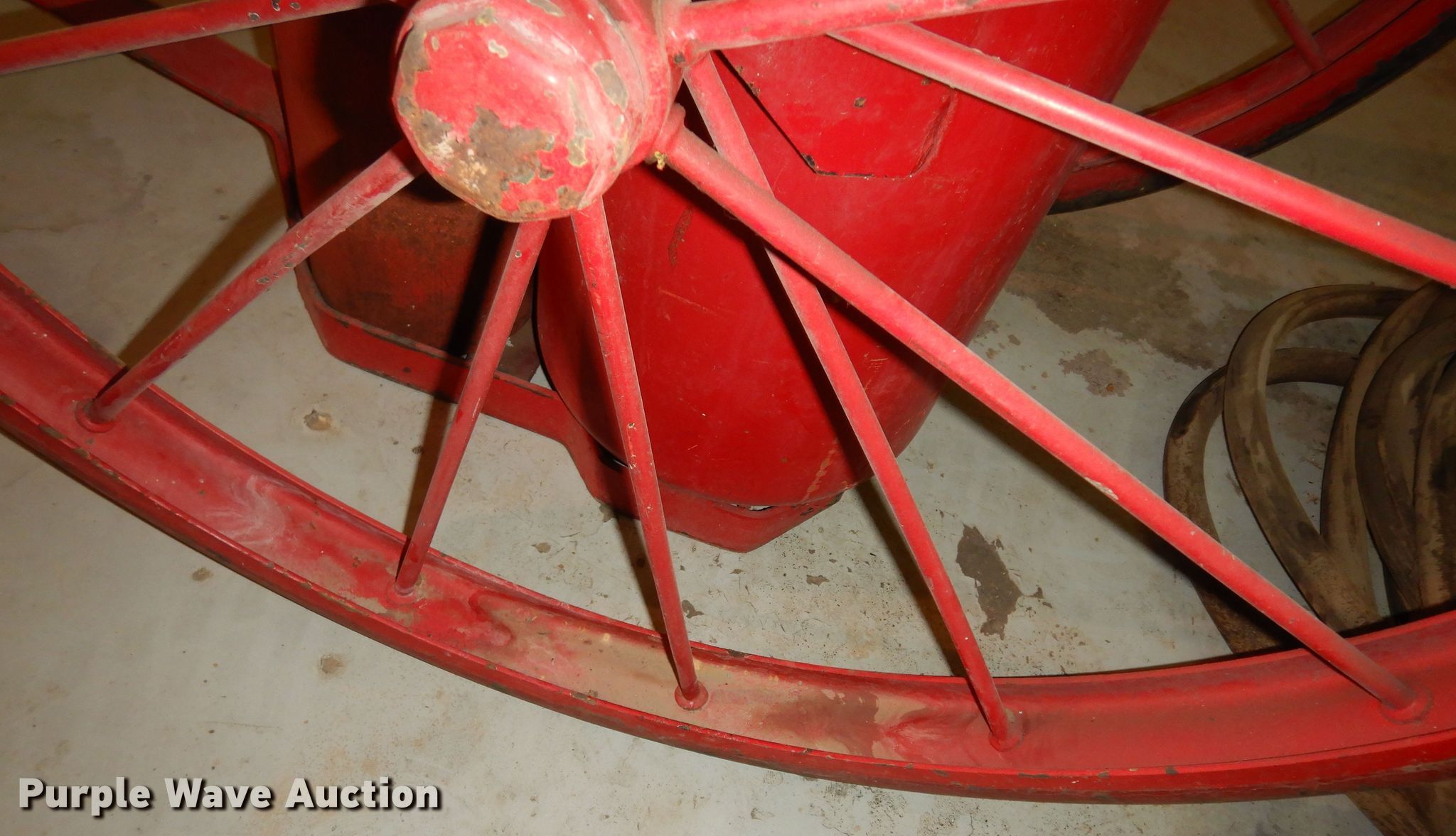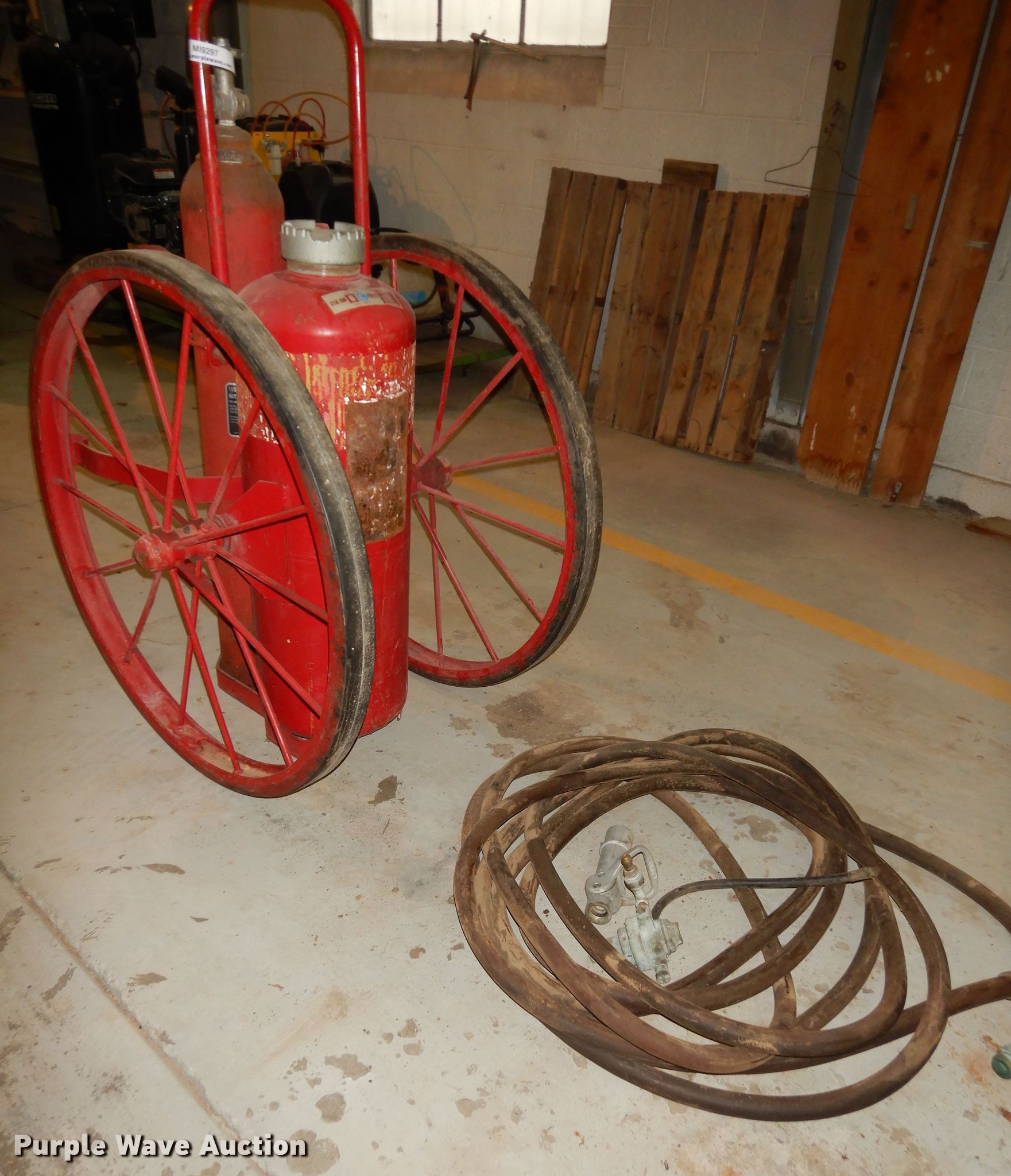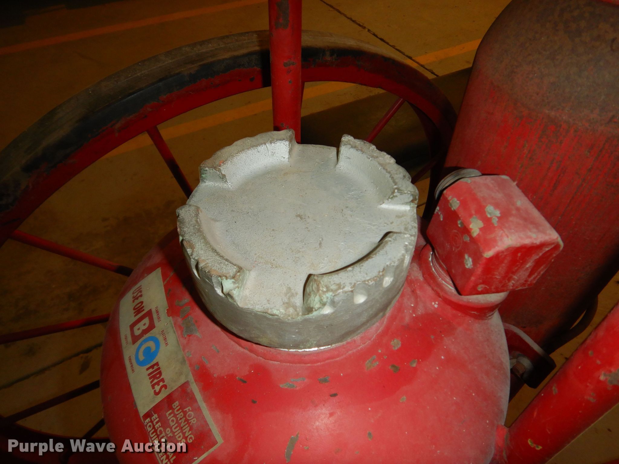 Purple Wave is selling a used Tools in Kansas. This item is a Dry chemical cart with the following: Dry chemical tank, Nitrogen tank, 38" diameter wheels