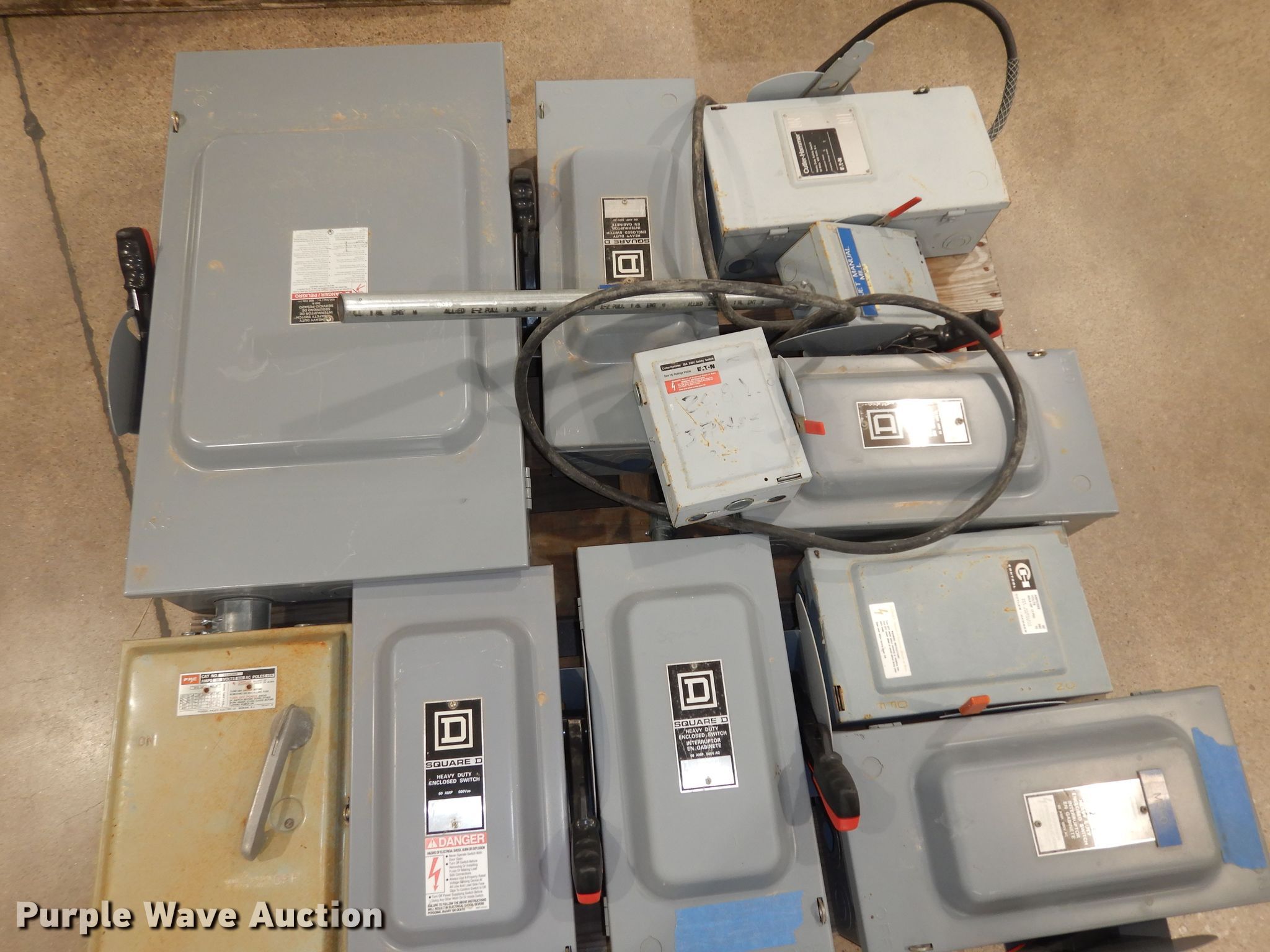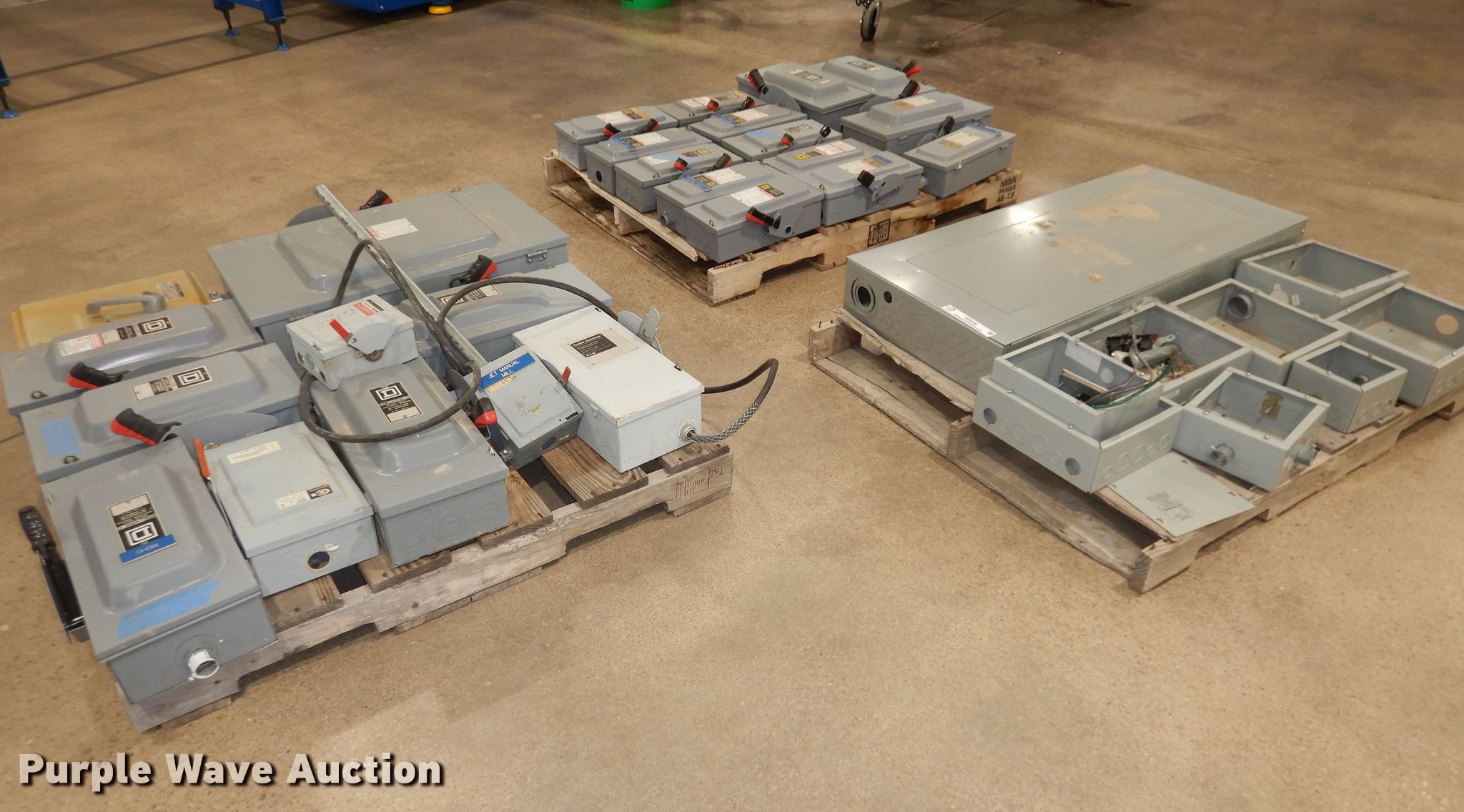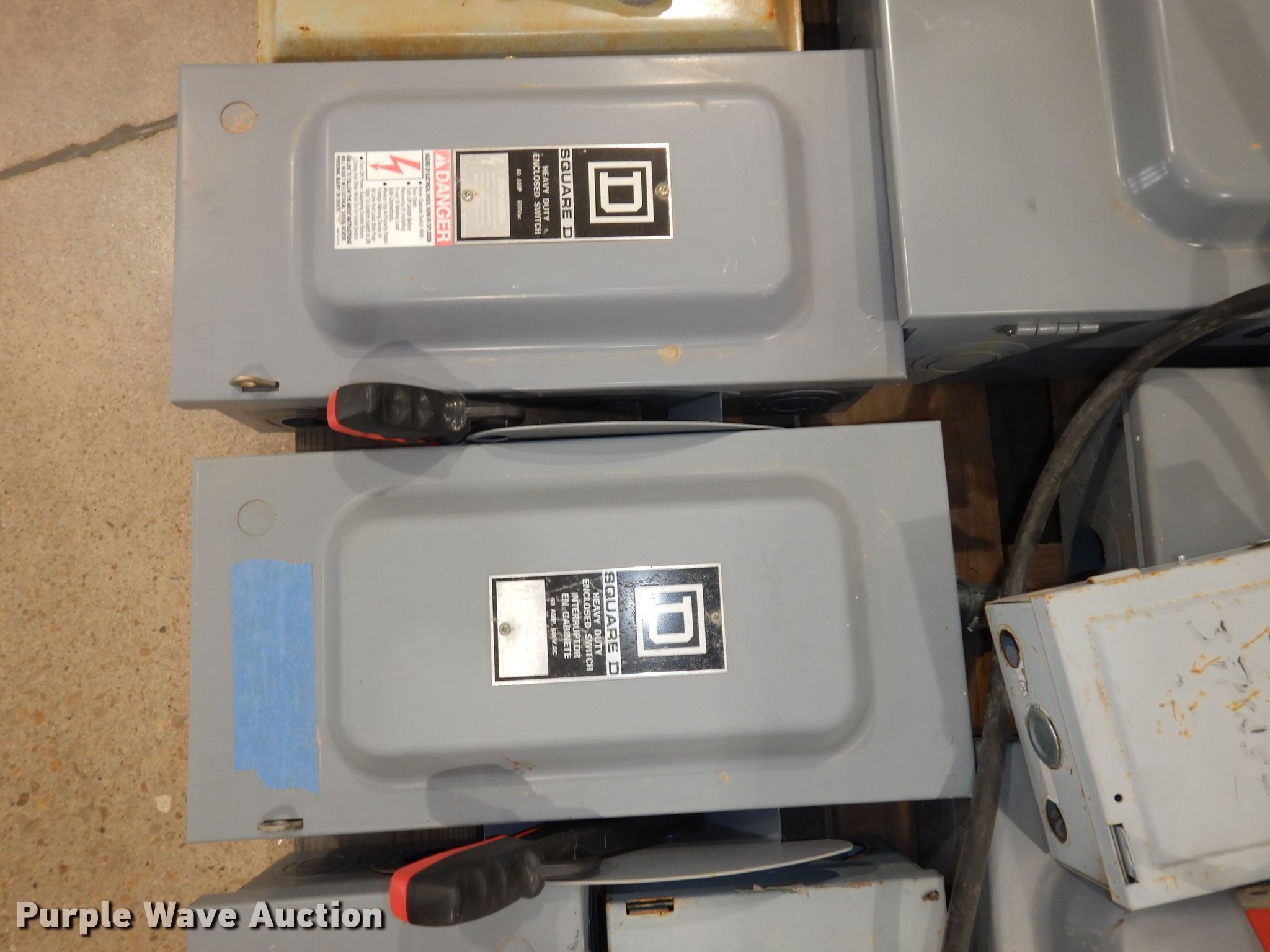 Purple Wave is selling a used Building Materials in Kansas. This item is a (34) Square D safety switches with the following: (7) empty boxes