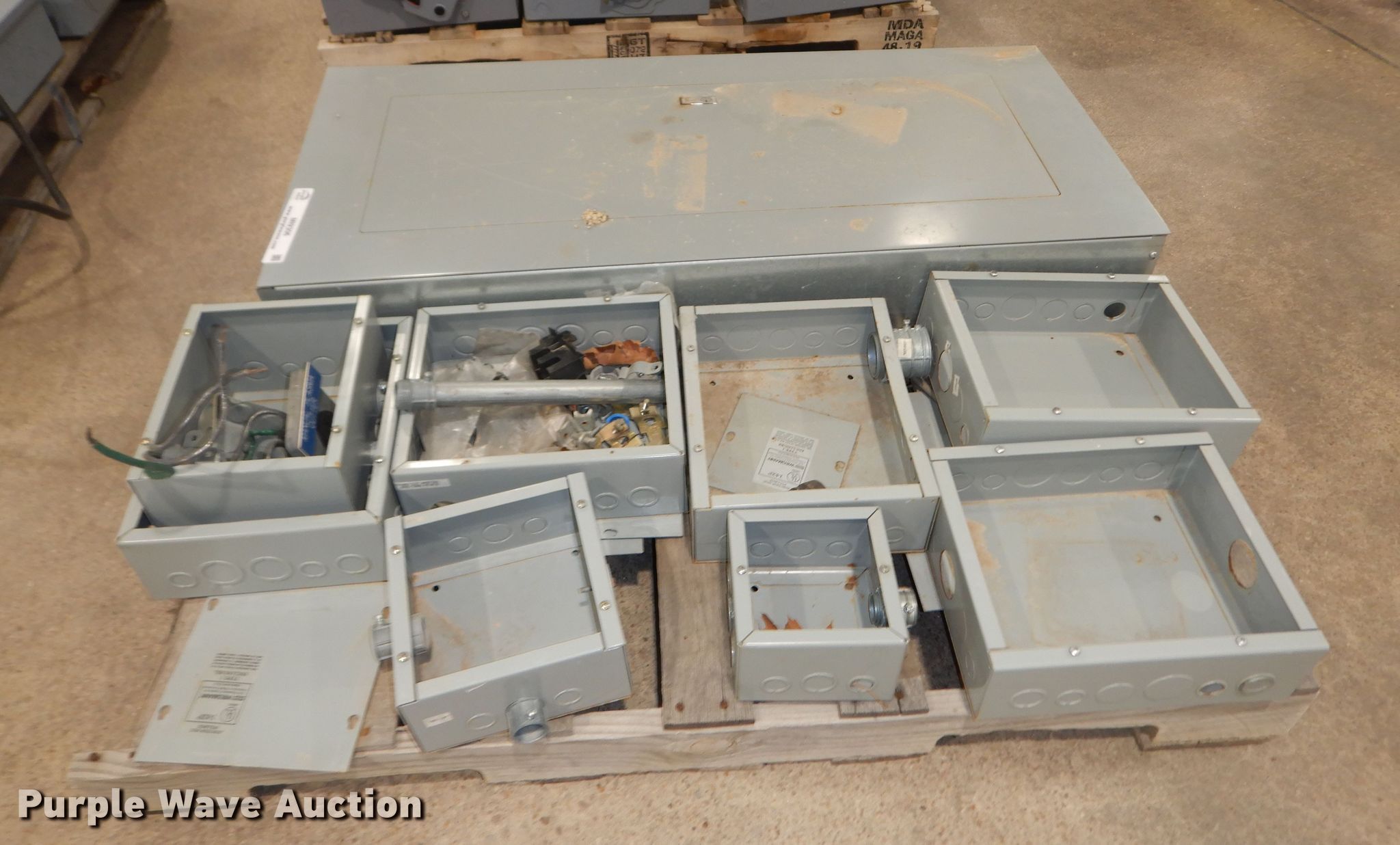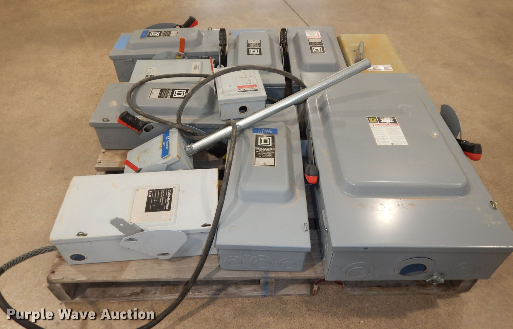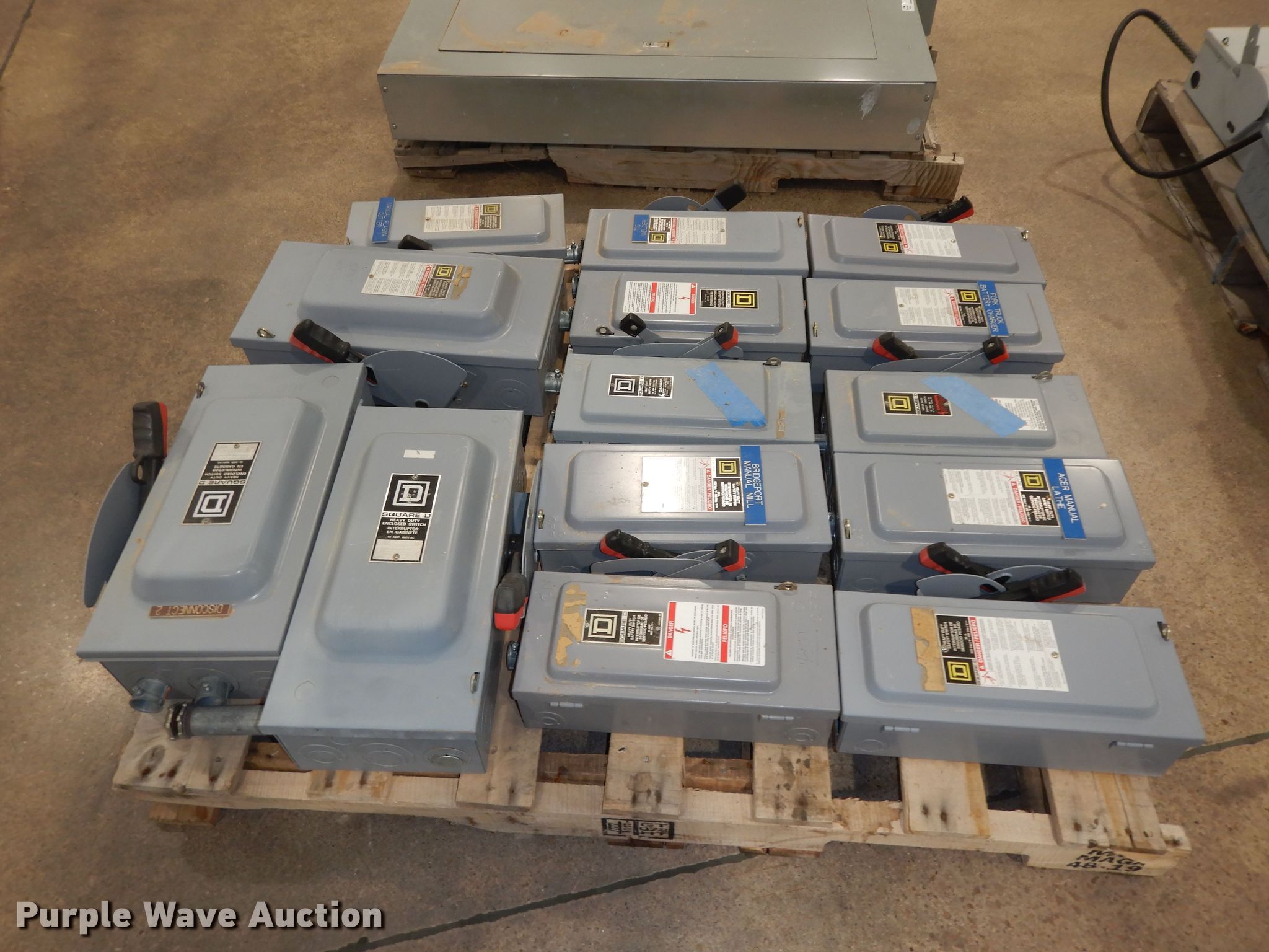 Purple Wave is selling a used Building Materials in Kansas. This item is a (34) Square D safety switches with the following: (7) empty boxes