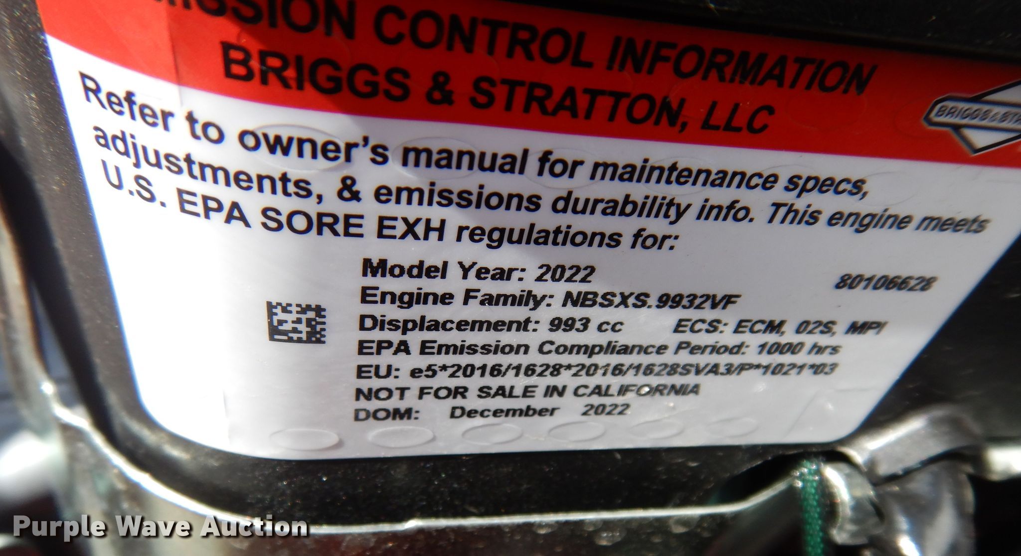 Ferris ISX3300 ZTR lawn mower. Hours: 729 on meter, Cutting width: 72", Serial: 4001201917. Engine Briggs & Stratton Vanguard, Cylinders: 2, Fuel type: Gas, HP: 993 cc. Tires Front: 13x6.50-6, Rear: 26x12.00-12 , Brand: Carlisle. Banner Creek Reservoir. Holton, KS 66436