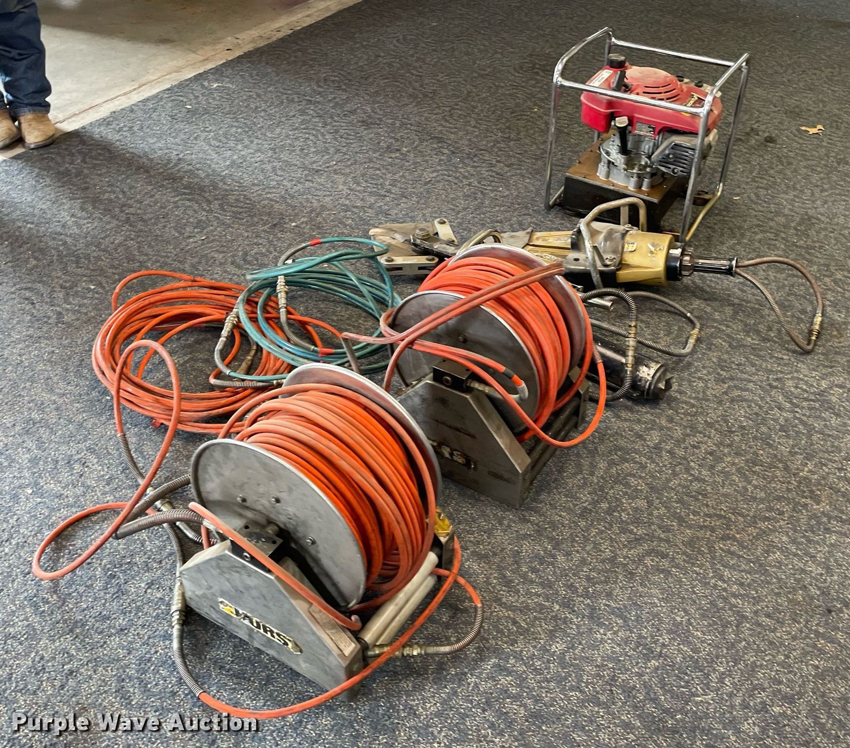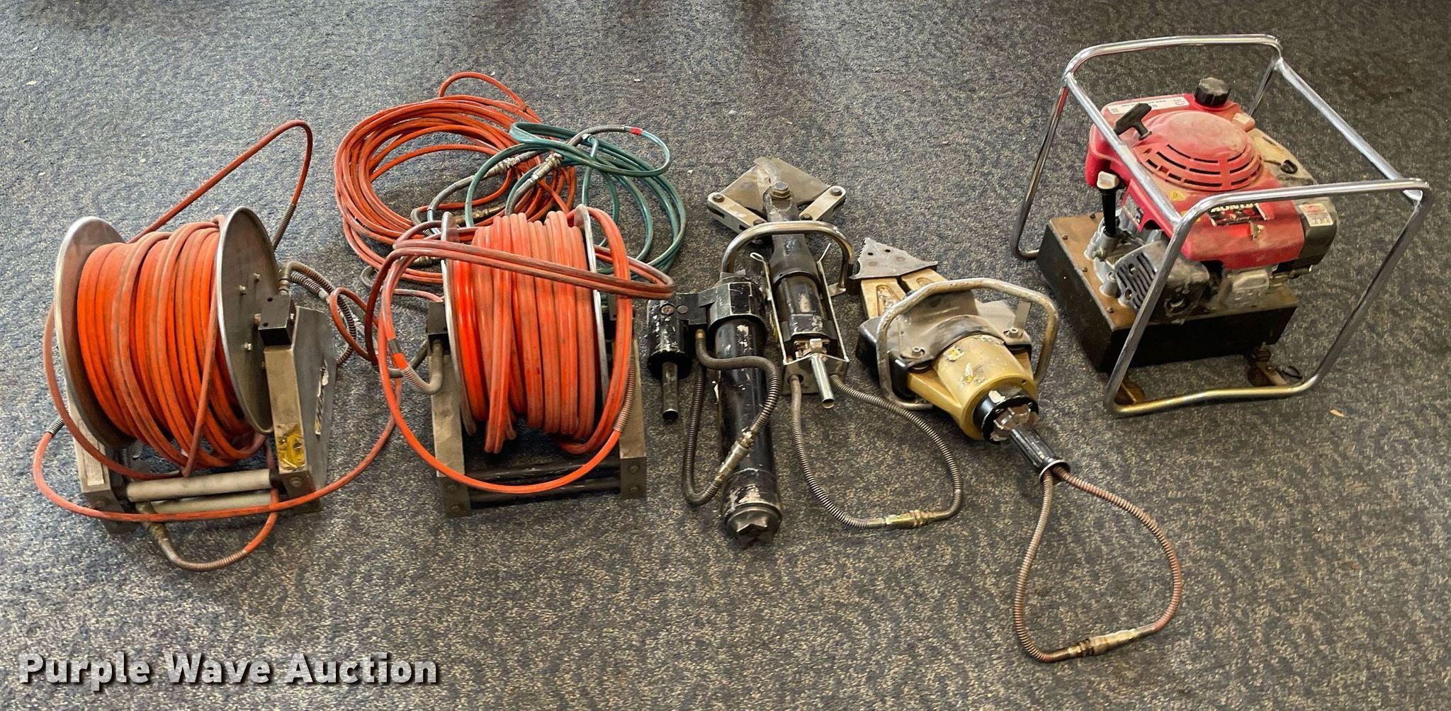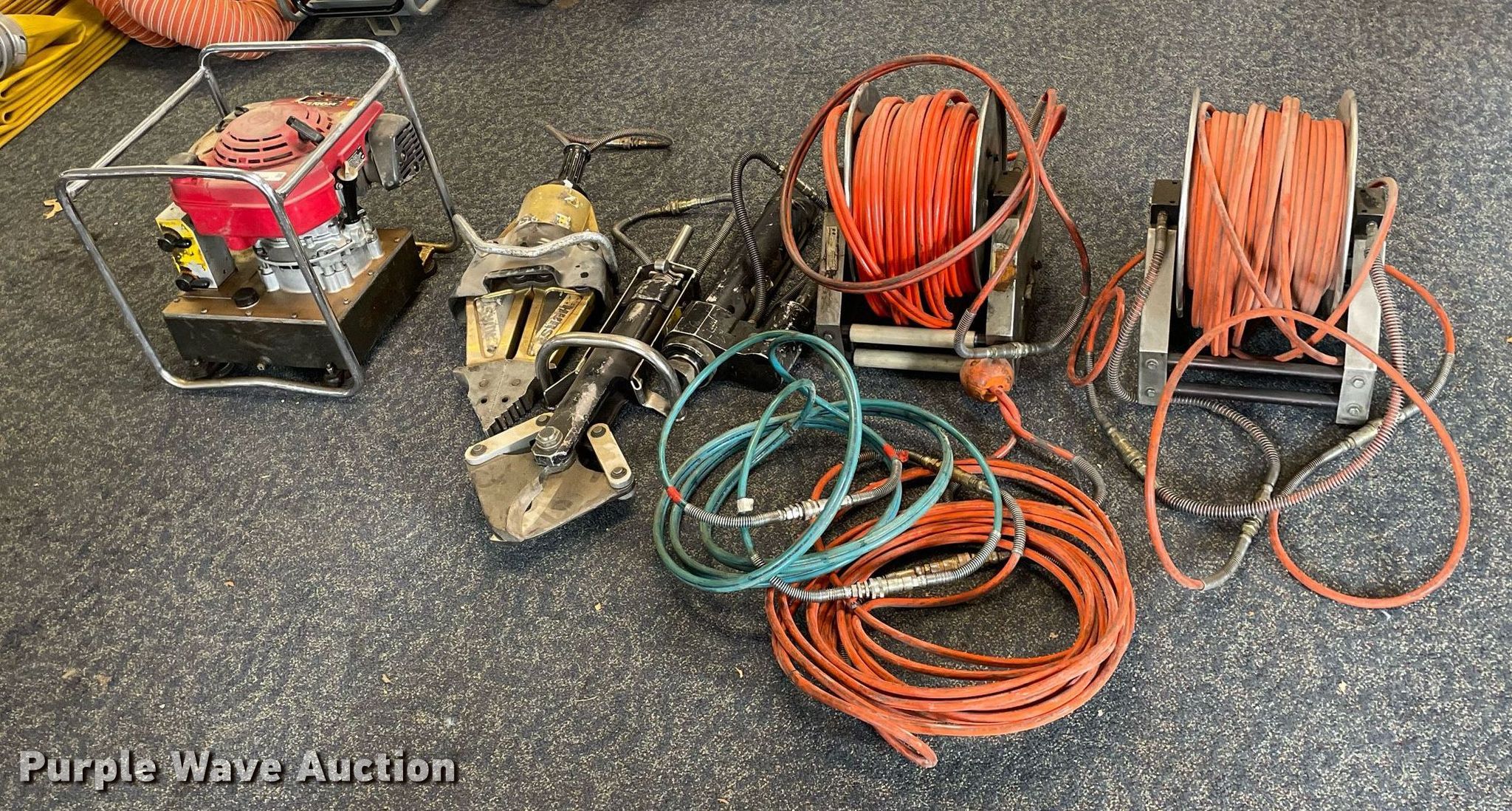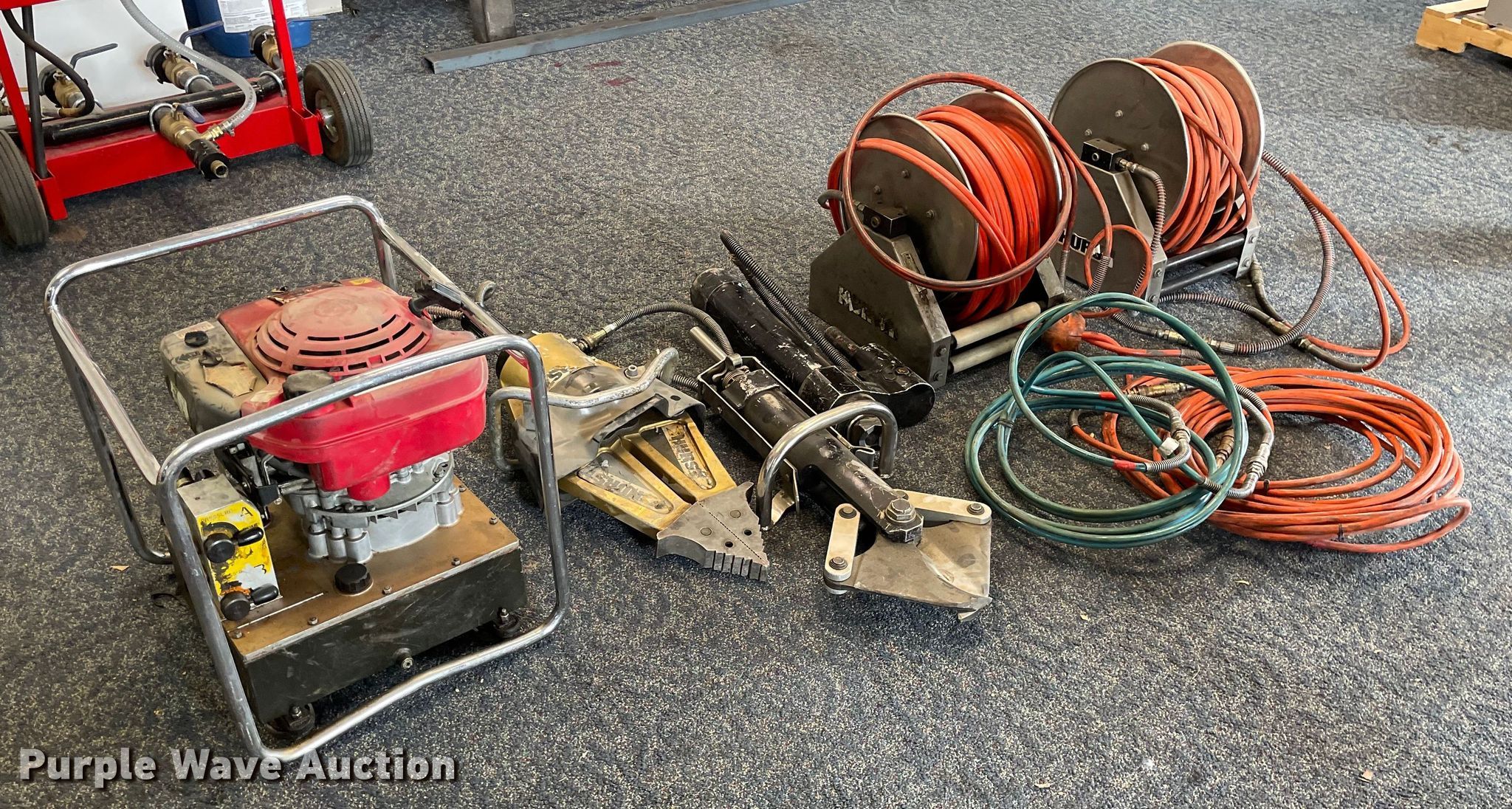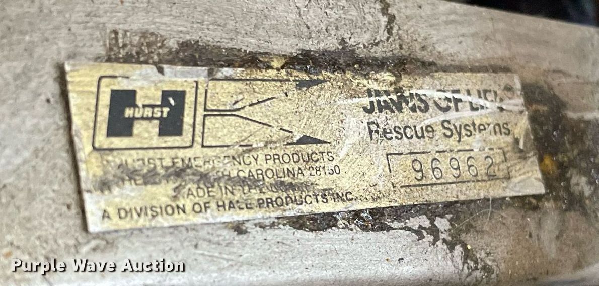 Purple Wave is selling a used Tools in Kansas. This item is a Hurst Jaws of Life rescue equipment with the following: Hydraulic power unit, Honda gas engine, 5.5 HP,, Hurst spreader, Hurst cutter, Ram, (2) hose reels, Hose