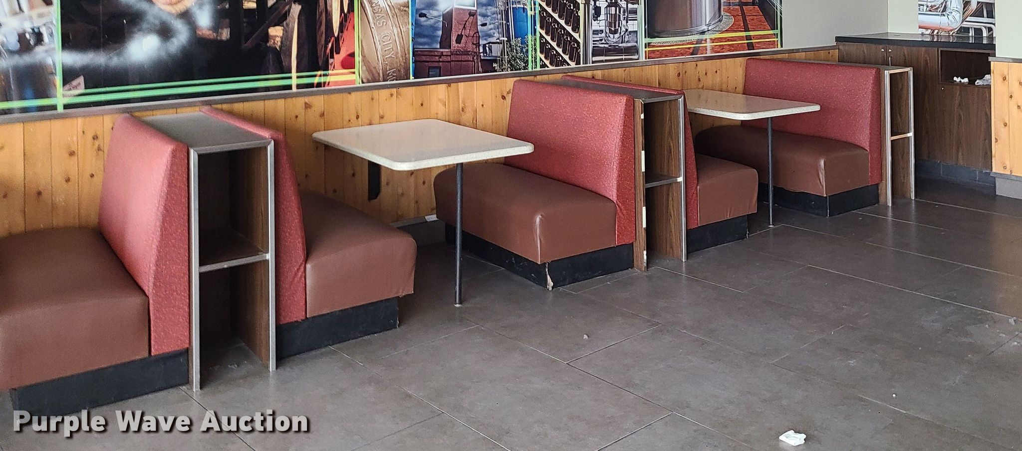 Purple Wave is selling a used Furniture in Missouri. This item is a Furniture with the following: Tables, Booths, Bar top, Decorations, Walk-in cooler, Oven hoods, Furniture, Unit #: Boulevard