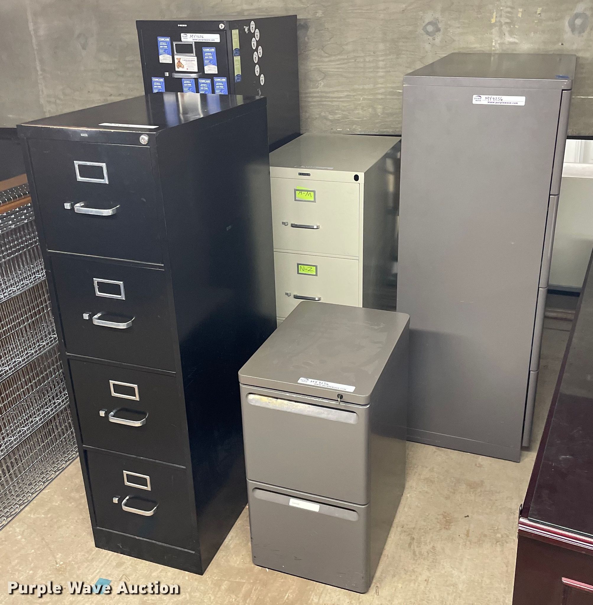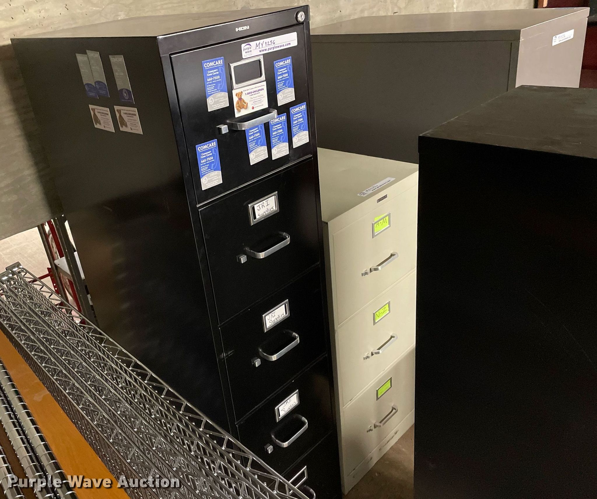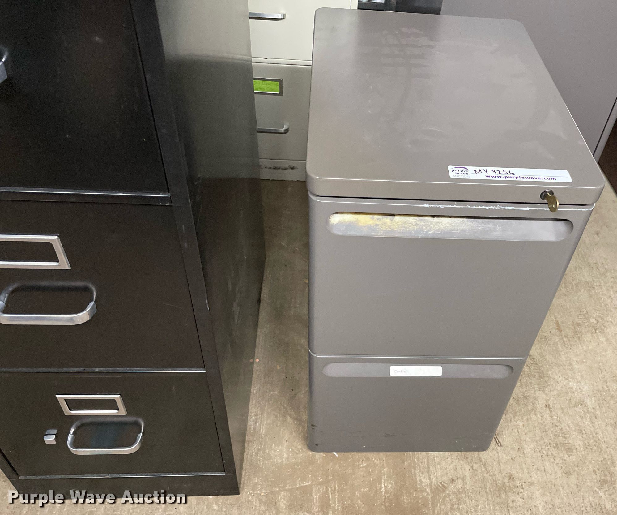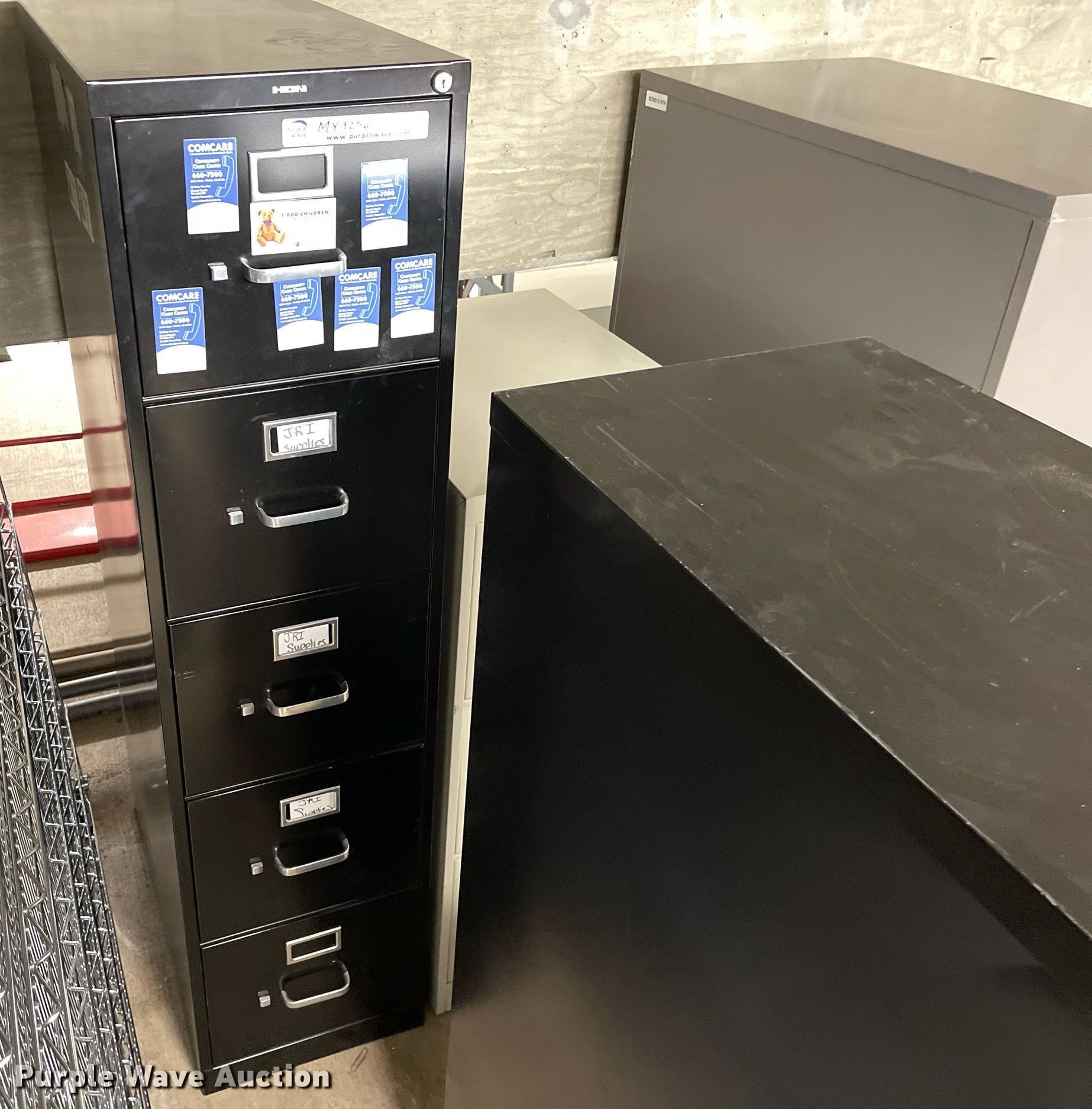 Purple Wave is selling a used Furniture in Kansas. This item is a Furniture with the following: Desk, Four drawer lateral file cabinet, Three drawer legal file cabinet, Hon five drawer letter file cabinet, Hon four drawer letter file cabinet, Two drawer file cabinet