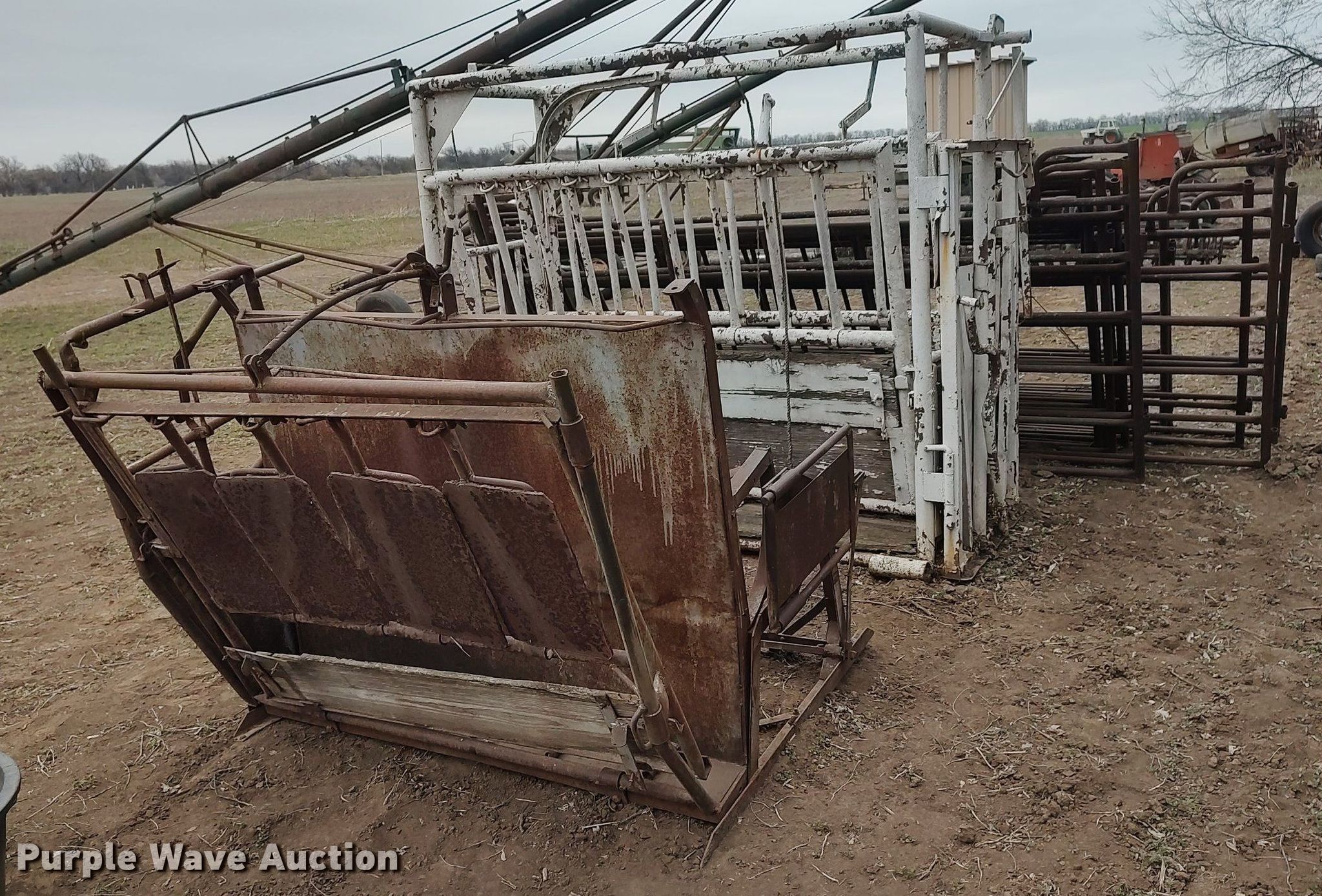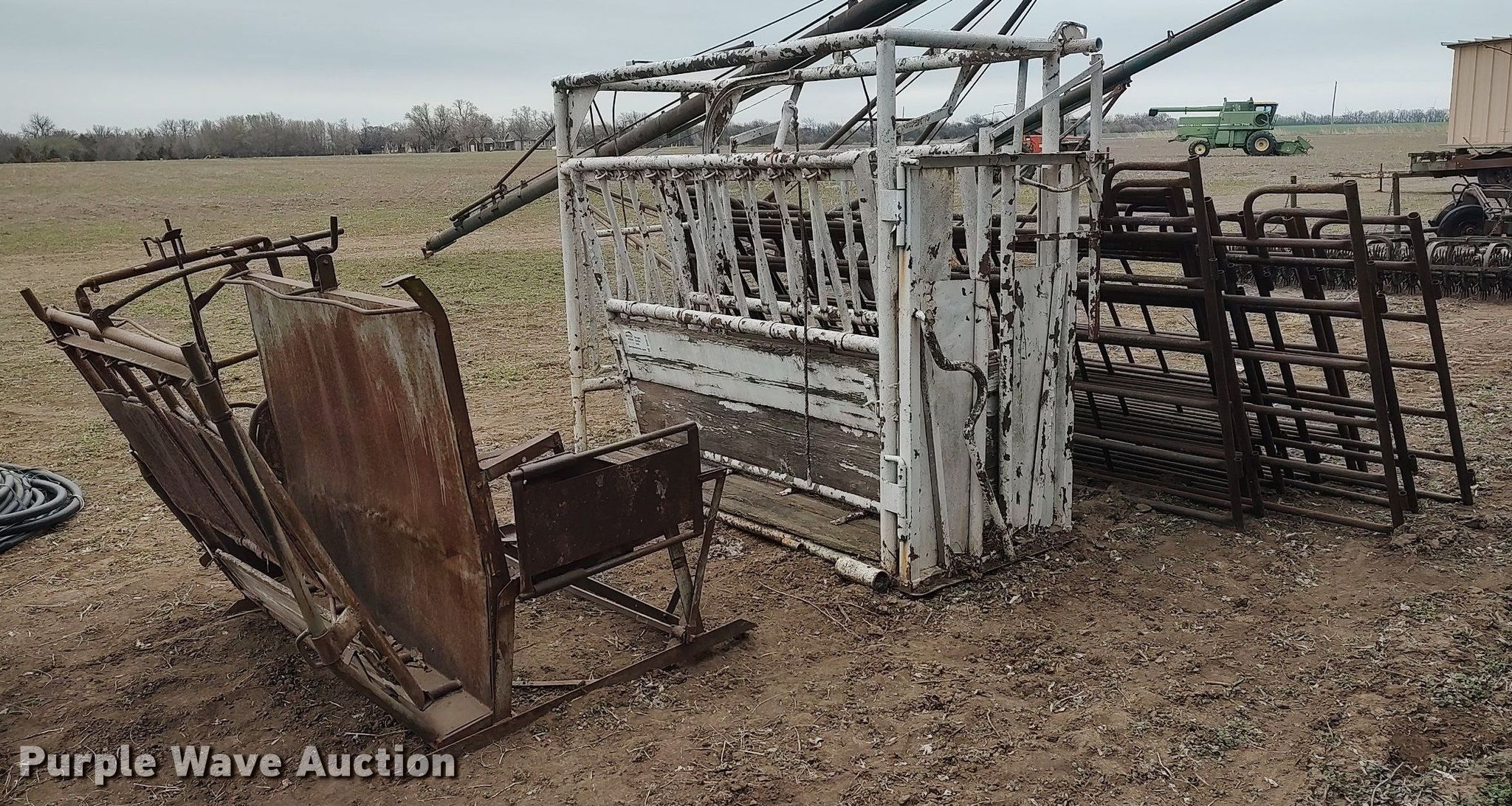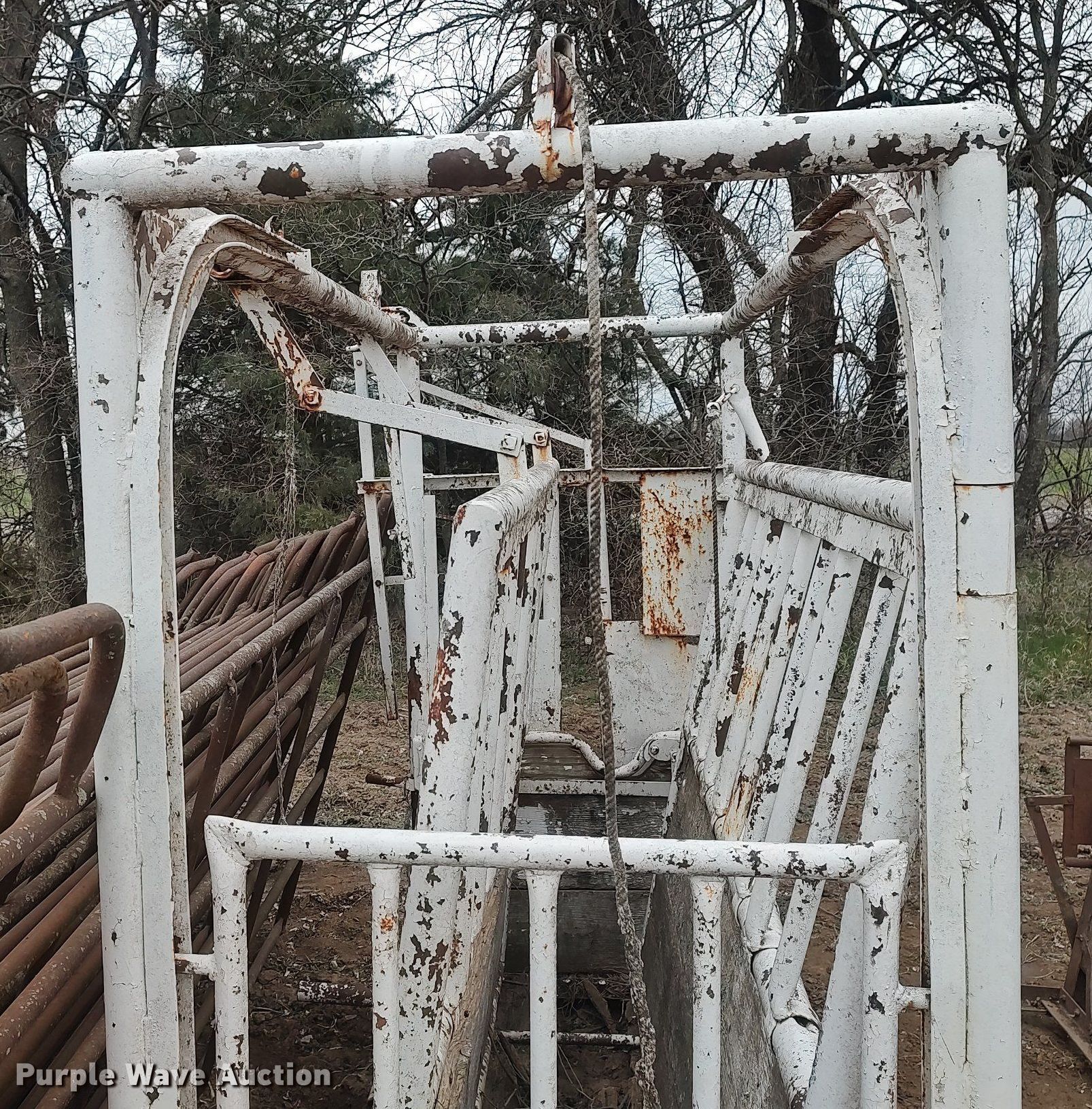 Purple Wave is selling a used Livestock Equip. in Kansas. This item is a Livestock equipment with the following: Livestock squeeze chute, Calf table, (14) fence panels, 10', 12'