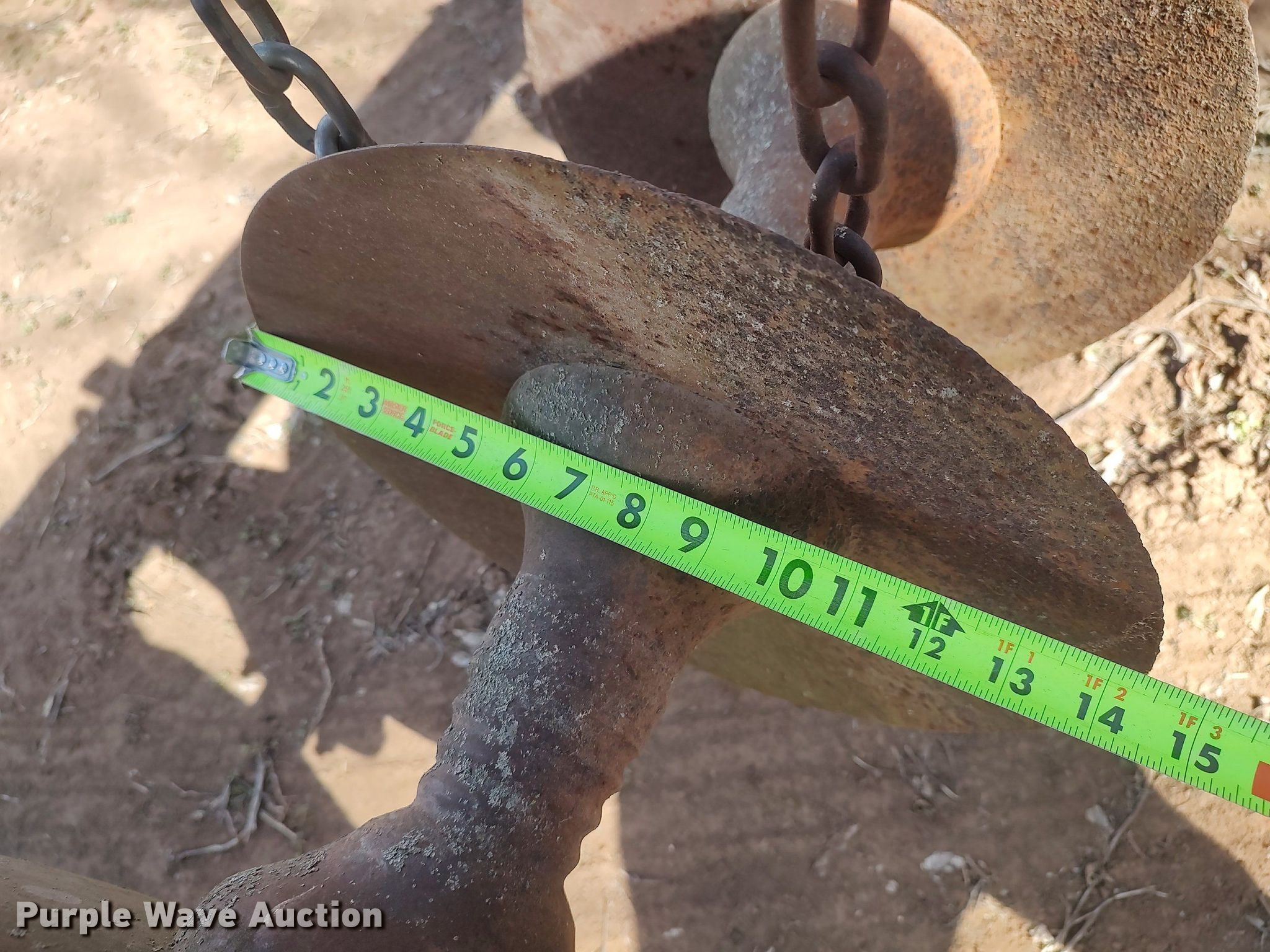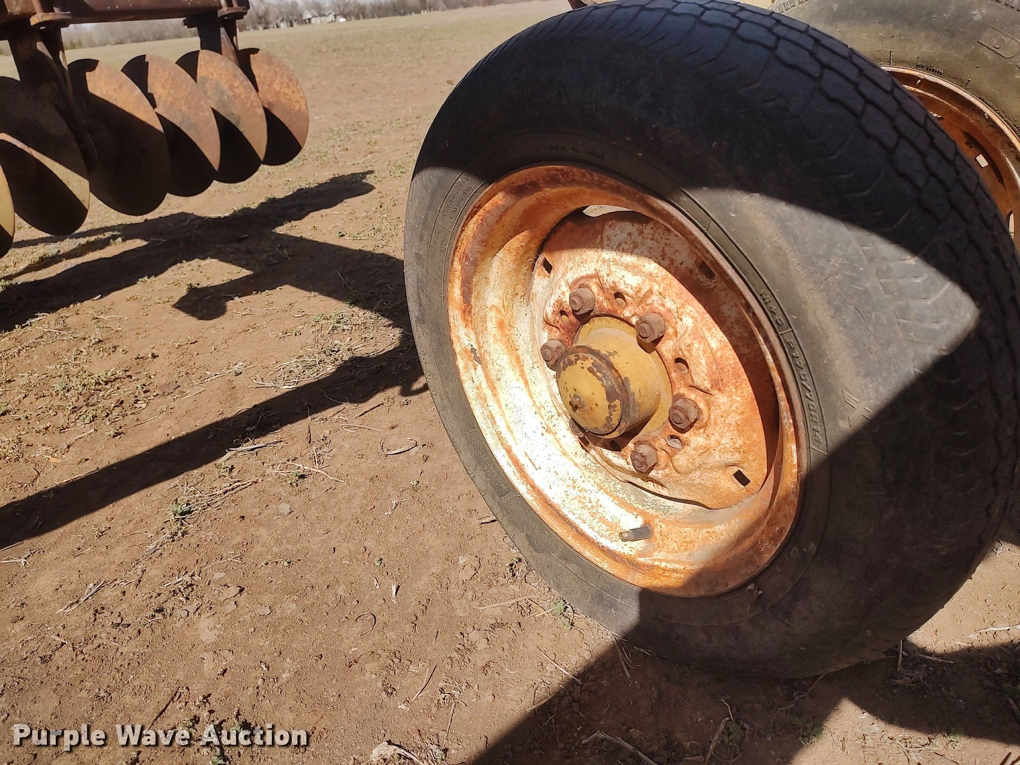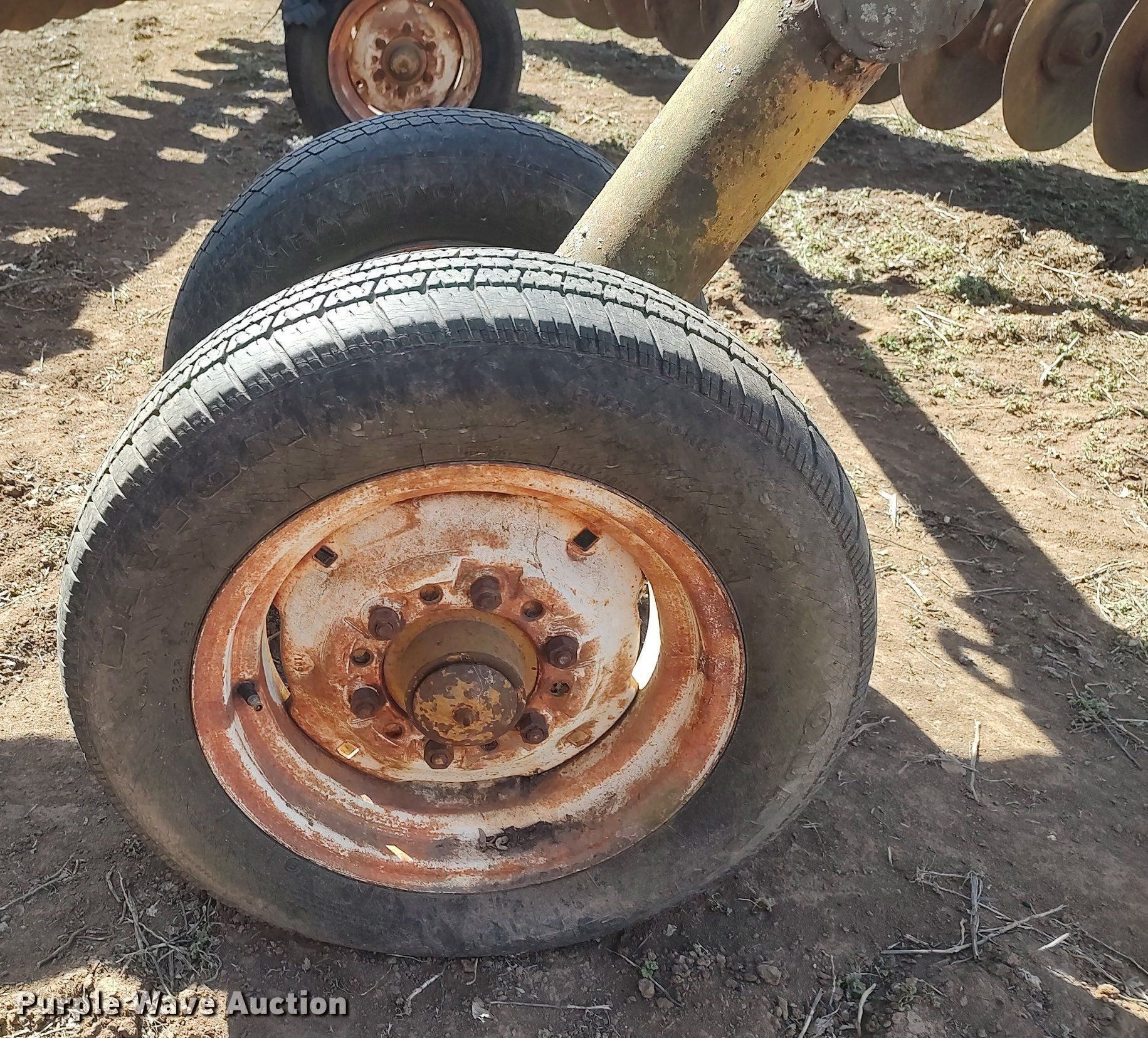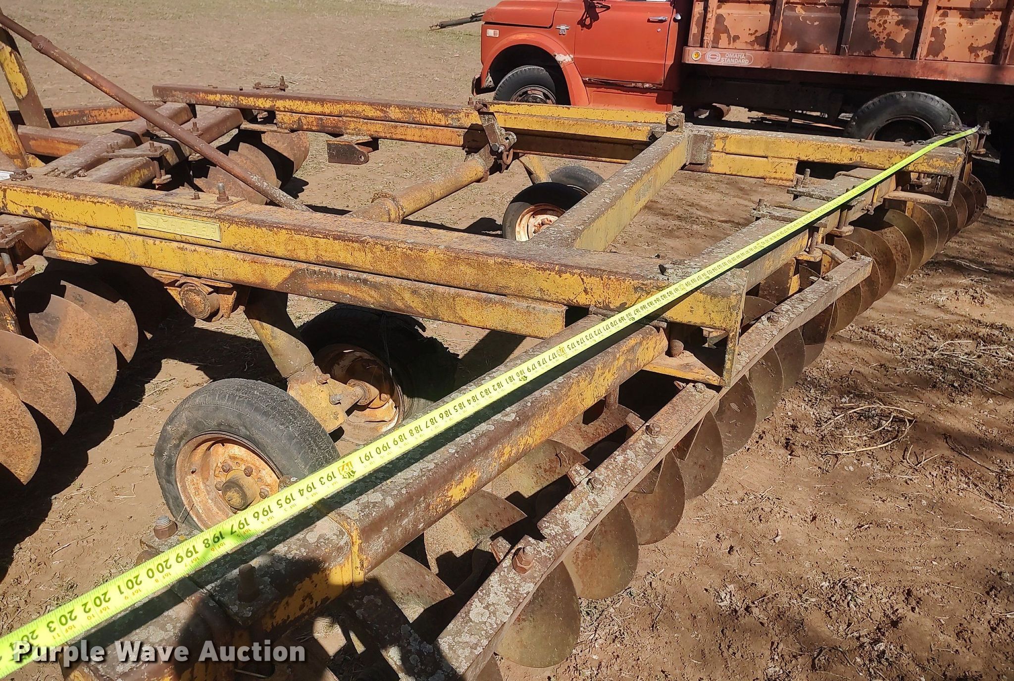 Schafer off-set disk. Overall width: 16'. Features Front blades Diameter: 18", Spacing: 9", Rear blades Diameter: 14", Spacing: 9", Operation Leveler: Manual. Tires Tire size: 175/70R14. 1218 S. Hoover. Wellington, KS 67152