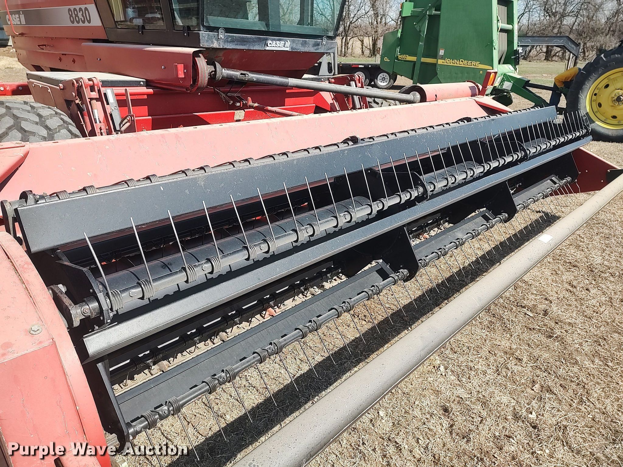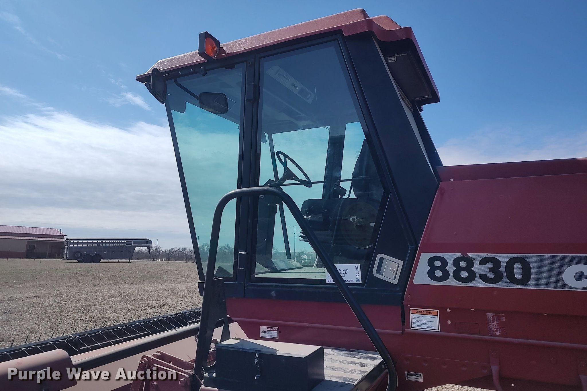 1996 Case IH 8830 swather / windrower. Engine hours: 1,350 on meter, Serial: CFH0101125. Engine Case 4-390, Cylinders: 4, Fuel type: Diesel. Transmission Hydrostatic. Operators station AC, Heat. Features Head Sickle, Case IH 8830, Serial: CFH0121004, Width: 14', Hydraulic head tilt, Conditioners: Steel/ steel. Tires Front: 21.5L-16.1, Rear: 7.60-15. Massey Farm Retirement. Wichita, KS 67217