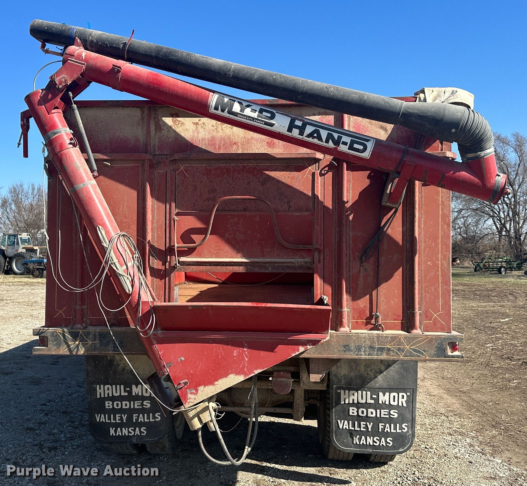 1966 Ford F750 grain truck. Miles: 11,905 on odometer, VIN: F75EU795498. Engine Ford, Cylinders: 8, Fuel type: Gas, HP: 182. Transmission Manual, Speed: 5, plus 2. Chassis Axles: Single, Suspension: Spring, Brakes: Hydraulic, GVWR: 22,500 lbs, Wheelbase: 174". Interior Heat. Features Dump bed 18' L x 97" W, Side height: 58", Bed type: Steel, Roll tarp, Ram: Single , End gate: Manual, Auger diameter: 5", Auger conveyor length: 12'. Tires Front: 10.00-20, Rear: 9.00-20. Notes Cracked glass. Kansas antique title. Mayetta, KS 66509