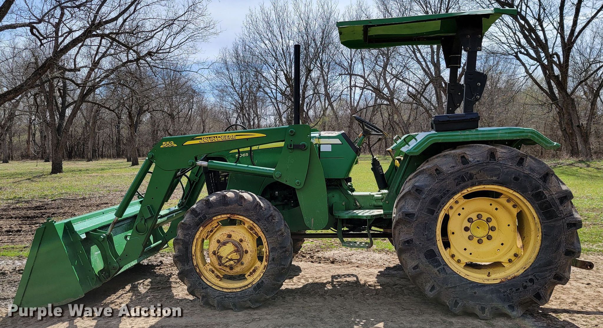 John Deere 5065E MFWD tractor. Hours: 758 on meter, Serial: 1PY5065EJAB003525. Engine John Deere Powertech 3029H, Displacement: 2.9L, Cylinders: 3, Fuel type: Diesel, HP: 65. Transmission Synchro, 9F - 3R, Differential lock. Features PTO: 540, Three point, Hydraulic remote sets Rear: 1, Loader John Deere 553, Controls: Joystick, Bucket Width: 72".. Tires Front: 9.5-24, Rear: 16.9-28, Wheelbase: 80". Oologah, OK 74053