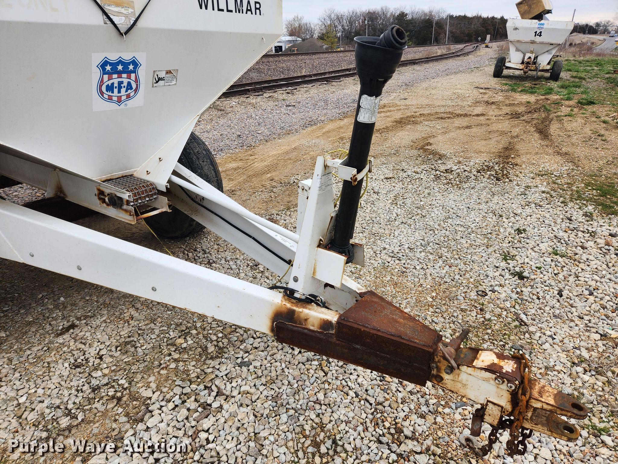 Willmar Super 600 fertilizer spreader. Features. PTO: 540, Dry fertilizer spreader Dual spinners, Roll tarp, Ground drive, Conveyor belt Width: 7".. Tires Size: 16.5L-16.1SL, Flotation tires. MFA Inc.. Saint Clair, MO 63077
