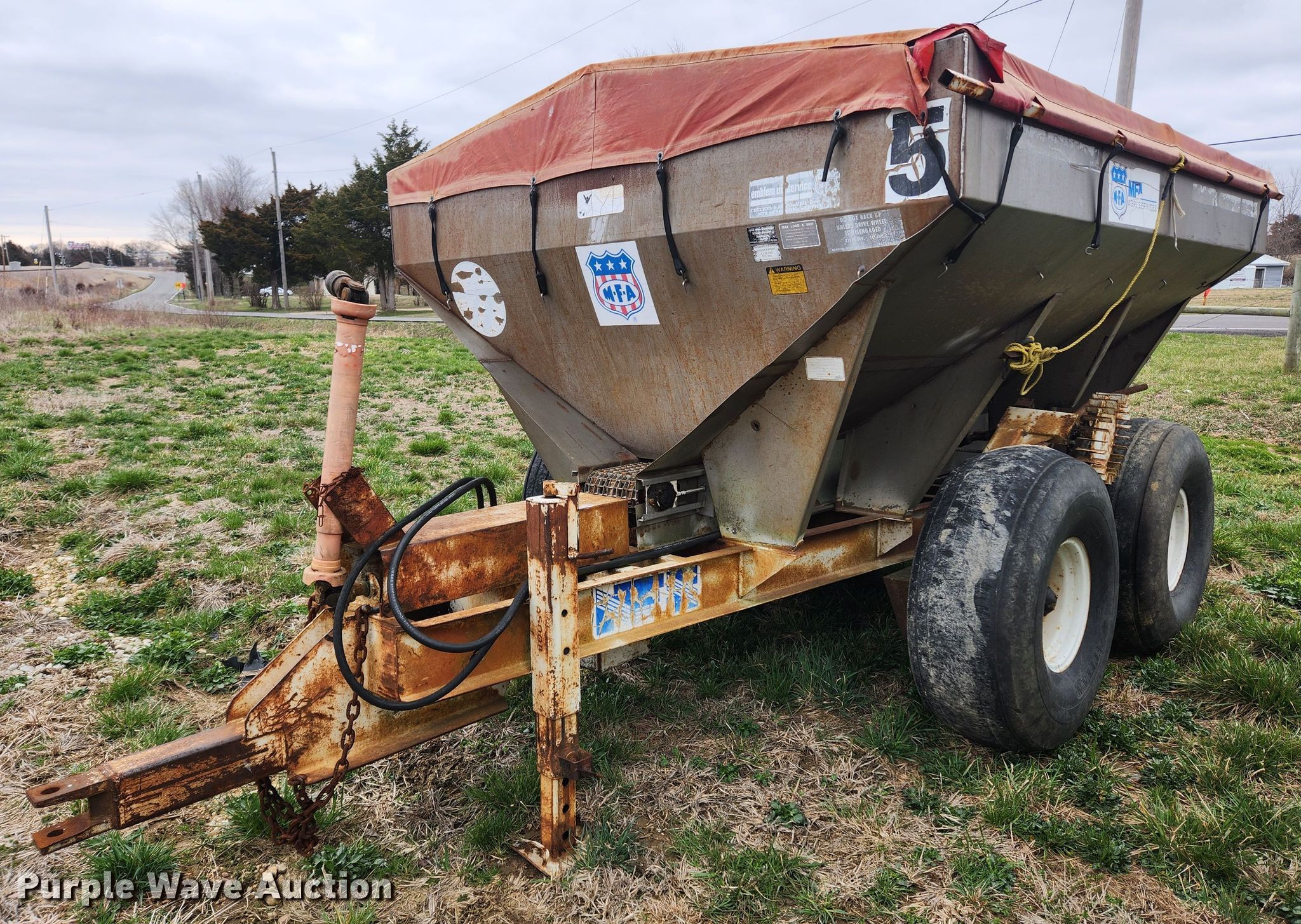 Tyler fertilizer spreader. Features. PTO: 540, Dry fertilizer spreader Stainless steel, Roll tarp, Ground drive, Conveyor belt Width: 10".. Tires Size: 15.5L-16.1SL, Flotation tires. MFA Inc.. Saint Clair, MO 63077