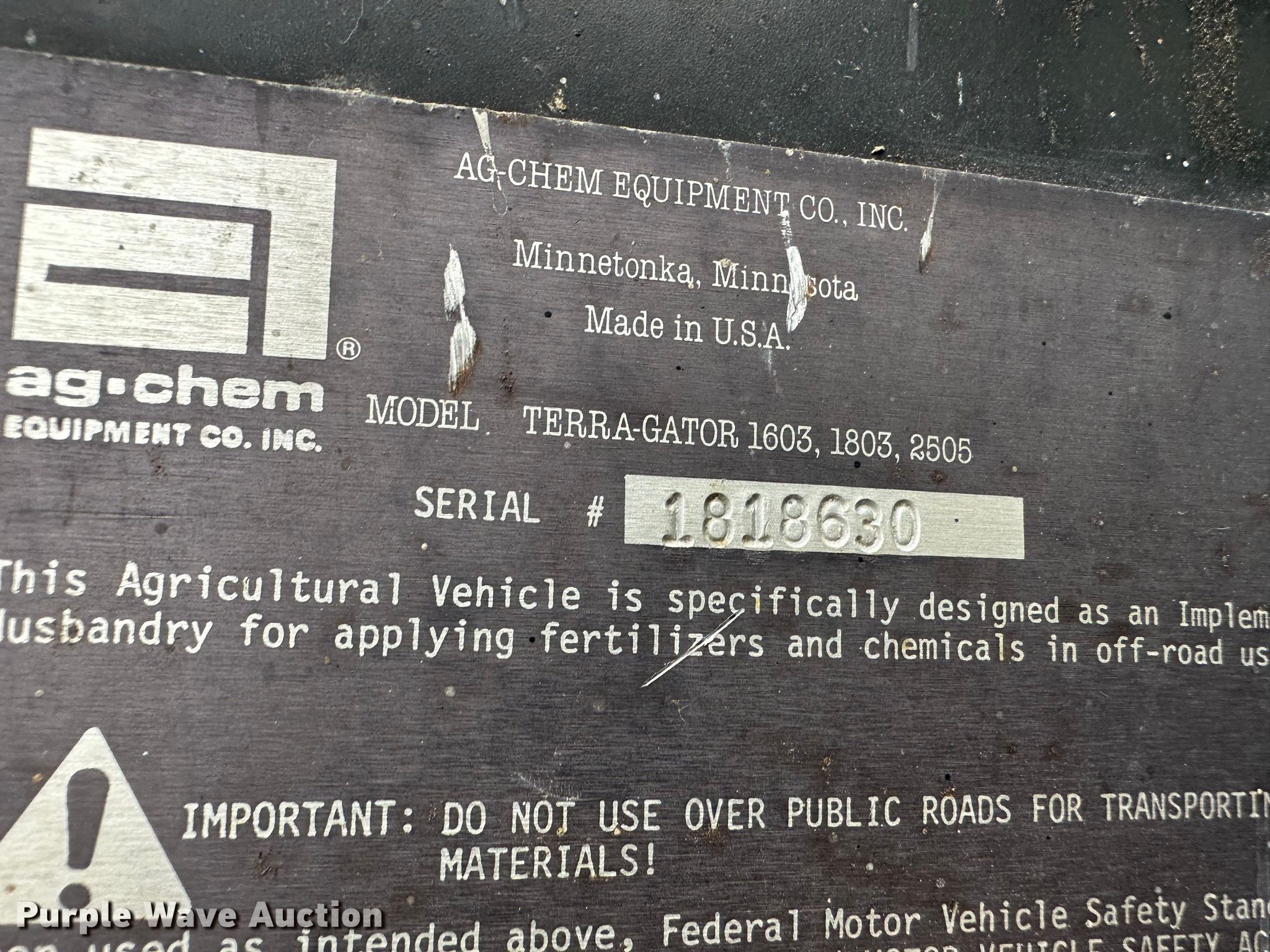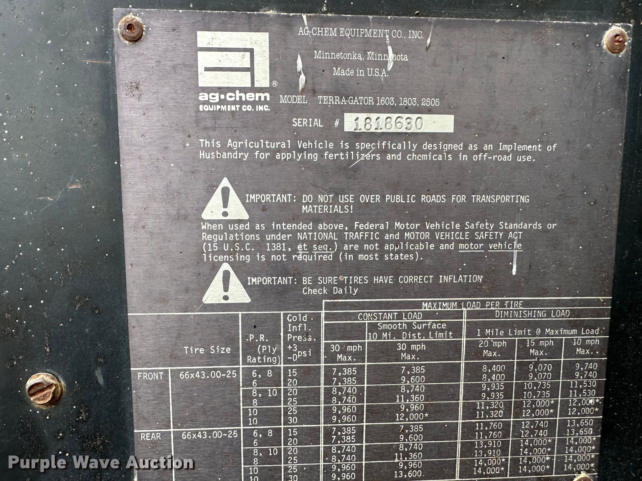 Purple Wave is selling a used Applicator Self Propelled in Missouri. This item is a Ag-Chem TerraGator 1803 applicator with the following: Miles: 43,202 on odometer, Serial: 1818630