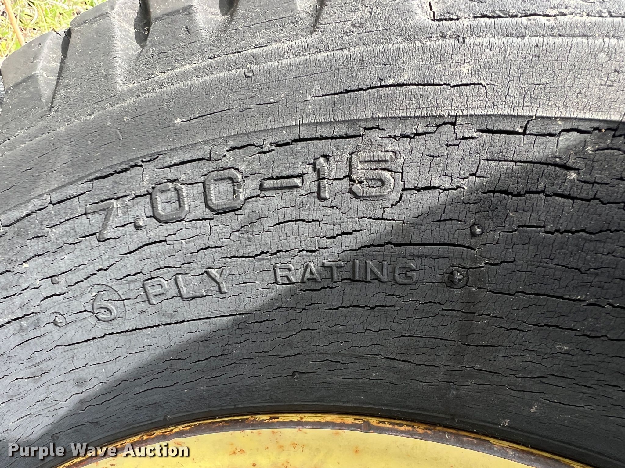 John Deere plow. Overall width: 13'. Features Hitch: Three point. Tires Tire size: 7.00-15. Works Farms. 720 600th Street. Humboldt, KS 66748