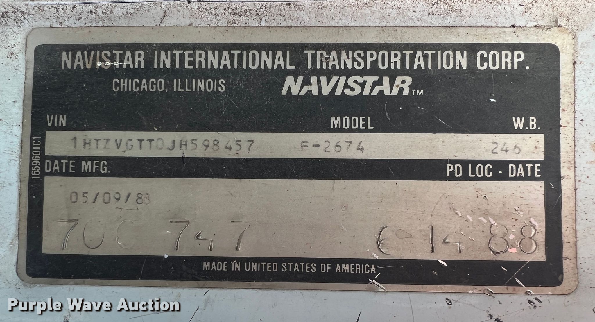 1988 International F2674 feed delivery truck. Miles: 797,042 on odometer, VIN: 1HTZVGTT0JH598457. Engine Cummins, Displacement: 14.0L, Cylinders: 8, Fuel type: Diesel. Transmission Manual, Speed: plus 2. Chassis Axles: Tandem, Suspension: Air, Brakes: Air, PTO. Interior Heat. Features Delivery bed 19' L, Compartments: 5, Discharge auger Diameter: 12", Length: 20', Side, Ground controls. Tires Size: 11R22.5. Kansas title. Title distribution may be delayed up to 14 days from verification of funds. F & L TRUCK TRAILER. Joplin, MO 64801