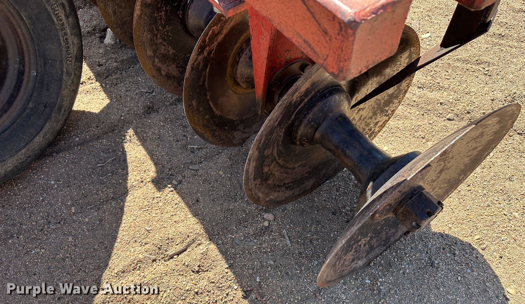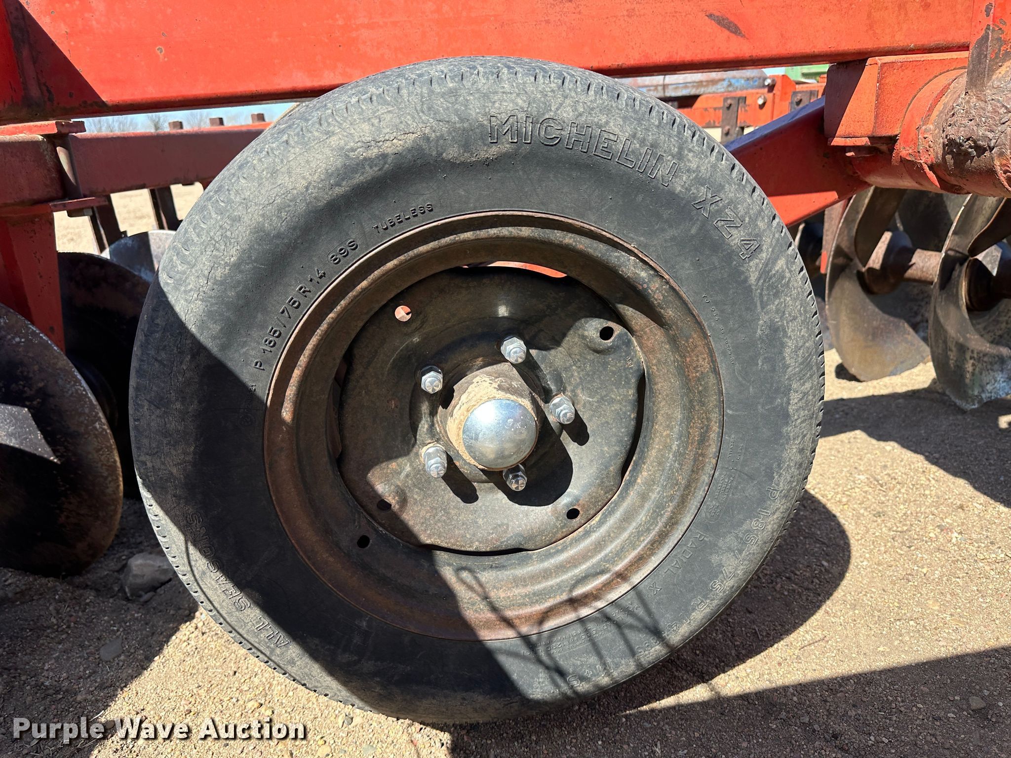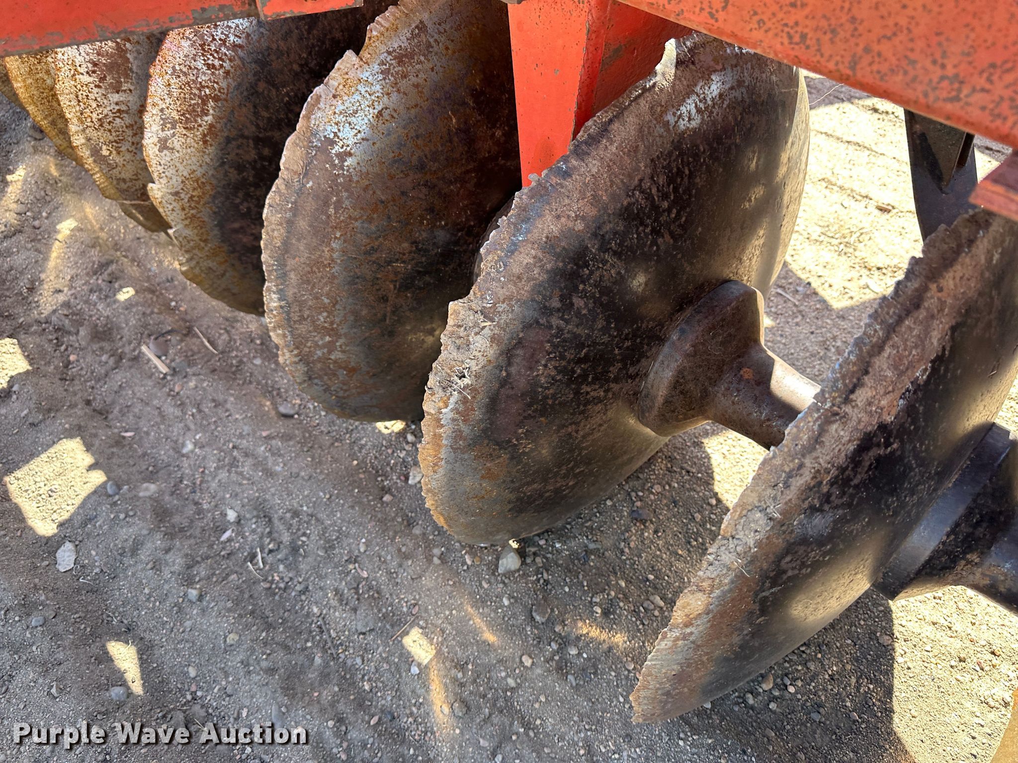 Miller off-set disk. Overall width: 18', Serial: 1B4162. Features Front blades Diameter: 23", Spacing: 9", Rear blades Diameter: 18", Spacing: 9", Disk scrapers, Operation Hydraulic lift, Leveler: Manual. Tires Tire size: 9.5L-14. 1137 90th Ave. Kinsley, KS 67547