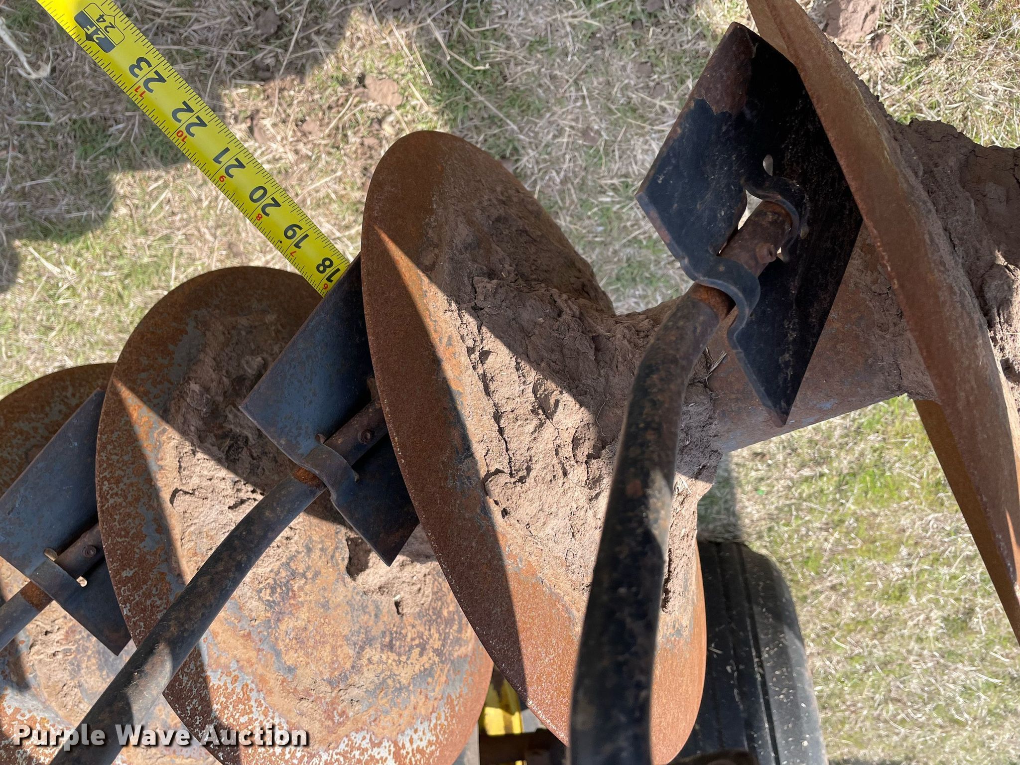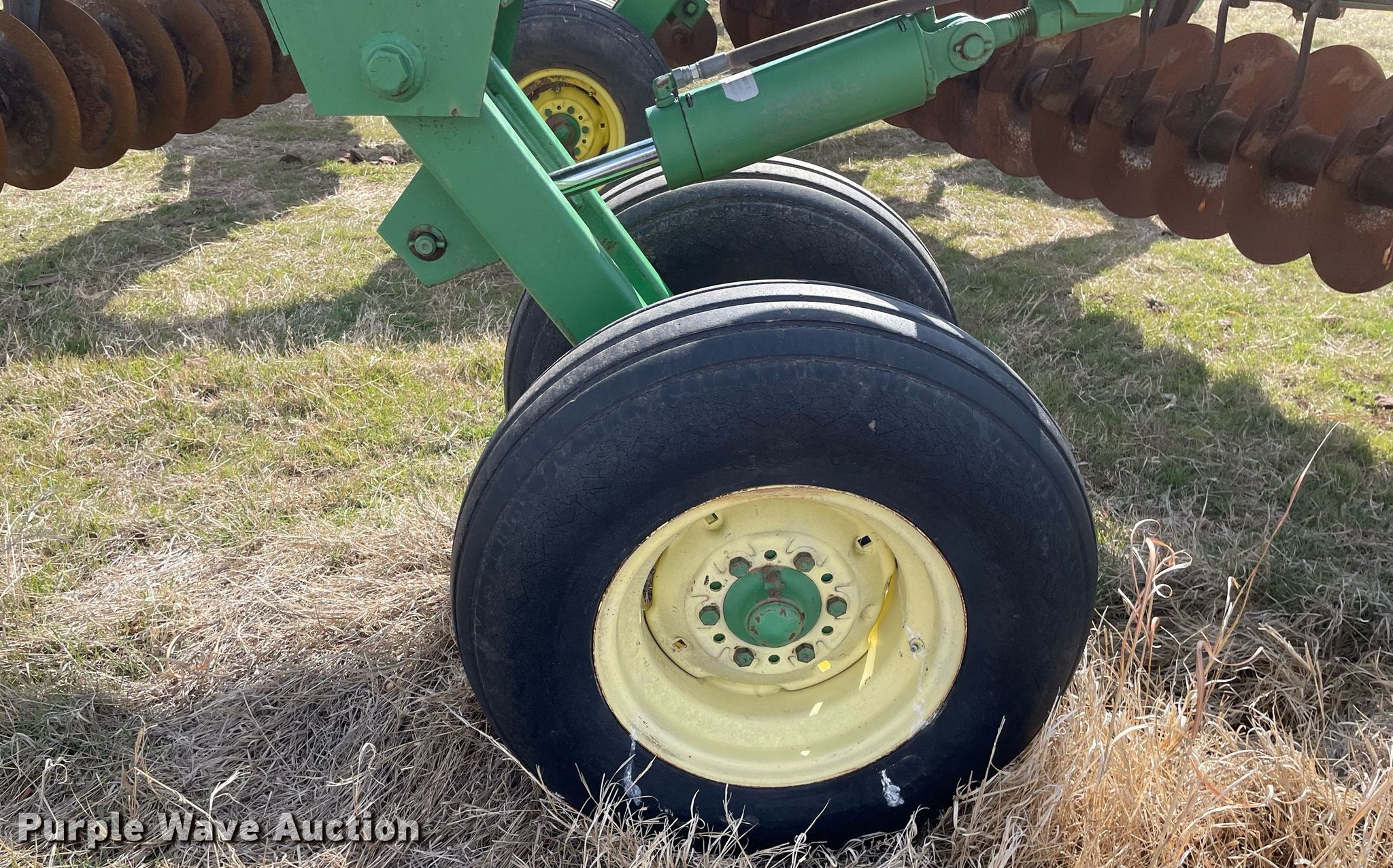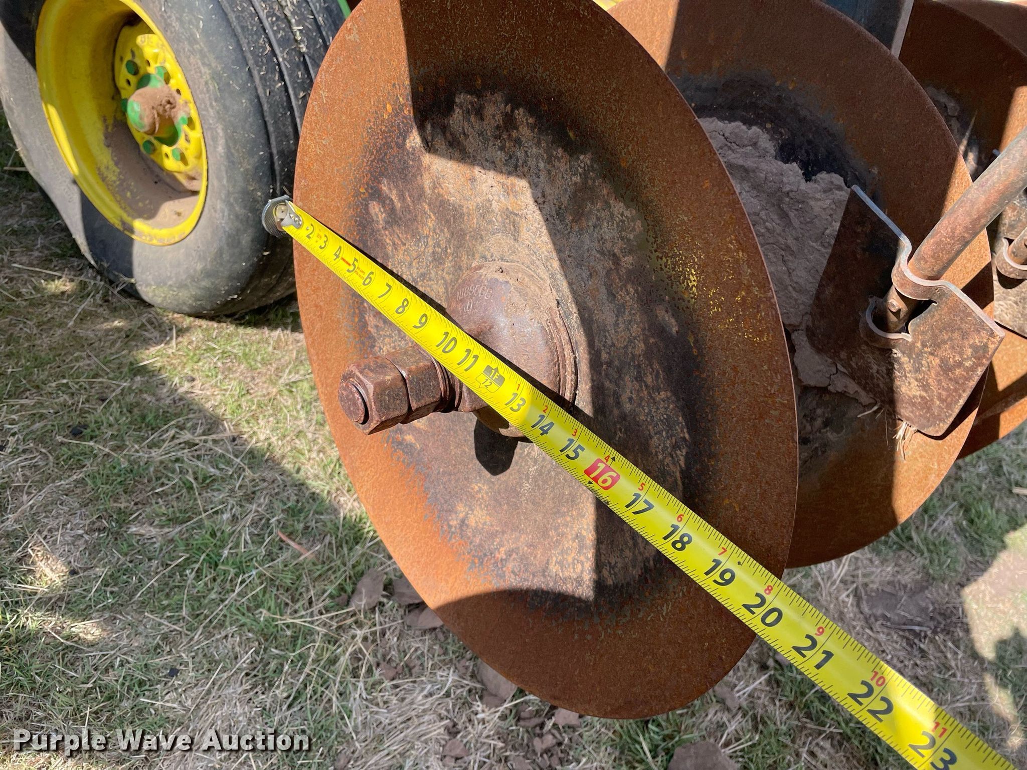 John Deere 630 tandem disk. Overall width: 30', Serial: N00630X008123. Features Front blades Diameter: 20", Spacing: 9", Rear blades Diameter: 20", Spacing: 9", Disk scrapers, Operation Hydraulic lift, Hydraulic fold, Leveler: Manual. Tires Tire size: 11L-15. Notes Tractor not included. Ayres Farm. Norwich, KS 67118