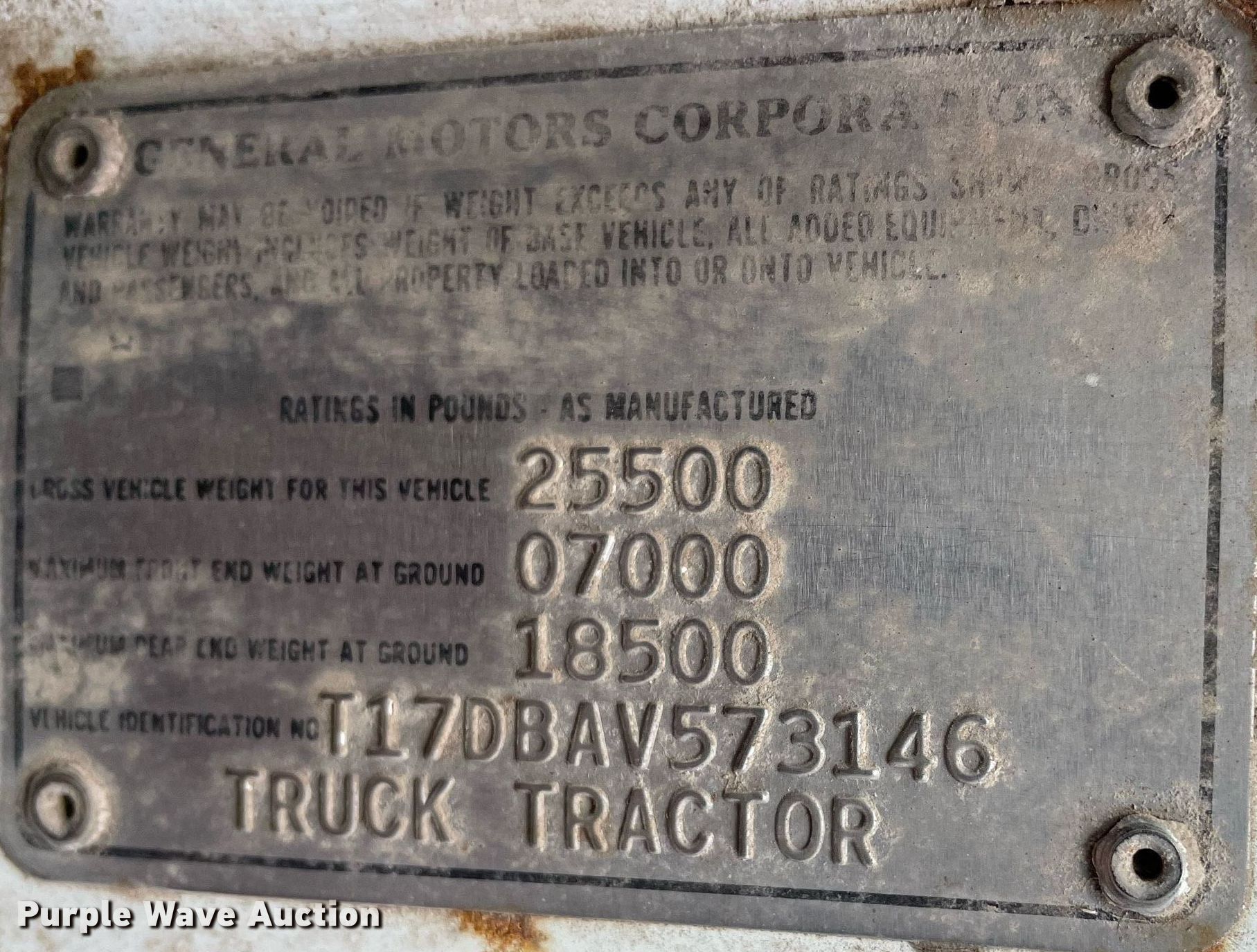 Purple Wave is selling a used Truck Tractor in Kansas. This item is a 1980 GMC 6000 semi truck with the following: Miles: 43,035 on odometer, VIN: T17DBAV573146