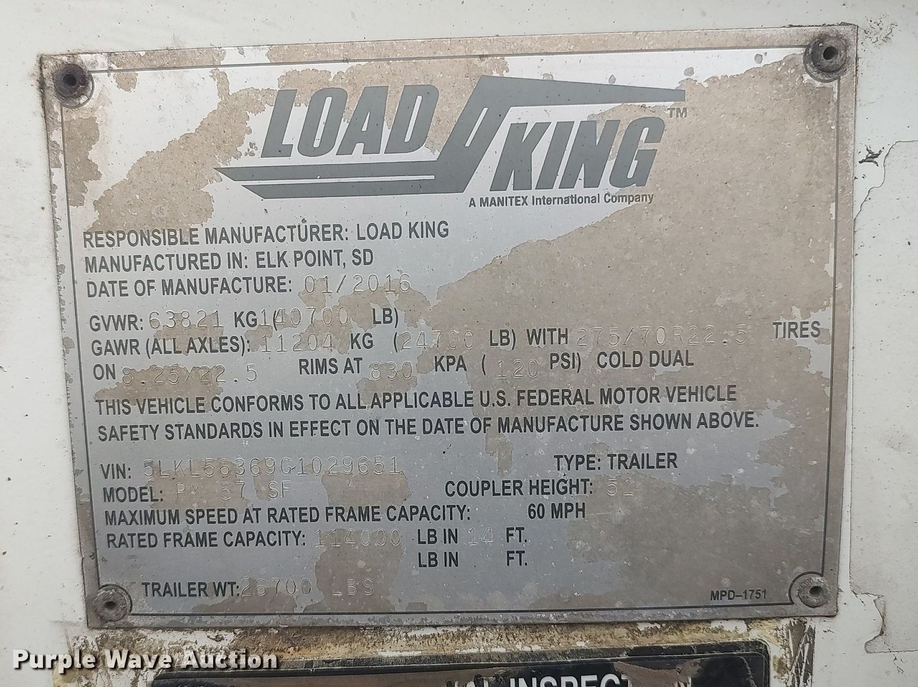Purple Wave is selling a used Equip. Trailer in Kansas. This item is a 2016 Load King equipment trailer with the following: VIN: 5LKL56369G1029651
