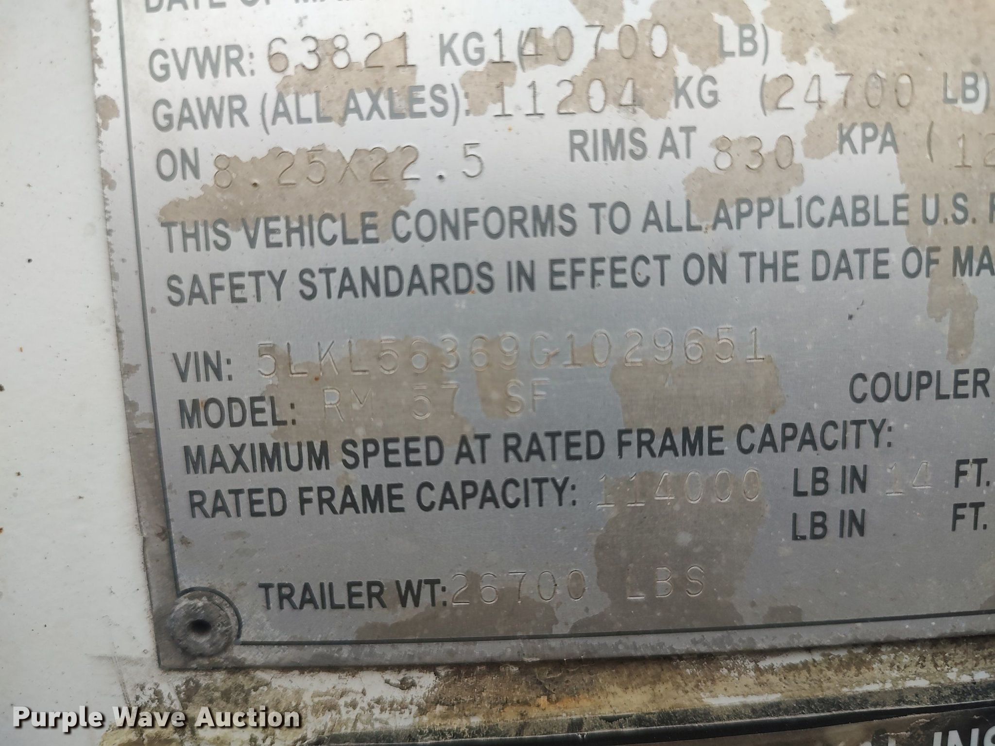 2016 Load King equipment trailer. VIN: 5LKL56369G1029651. Dimensions Overall: 54' L x 102" W, Deck: 30' 6" L x 102" W, Rear deck length: 12' 6", Ramps: Manual. Features Deck type: Wood, Outriggers: Swing-out Board size: 12", Self-contained hydraulics, Hydraulic controls: Manual. Chassis Suspension: Air, Brakes: Air, Axles: Triple, GVWR: 40,700 lbs, GAWR: 24,700 lbs. Tires Steel wheels, Size: 275/70R22.5. Notes Tire damage, Stinger axle not included. Kansas title. Title distribution may be delayed up to 30 days from verification of funds. Mies Construction. 1919 Sw Blvd.. Wichita, KS 67213