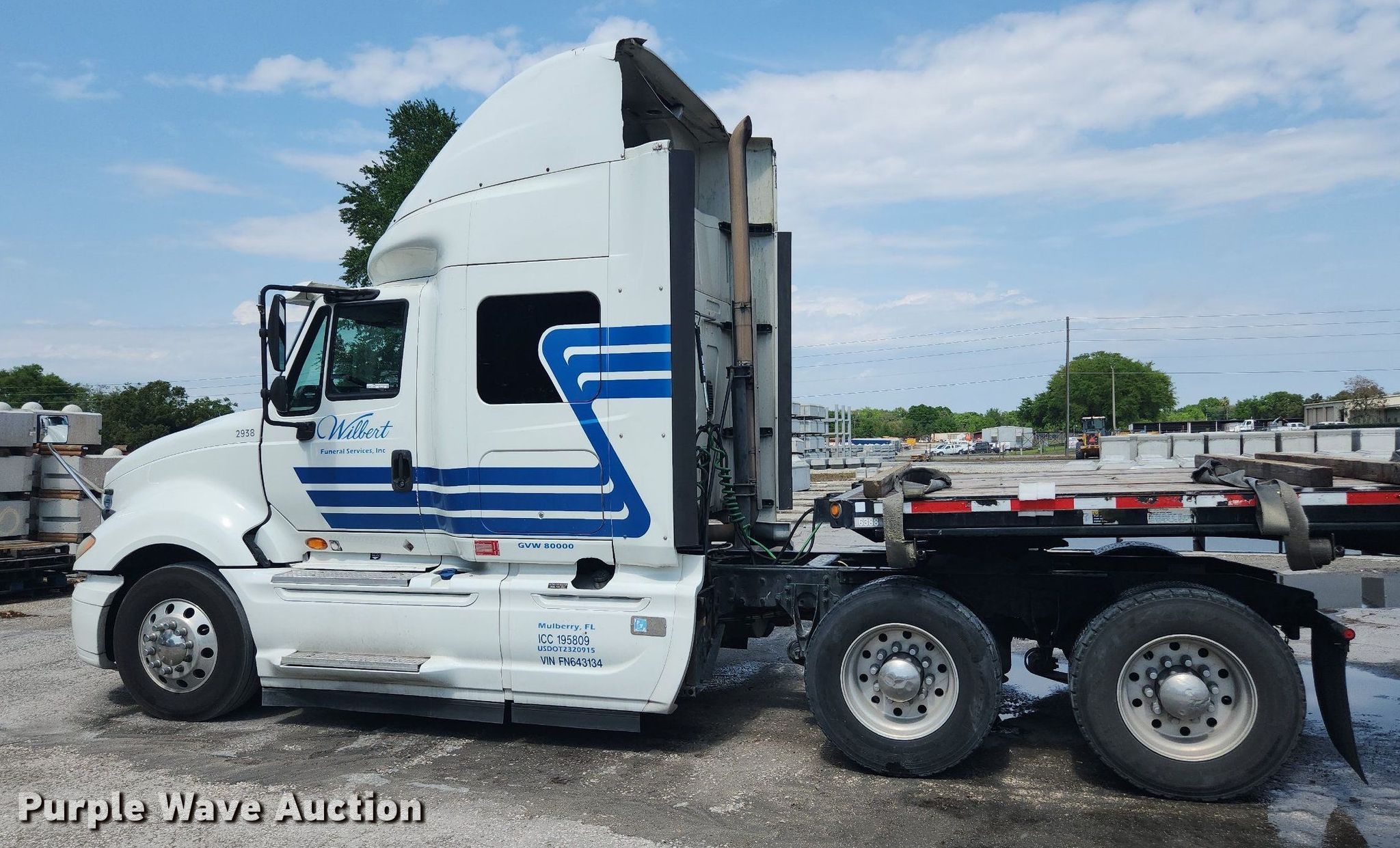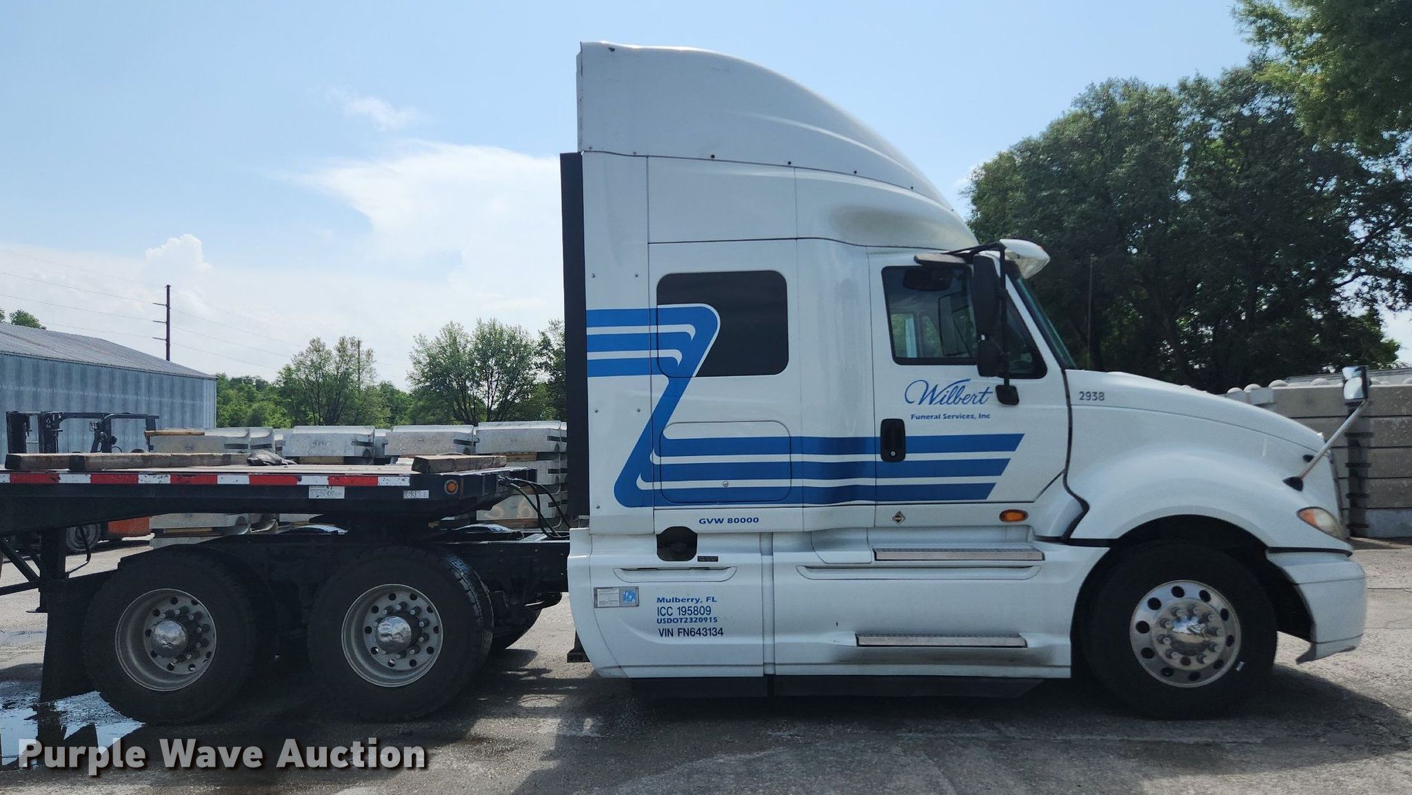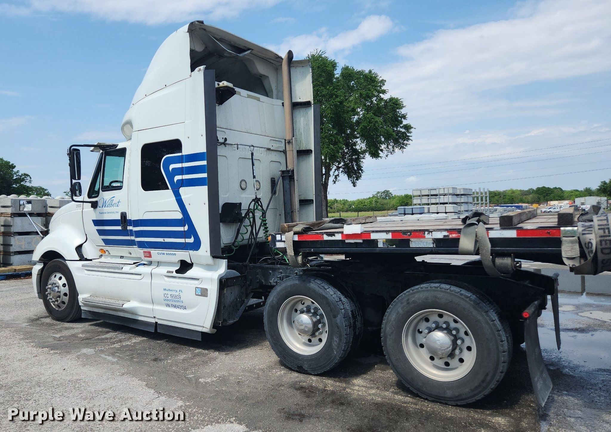 2015 International ProStar semi truck. Miles: 524,273 on odometer, Hours: 11,929 on meter, VIN: 3HSDJAPR1FN643134, Unit #: 2938. Engine Cummins ISX15, Displacement: 14.9L, Cylinders: 6, Fuel type: Diesel, HP: 450, Engine brake. Transmission Automatic. Chassis Axles: Tandem, Suspension: Air Dump valves, Brakes: Air, GVWR: 46,350 lbs FAWR: 12,350 lbs, IAWR: 17,000 lbs, RAWR: 17,000 lbs. Interior AC, Heat, Heated mirrors, Cruise control, Air ride cab, Sleeper Sleeper length: 48", Beds: Single, Rear climate control. Features Fifth wheel type: Fixed, Fuel tank: Dual. Tires Front: 275/80R22.5, Rear: 445/50R22.5. Notes Trailer not included. Florida title. Title distribution may be delayed up to 14 days from verification of funds. Wilbert Funeral Services. 27439 Haywood Worm Farm Road. Okahumpka, FL 34762