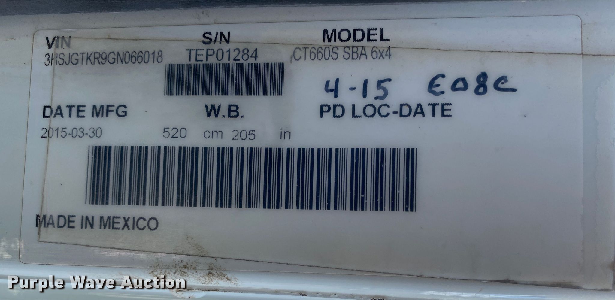 2016 Caterpillar CT660 semi truck. Miles: 201,565 on odometer, Hours: 7,554 on meter, VIN: 3HSJGTKR9GN066018. Engine Displacement: 13.0L, Cylinders: 6, Fuel type: Diesel, Engine brake. Transmission Eaton Fuller, Manual, Speed: 18. Chassis Axles: Tandem, Differential lock: Inter-axle, Suspension: Air Dump valves, Brakes: Air, PTO, GVWR: 53,200 lbs FAWR: 13,200 lbs, IAWR: 20,000 lbs, RAWR: 20,000 lbs. Interior AC, Heat, Power windows, Power locks, Cruise control, Air ride cab. Features Deck plate: Aluminum, Fifth wheel type: Air operated, Sliding, Fuel tank: Dual. Tires Size: 11R24.5. Oklahoma title. Title distribution may be delayed up to 14 days from verification of funds. 15107 North 137th East Avenue. Collinsville, OK 74021