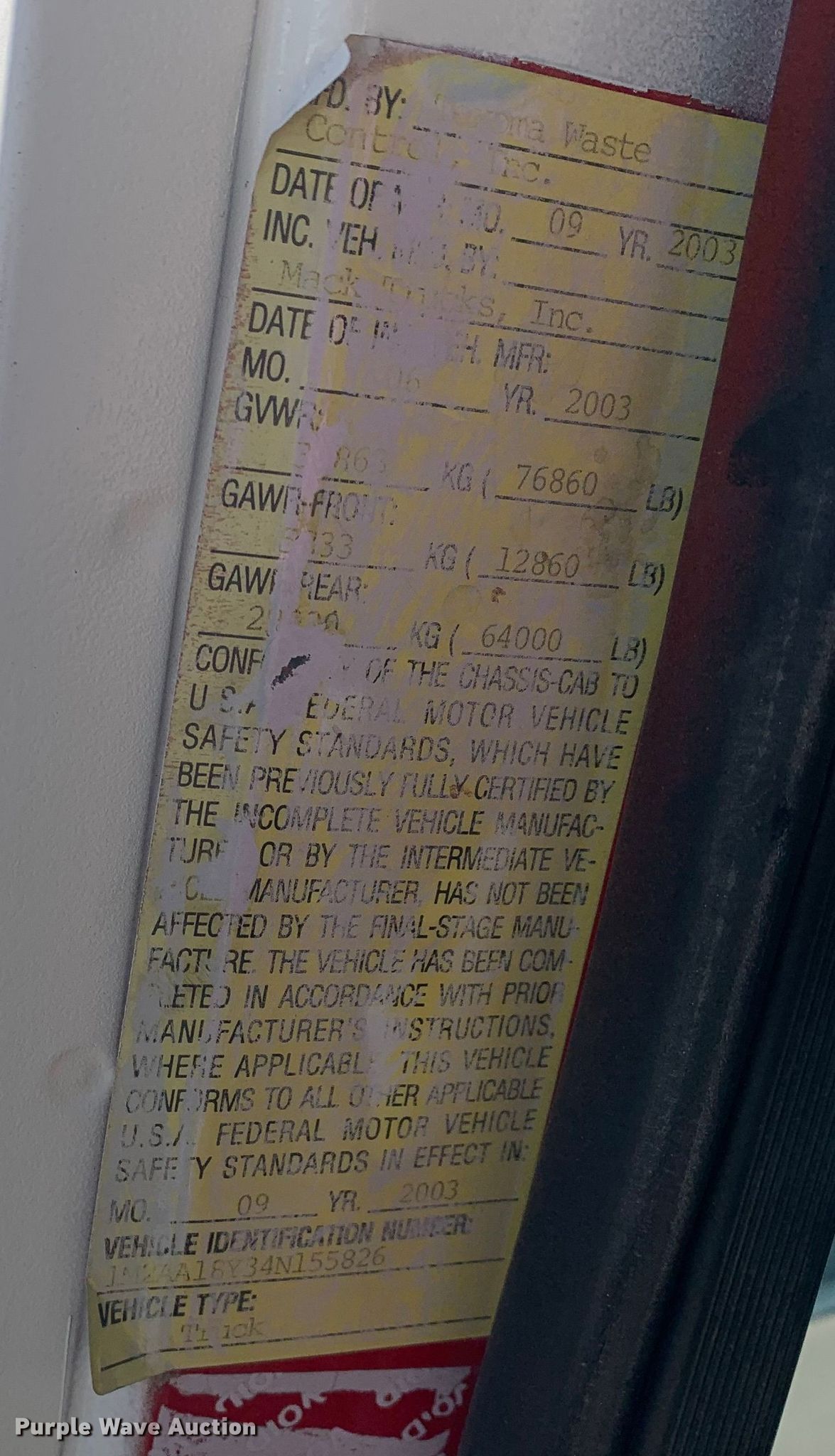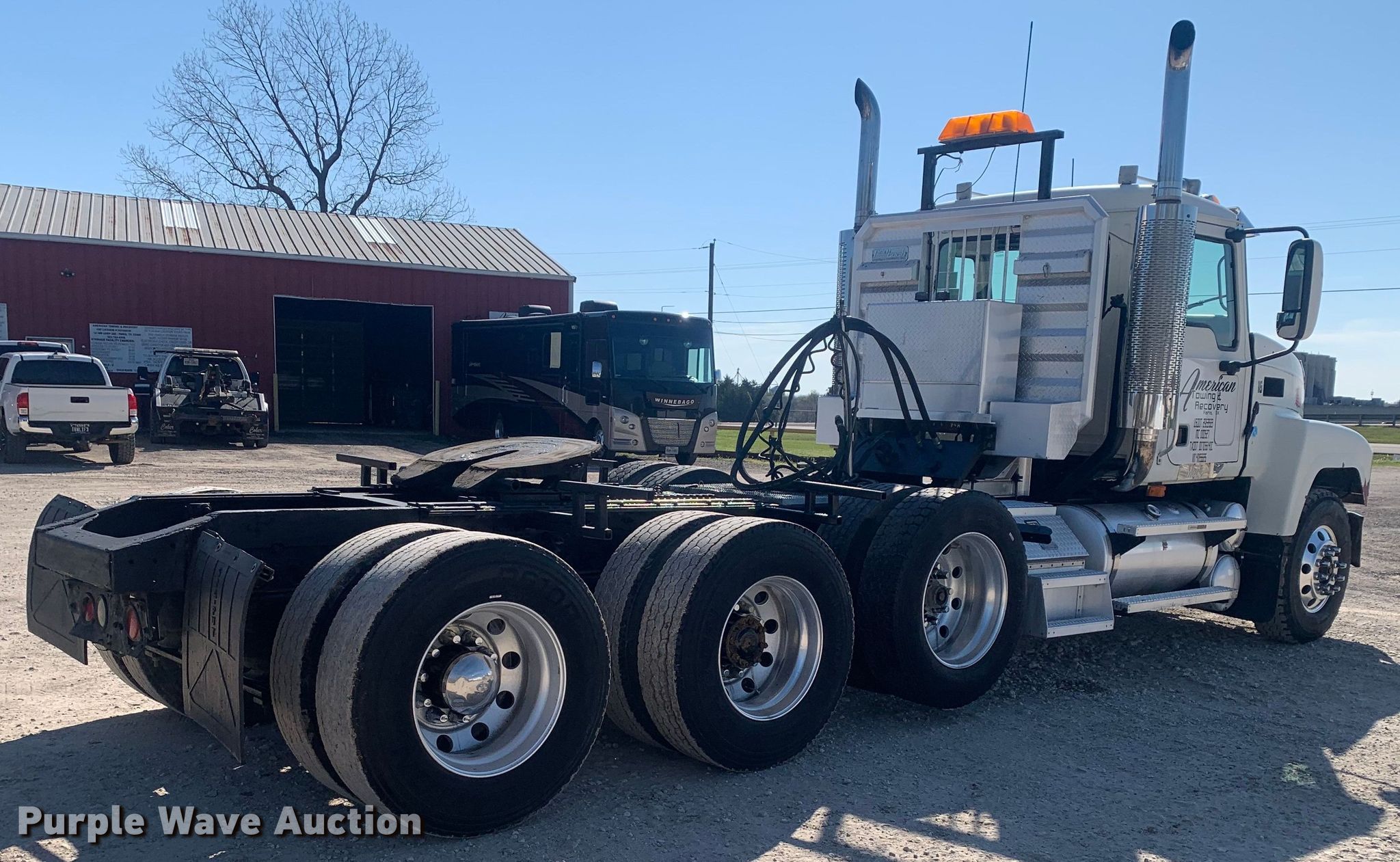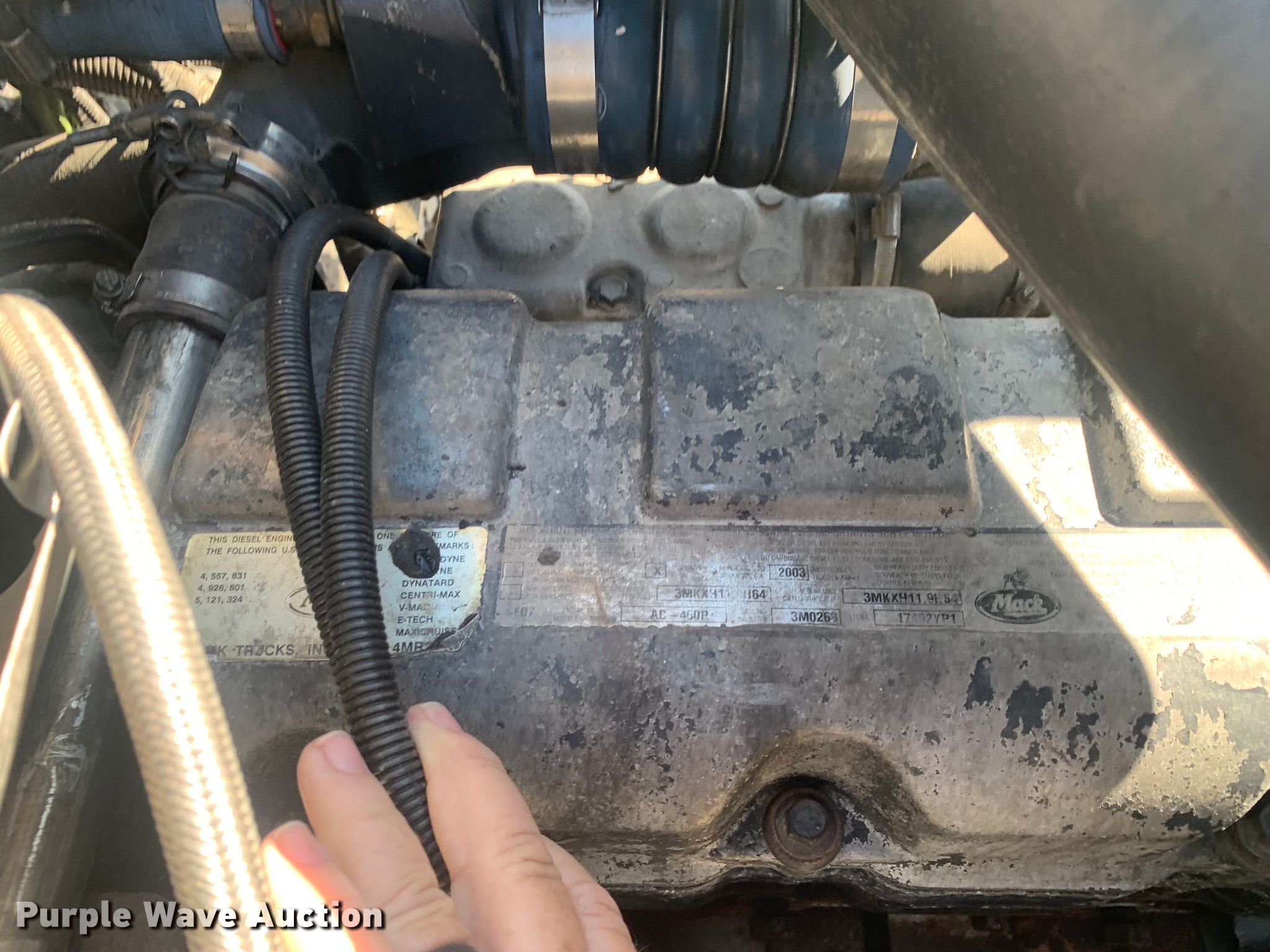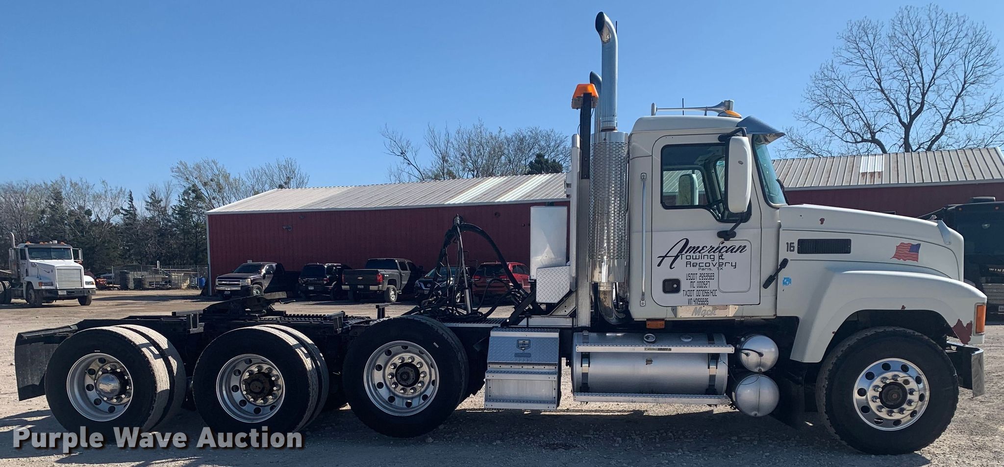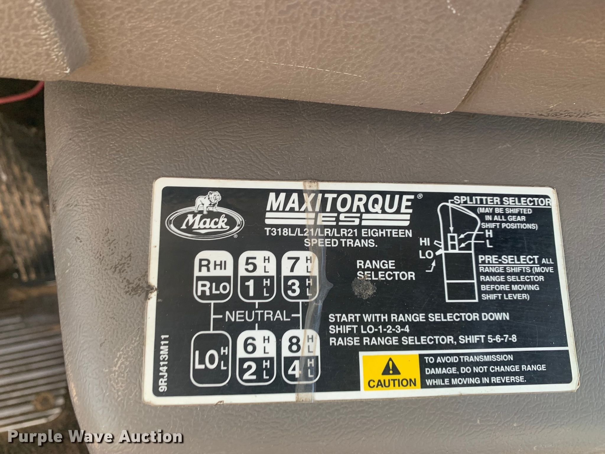 2004 Mack CH613 semi truck. Miles: 377,668 on odometer, Hours: 14,353 on meter, VIN: 1M2AA18Y34N155826. Engine Mack AC-460P, Displacement: 12.0L, Cylinders: 6, Fuel type: Diesel, Engine brake. Transmission Mack Maxitorque ES, Manual, Speed: 18. Chassis Axles: Triple, Pusher axle, Differential lock: Inter-axle, Suspension: Air, Brakes: Air, PTO, Wet kit, GVWR: 76,860 lbs FAWR: 12,860 lbs, RAWR: 64,000 lbs. Interior AC, Heat, Heated mirrors, Power locks, Cruise control, Air ride cab. Features Deck plate: Aluminum, Fifth wheel type: Air operated, Sliding, Fuel tank: Dual. Tires Front: 315/80R22.5, Rear: 11R22.5, Lift axle: 285/75R24.5. Notes Dash warning indicator: ABS, Engine shutdown, Electrical fault Engine shutdown and electrical fault lights intermittently display, Windshield chipped or cracked. Texas title. Title distribution may be delayed up to 14 days from verification of funds. American Towing & Recovery. 1840 Northwest Loop 286. Paris, TX 75460