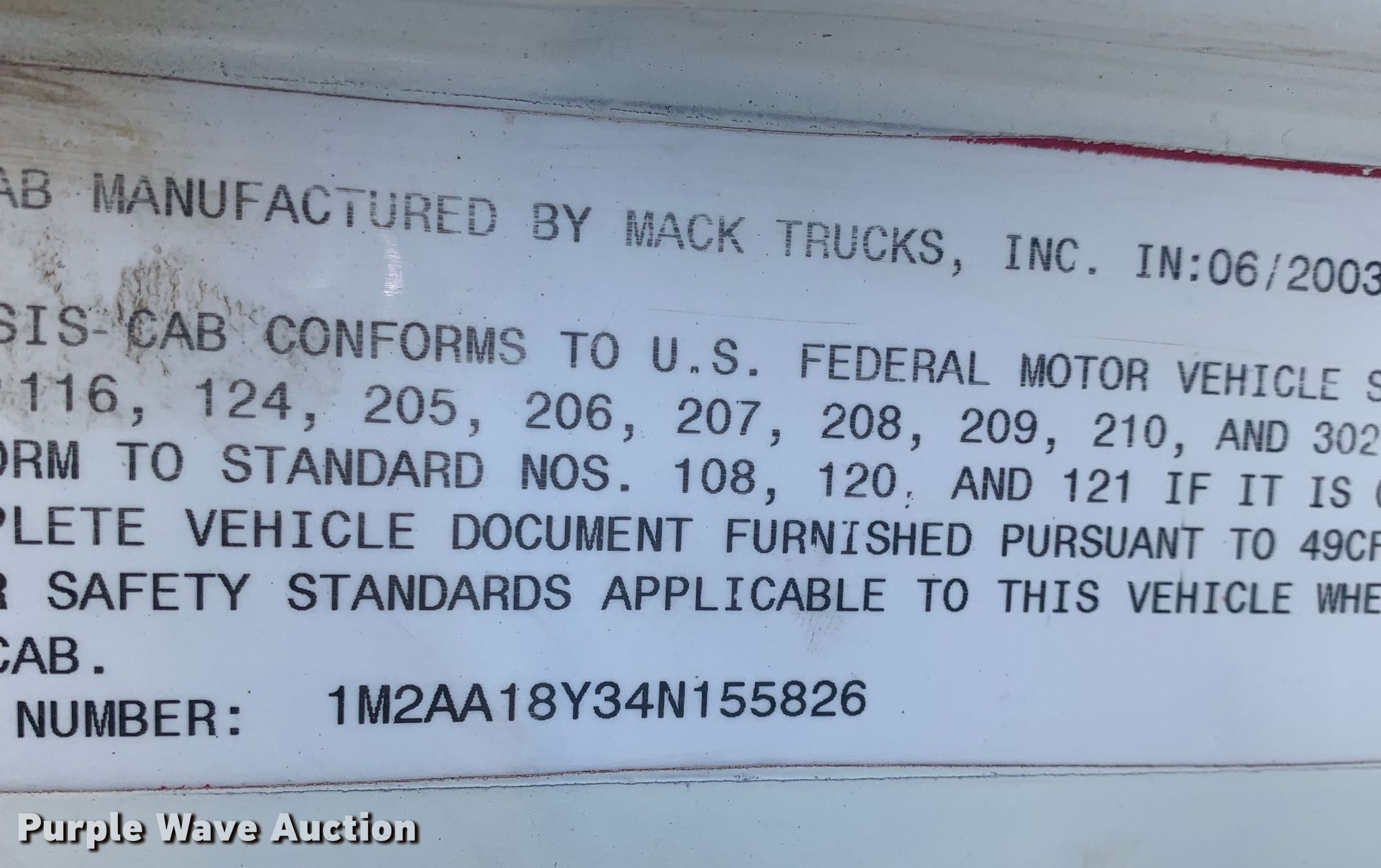 Take a look at this used 2004 Mack CH613 semi truck being sold on April 20th, 2023 in the SOLD! April 20 Truck and Trailer Auction made by Mack. Take a look at all of the item information below or take a look at similar auctions for Trucks.