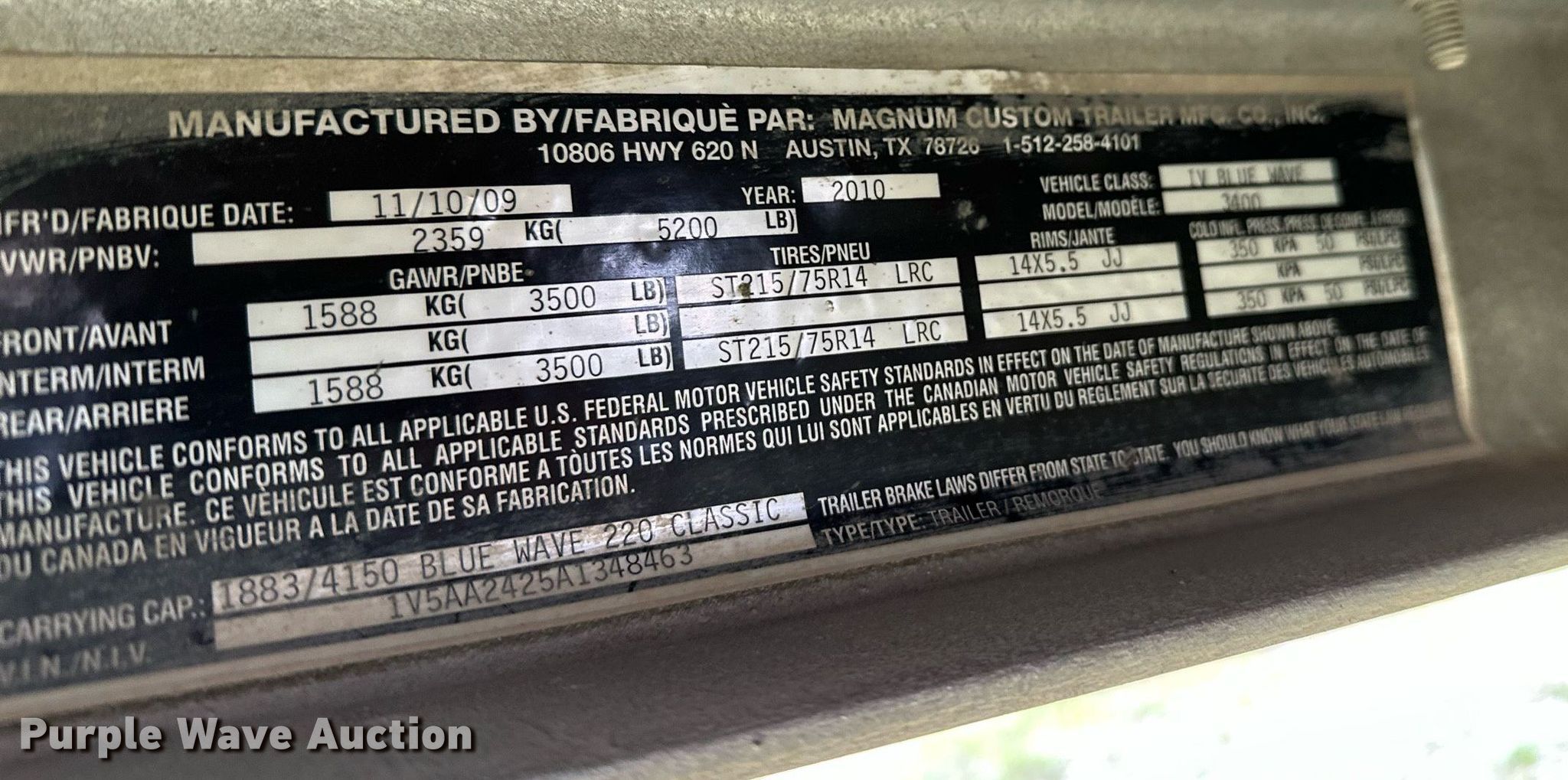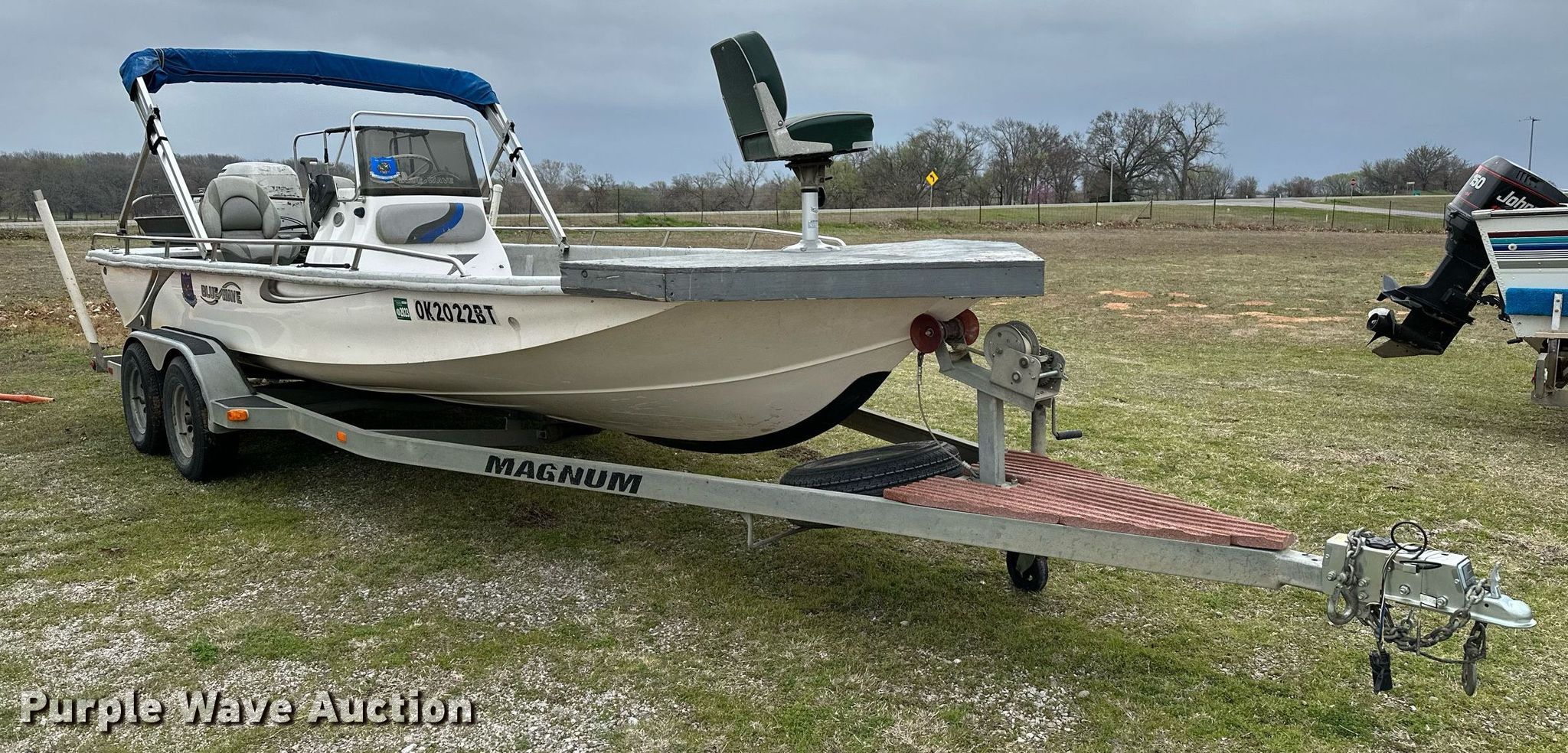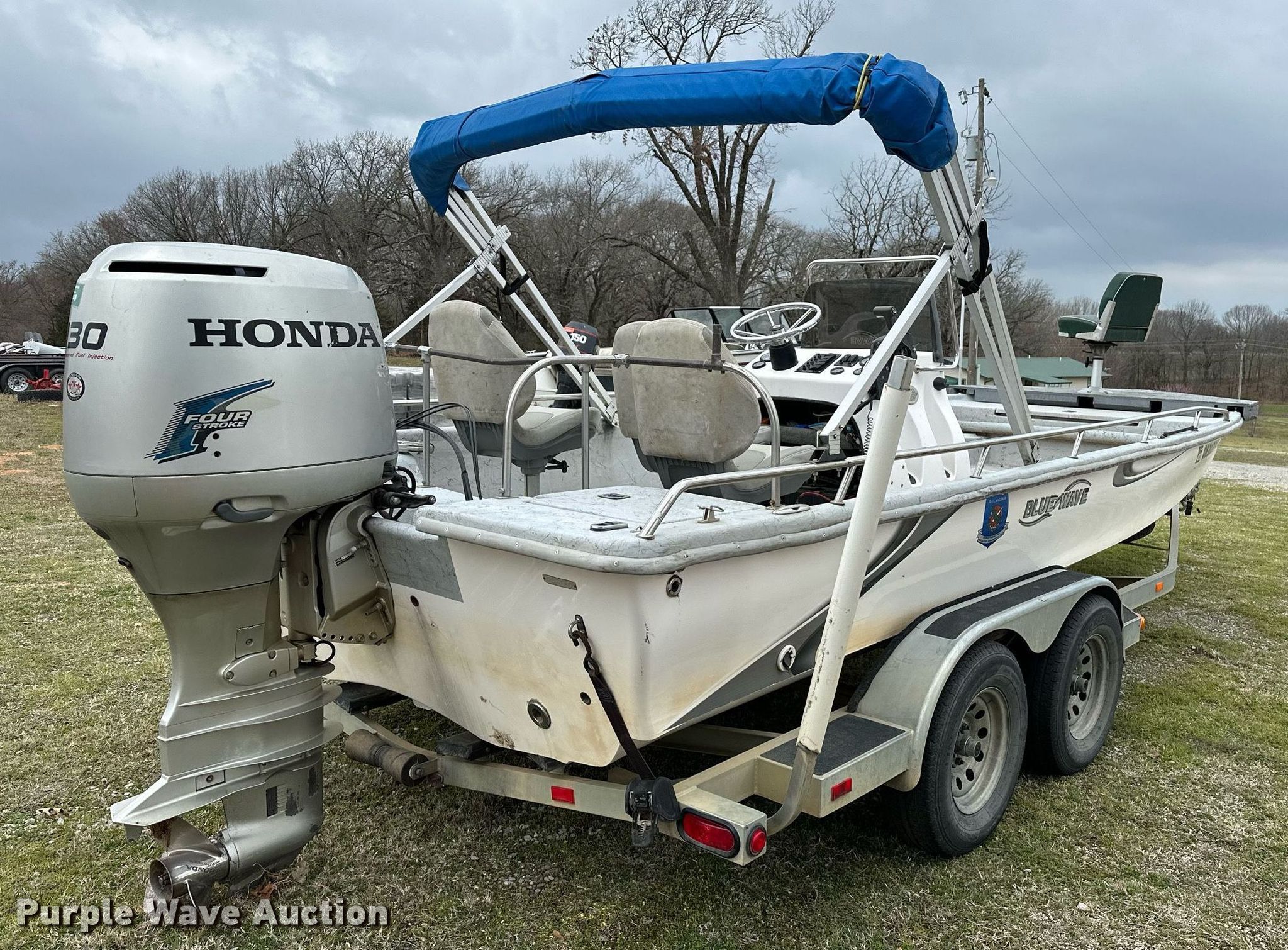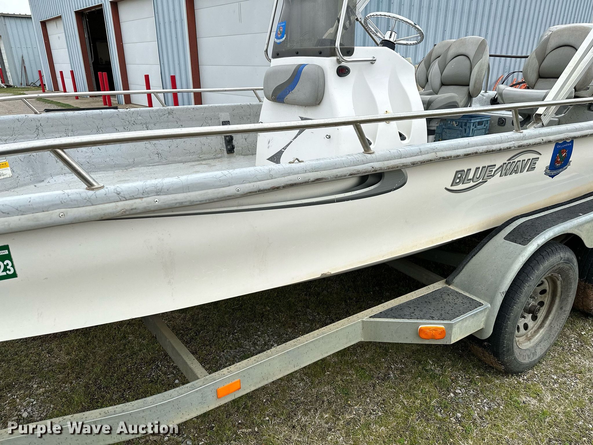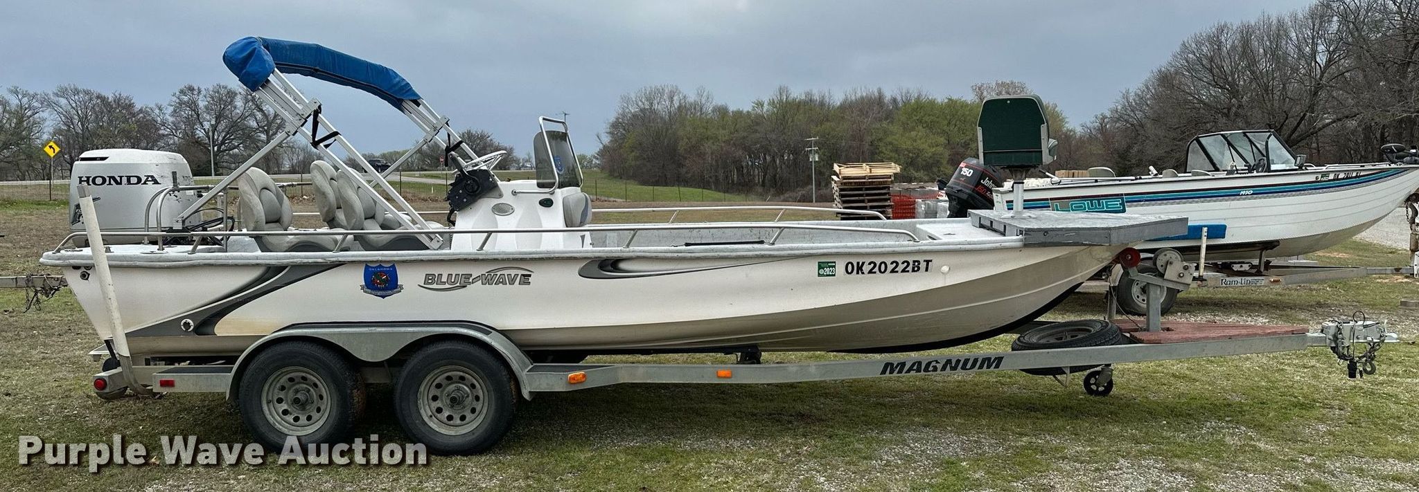 2010 Blue Wave 220 Classic boat. Hours: Unknown, Length: 22', Hull ID: PWV09668K910. Engine Engine type: Outboard, 2003 Honda 130, Serial: 1401207, Cylinders: 4, Fuel type: Gas, HP: 130, Outdrive Propeller: Stainless steel. Operators station Capacity Person: 9, 1,350 lbs. Features Bimini top. Trailer 2010 Magnum 3400, VIN: 1V5AA2425A1348463, Overall length: 26', Overall width: 102", GVWR: 5,200 lbs, Ball hitch size: 2", Axles: Tandem, Tire size: 215/75R14. Notes Contents not included, Dead battery. Boat- Oklahoma title. Motor - Oklahoma title. Trailer - Transfer of ownership documentation will be a bill of sale. Title distribution may be delayed up to 30 days from verification of funds. Oklahoma Department of Wildlife Conservation. 3733 State Highway 48. Holdenville, OK 74848