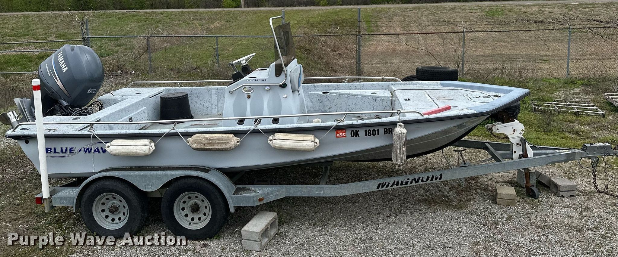 2005 Blue Wave 190 Classic boat. Hours: Unknown, Length: 19', Hull ID: PWV07151G405. Engine Engine type: Outboard, 2004 Yamaha, Serial: 63PL1008430, Cylinders: 4, Fuel type: Gas, Outdrive Propeller: Stainless steel. Operators station Capacity Person: 7, 1,019 lbs. Trailer 2005 Magnum, Overall length: 21', Overall width: 100", Ball hitch size: 2", Axles: Tandem, Tire size: 215/75R14. Notes Dead battery, Non-operational engine, Non-operational unit. Oklahoma boat title. Oklahoma motor title. Transfer of ownership of the trailer will be a bill of sale.. Title distribution may be delayed up to 30 days from verification of funds. Oklahoma Department of Wildlife Conservation. 9097 North 34th Street West. Porter, OK 74454