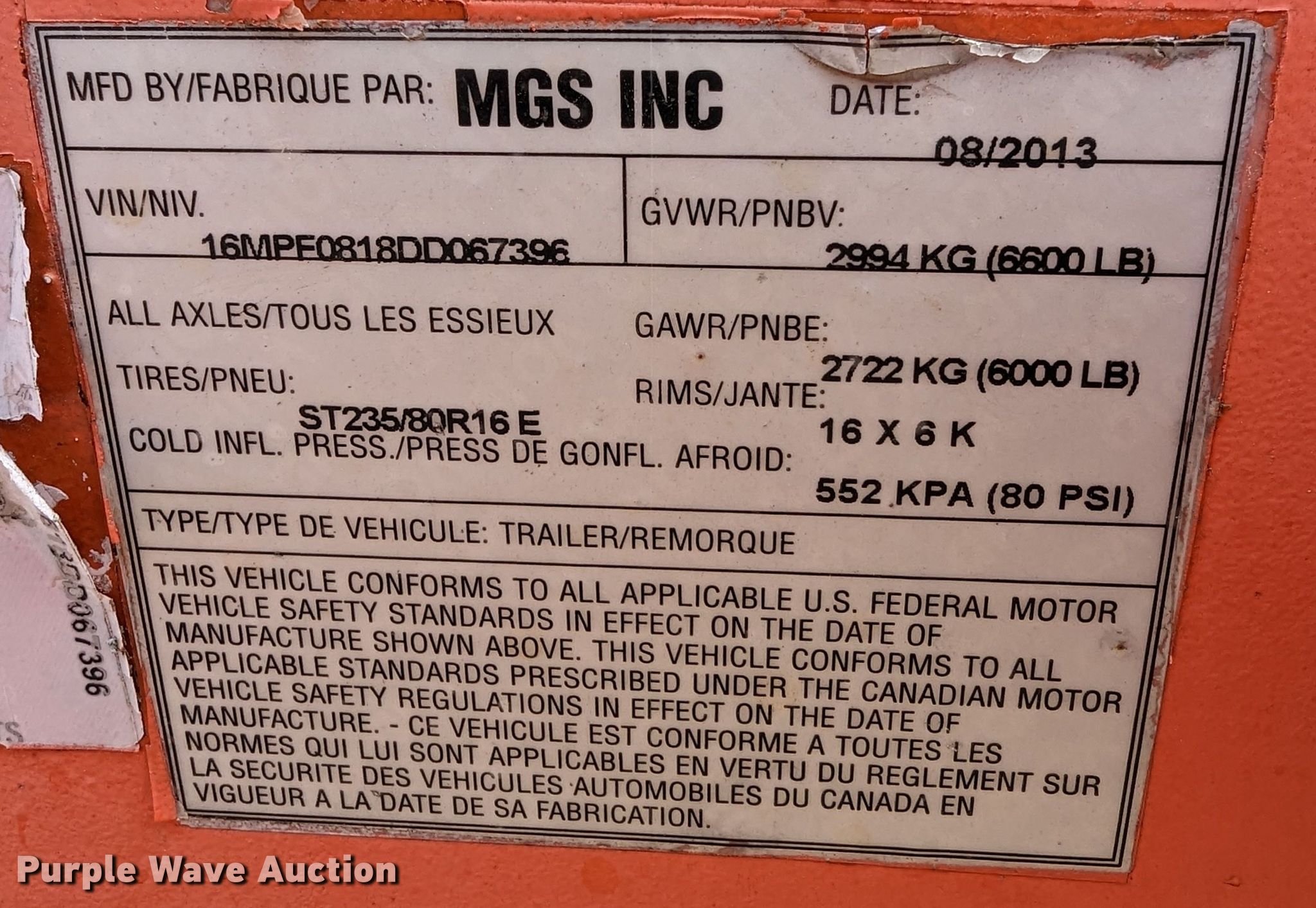 Purple Wave is selling a used Pump in Oklahoma. This item is a 2013 MGS Inc. pump with the following: Hours: 2,382 on meter, VIN: 16MPF0818DD067396
