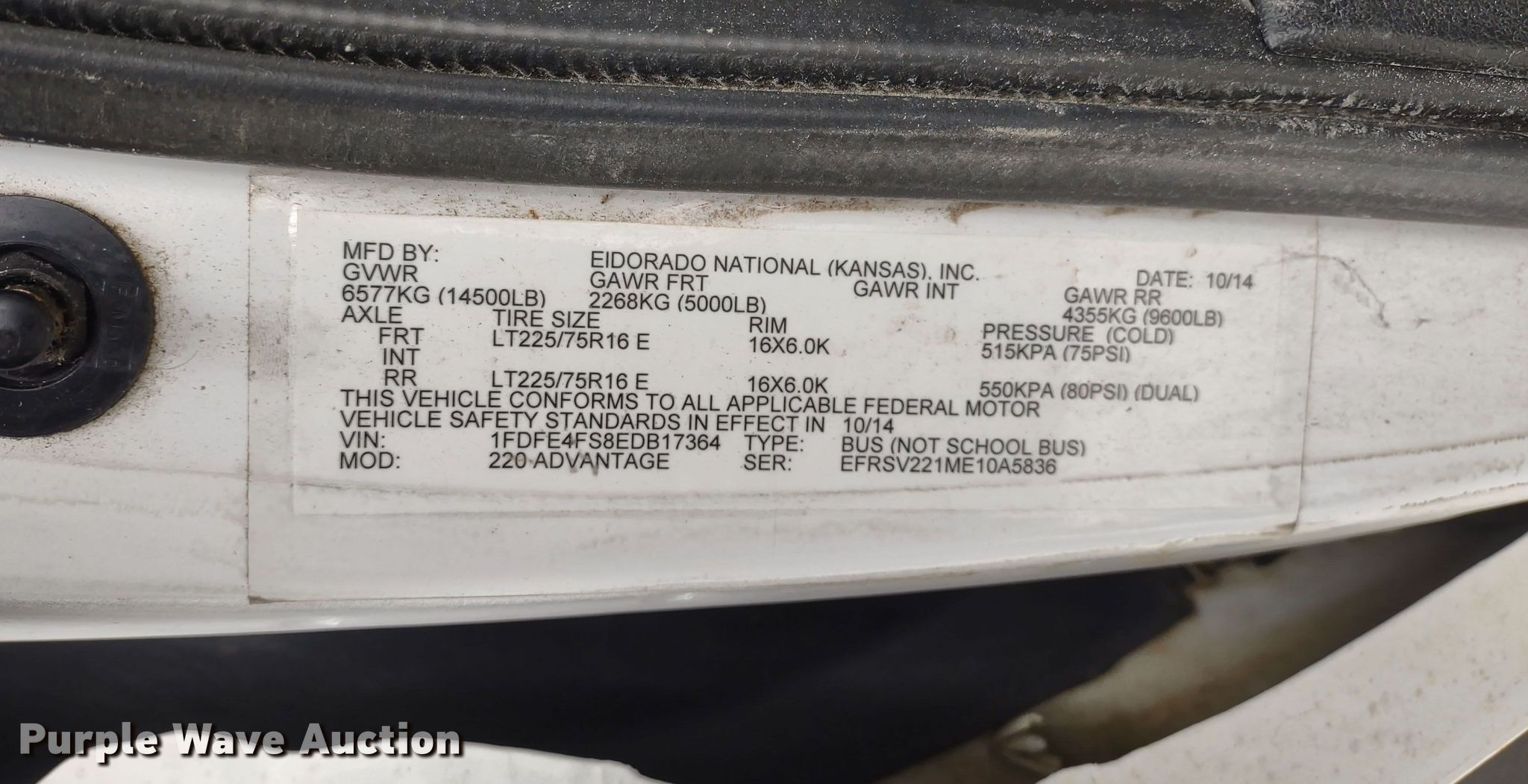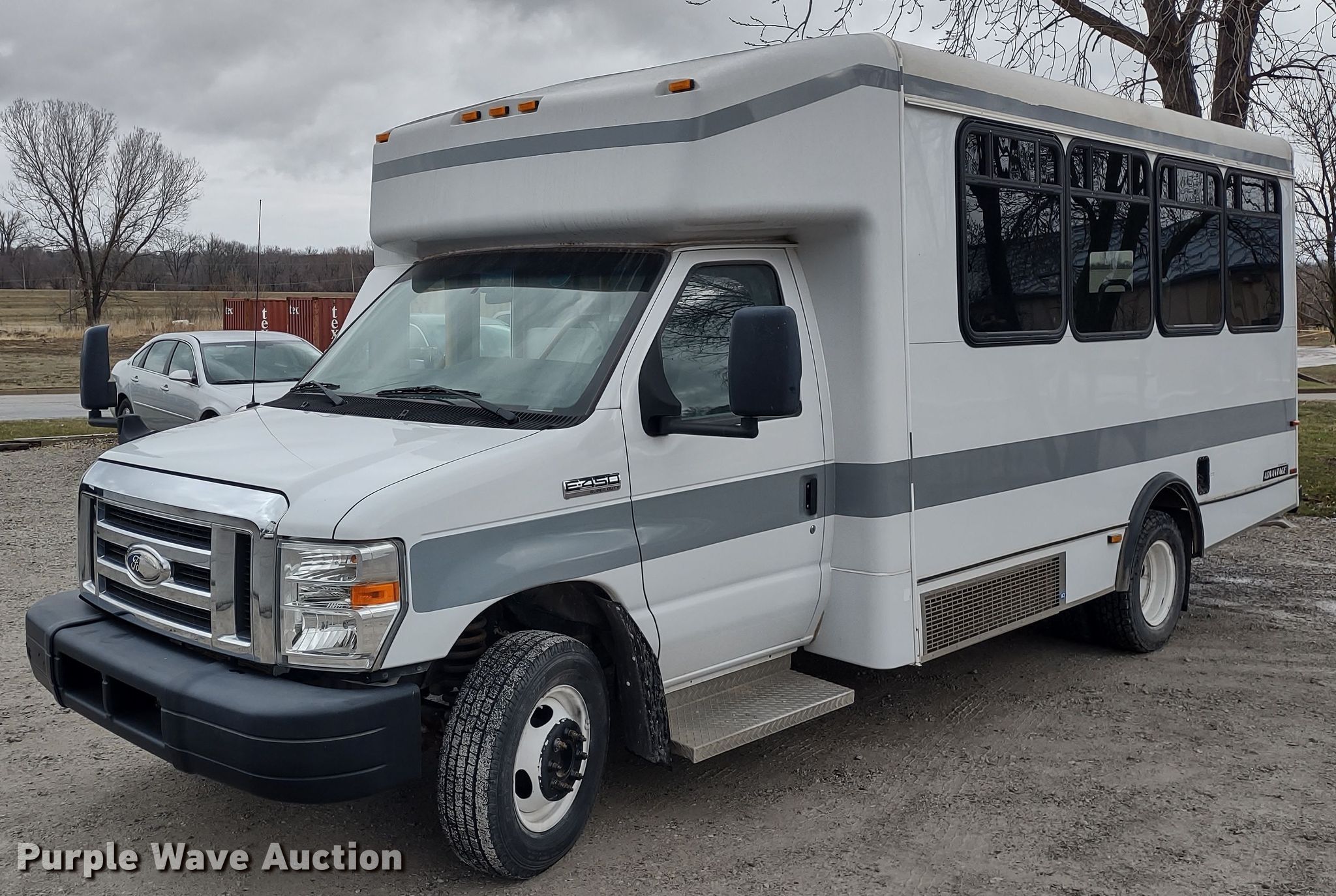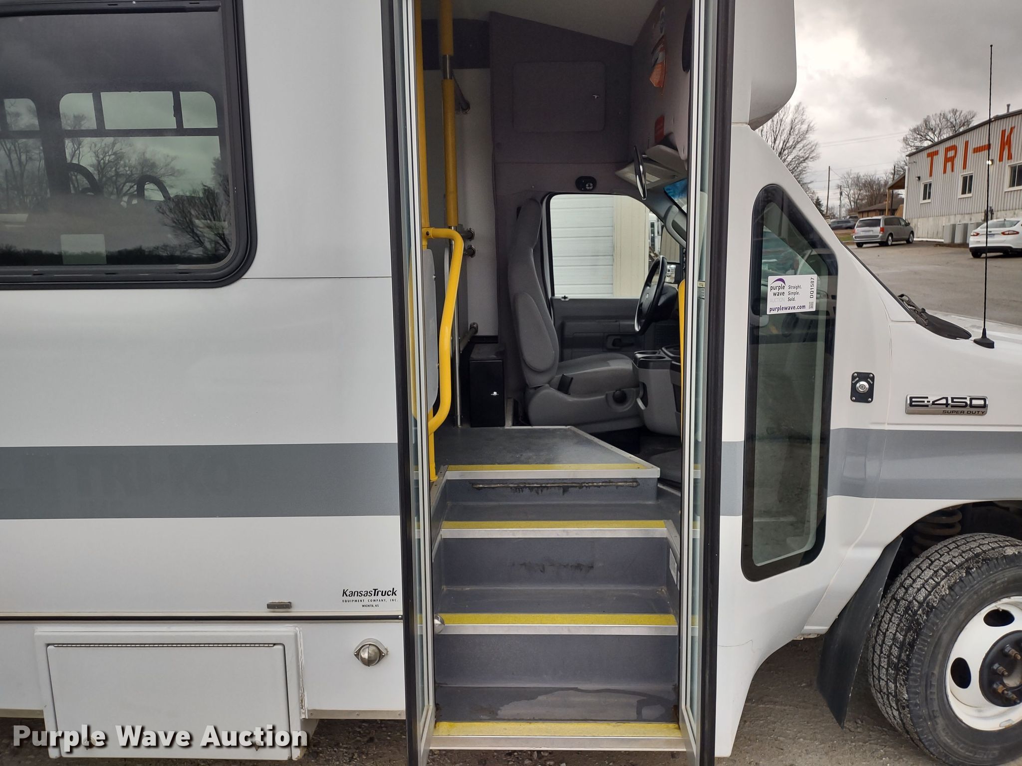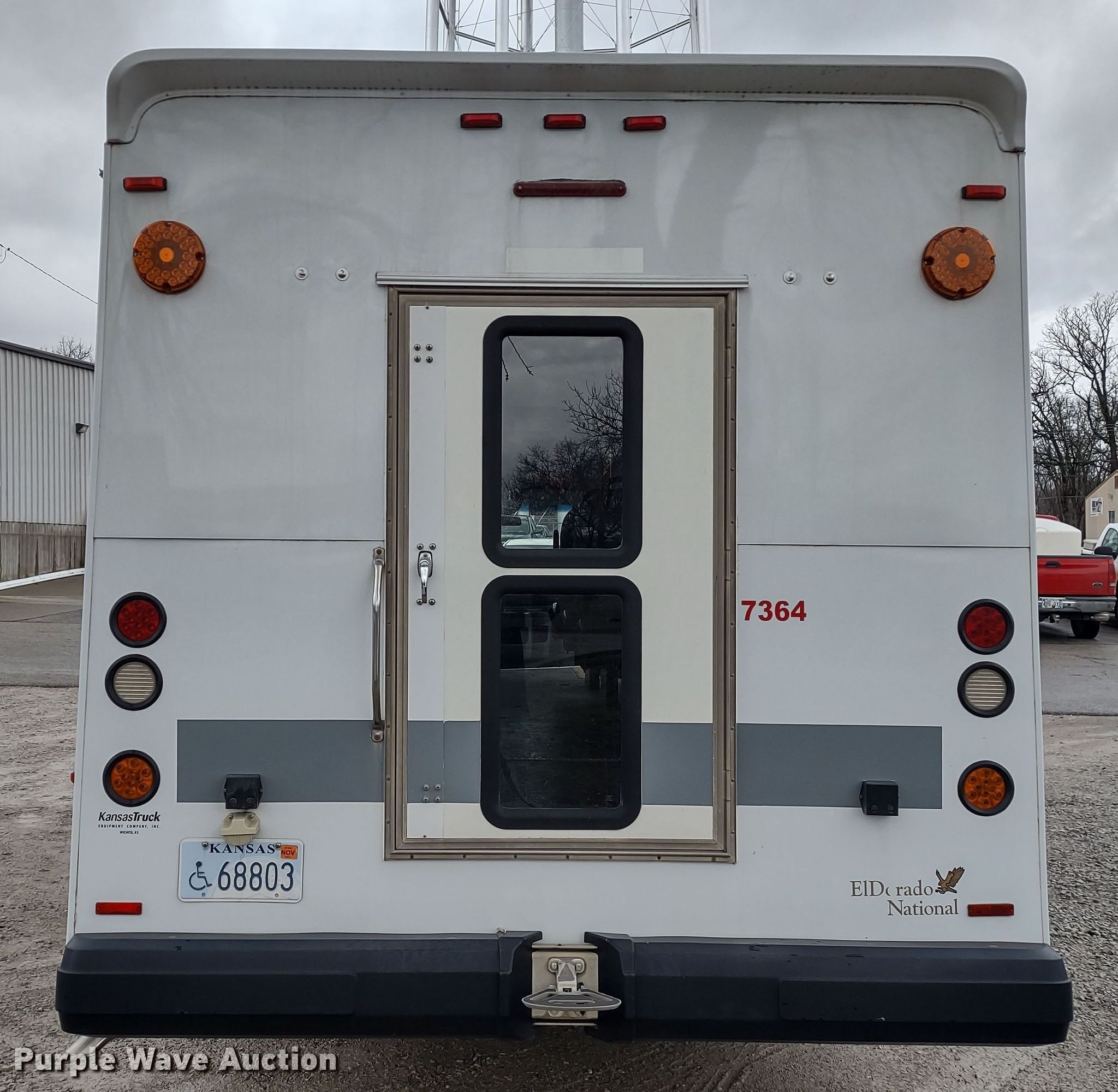 2015 Ford E450 Super Duty El Dorado shuttle bus. Miles: 171,514 on odometer, VIN: 1FDFE4FS8EDB17364. Engine Displacement: 6.8L, Cylinders: 10, Fuel type: Gas. Transmission Automatic. Chassis Axles: Single, Suspension: Spring, Brakes: Hydraulic, GVWR: 14,500 lbs. Interior AC, Heat, Heated mirrors, Cruise control, Auxiliary controls, Electric passenger sliding door, Passengers: 16, Wheelchair lift. Tires Size: 225/75R16. Kansas title. Title distribution may be delayed up to 14 days from verification of funds. Tri-Ko Inc.. 301 1st Street. Osawatomie, KS 66064