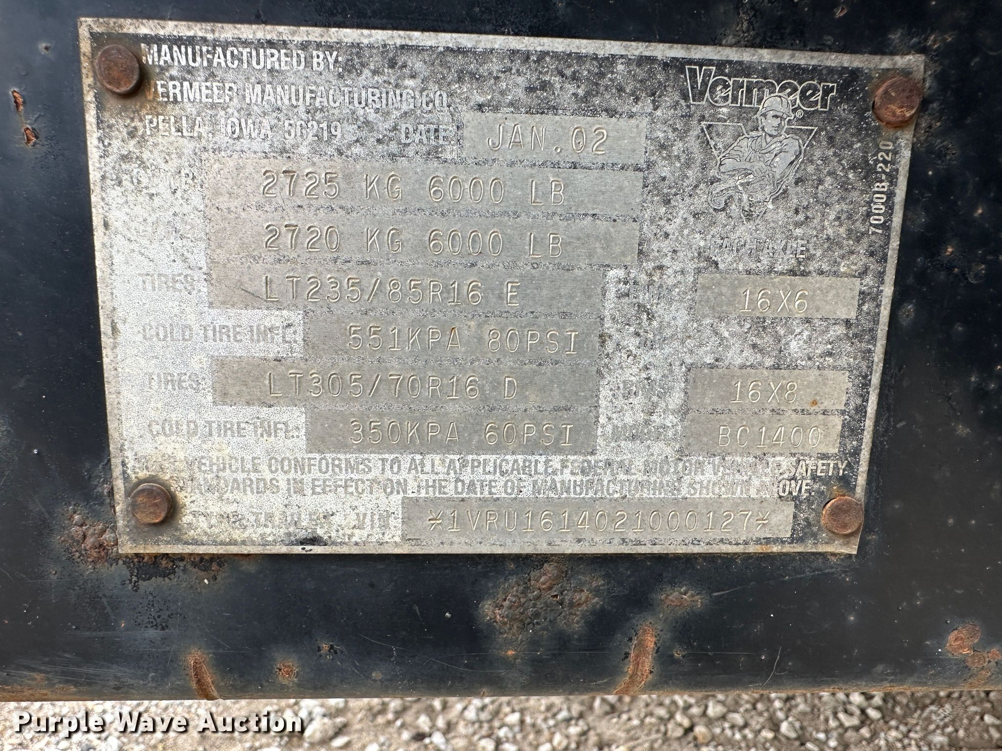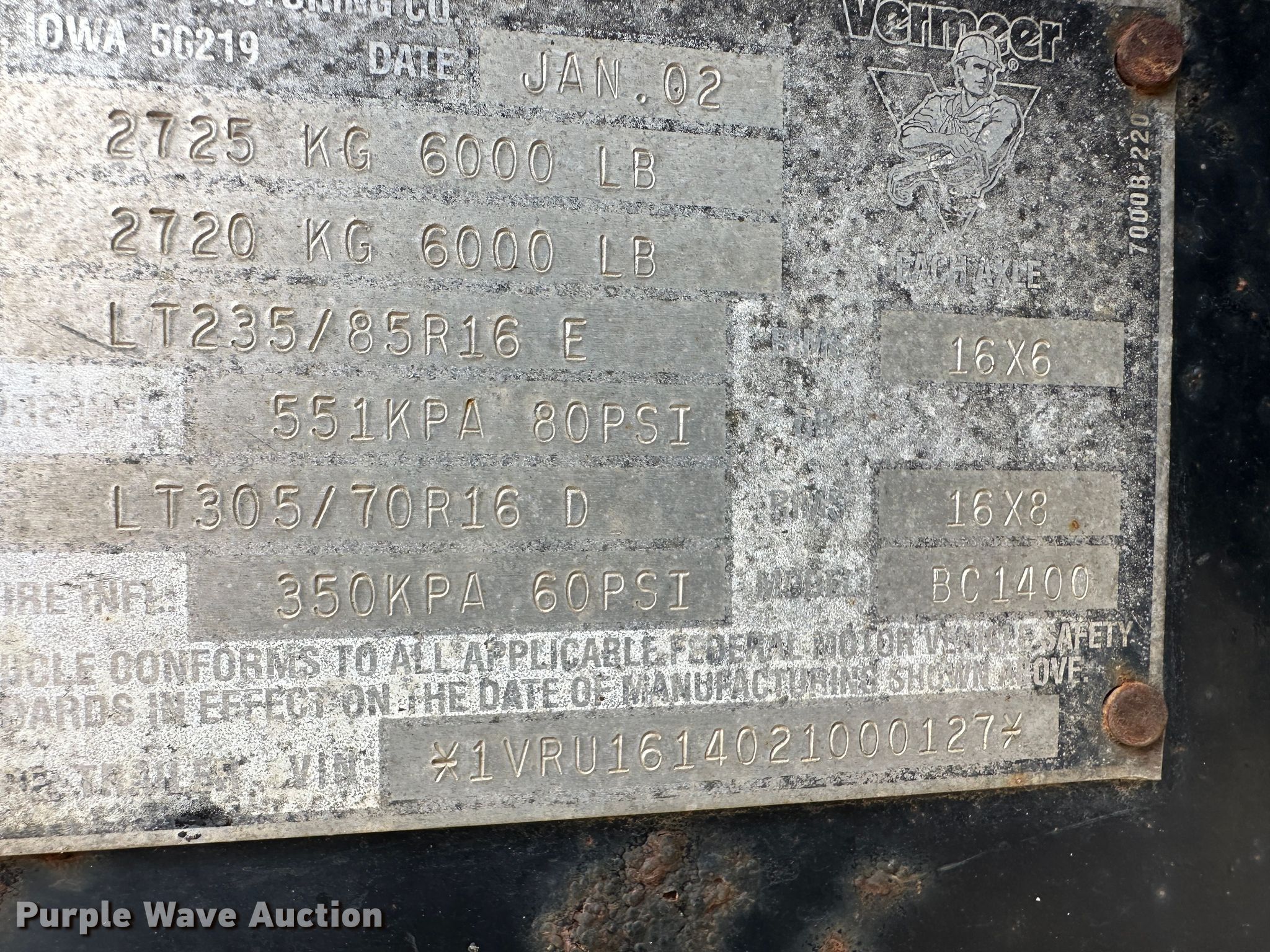 Purple Wave is selling a used Wood Chipper or Stump Grinder in Kansas. This item is a 2002 Vermeer BC1400 wood chipper with the following: Hours: 1,185 on meter, VIN: 1VRU1614021000127