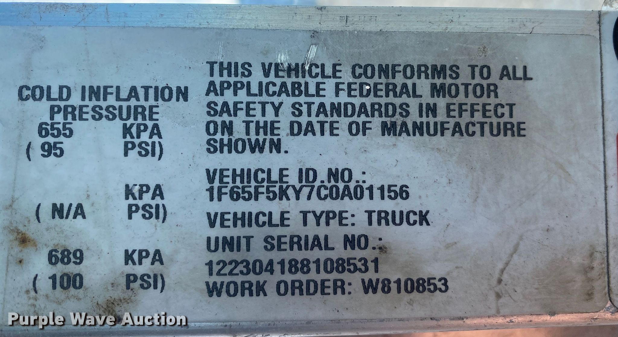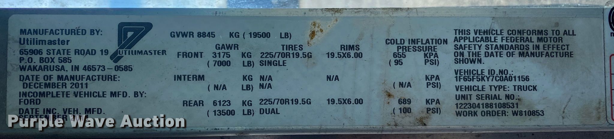 2012 Ford F59 delivery van. Miles: 446,250 on odometer, VIN: 1F65F5KY7C0A01156. Engine Displacement: 6.8L, Cylinders: 10, Fuel type: Gas. Transmission Automatic. Chassis Axles: Single, Suspension: Spring, Brakes: Hydraulic, GVWR: 19,500 lbs. Interior AC, Heat, Cruise control. Features Box bed 14' L x 86" W x 82" H, Floor: Aluminum, End gate lift Thieman 1VL20A, Capacity: 2,000 lbs.. Tires Size: 225/70R19.5. Notes Dash warning indicator: Check engine. Oklahoma title. Title distribution may be delayed up to 14 days from verification of funds. 15107 North 137th East Avenue. Collinsville, OK 74021